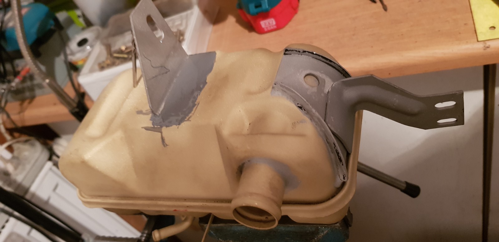 Lower bracket was missing, so new one was made from stainless steel, glued on with high tempertature resistant adhesive for metal & painted with low temperature powder paint (backed in ca. 130-140C), so was no solder melting.