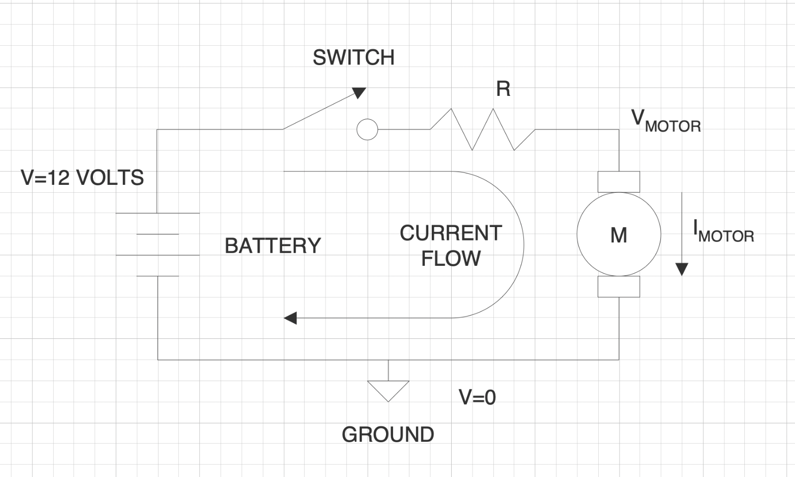 * For those who may not understand the mechanism: As current flows across a resistance, the voltage across the resistance drops. Here isa simple circuit called a voltage divider. I have drawn this as a battery, a switch, a resistance and a motor. Consider the resistance to represent all of the resistances in the chain from the battery to the motor (switch losses, wire losses, connector losses, fuse losses, etc). Since all of these are in series, we can just bundle them all together, and then assume a perfect battery and a perfect switch.