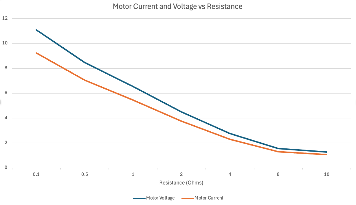 So, you can see that even small amounts of resistance in the circuit will cause the voltage at the motor to drop significantly, and this causes the current through the motor to drop, reducing the power and torque of the motor. If we assume that torque is proportional ti current, then 0.5 ohms of resistance in the wires, fuse, and switch will cause the current (and this the motor torque) to drop by 30%. If the resistance is 1 Ohm then the current and torque will drop by nearly 50%...