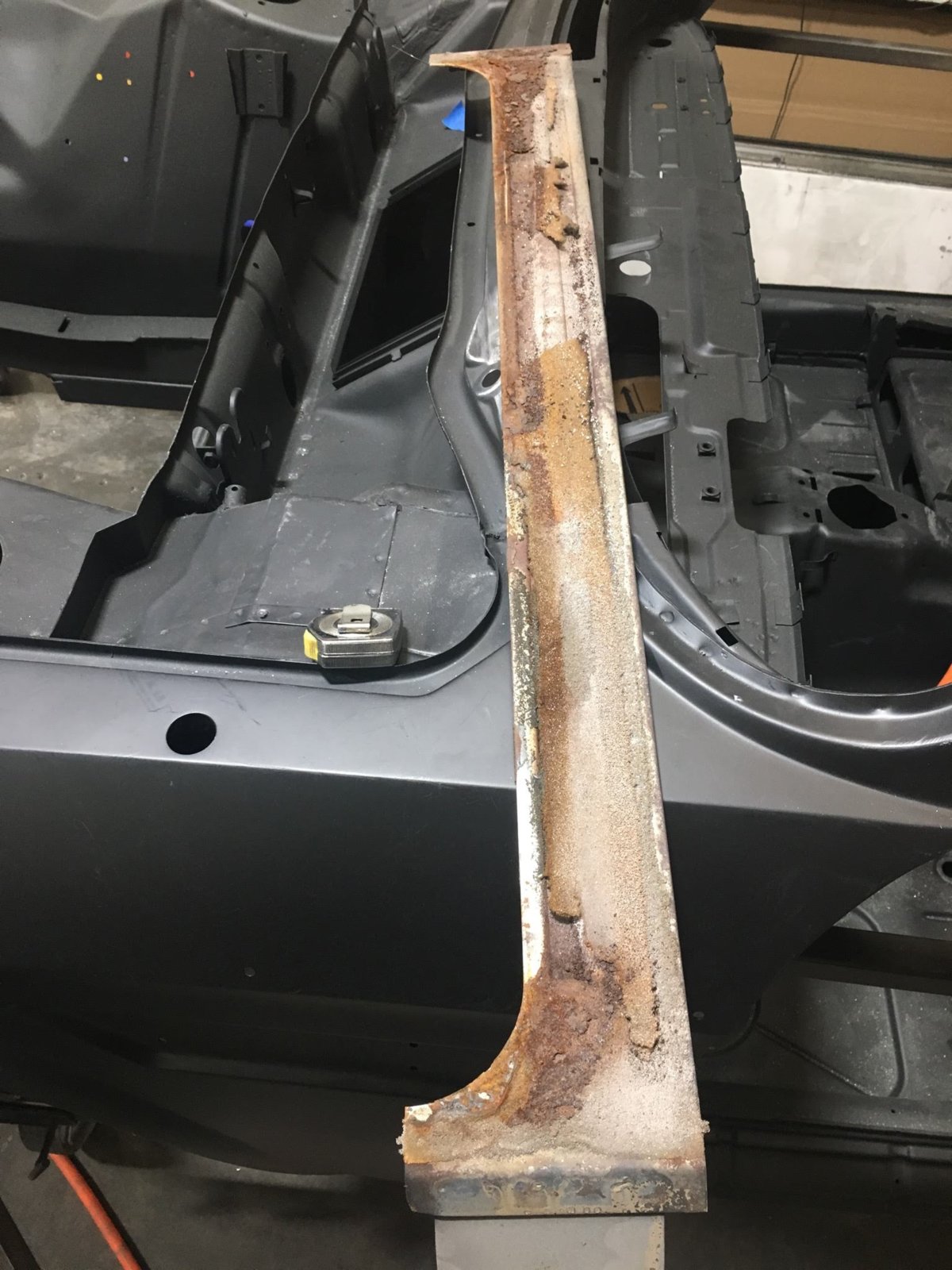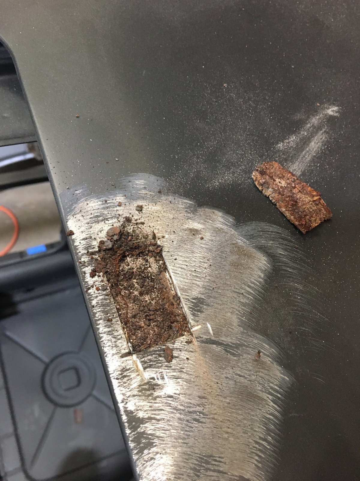 After media blast with "dirty 30" grit. I had patched the right rear floor before giving in to professional help. I had also cut out part of the right front floor and opened up the rear rocker corners. Obviously, the spare wheel well was toast, but that just made the decision to go electric that much easier. Other than that, it really wasn't too bad.