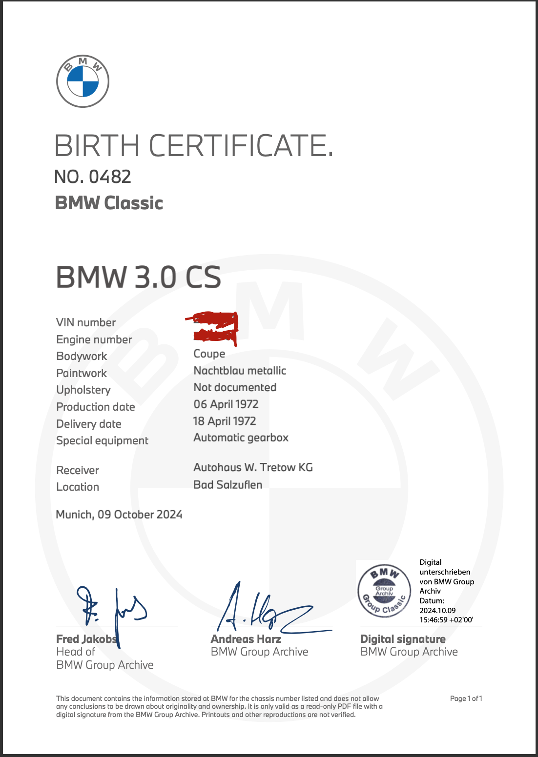 I sent an email to [email protected] requesting a certificate of authenticity for my 1972 and 1974 Coupes. I had made requests over the years but had always been put off till later for one reason or another. This time I was sent an Order Form Birth Certificate to fill out in German or English, a link to the process and a price of 150 Euros each for the documents. I started buying new BMWs in 1968 and have consistently bought new ones until the early 2000s. It looks like their policies for loyal customers have gone the way of their cars, deplorable. I'm planning on selling my 1972 Sahara Restomod and thought this certificate would be useful in my listing with BaT but upon further thought it just made me mad and another reason to not buy a new BMW. If anyone has bitten the bullet on buying in to the Birth Certificate it would be interesting to see an example and whether or not there are copious quantities of Gold Guilding.