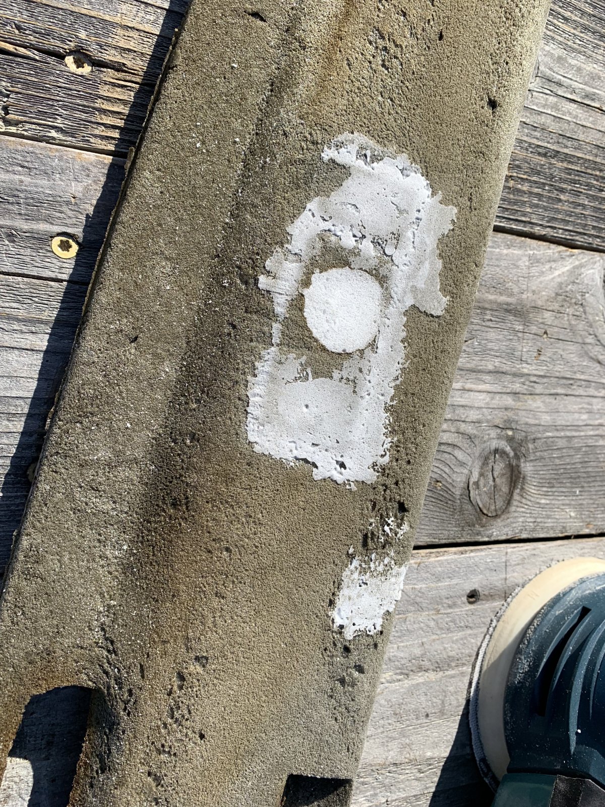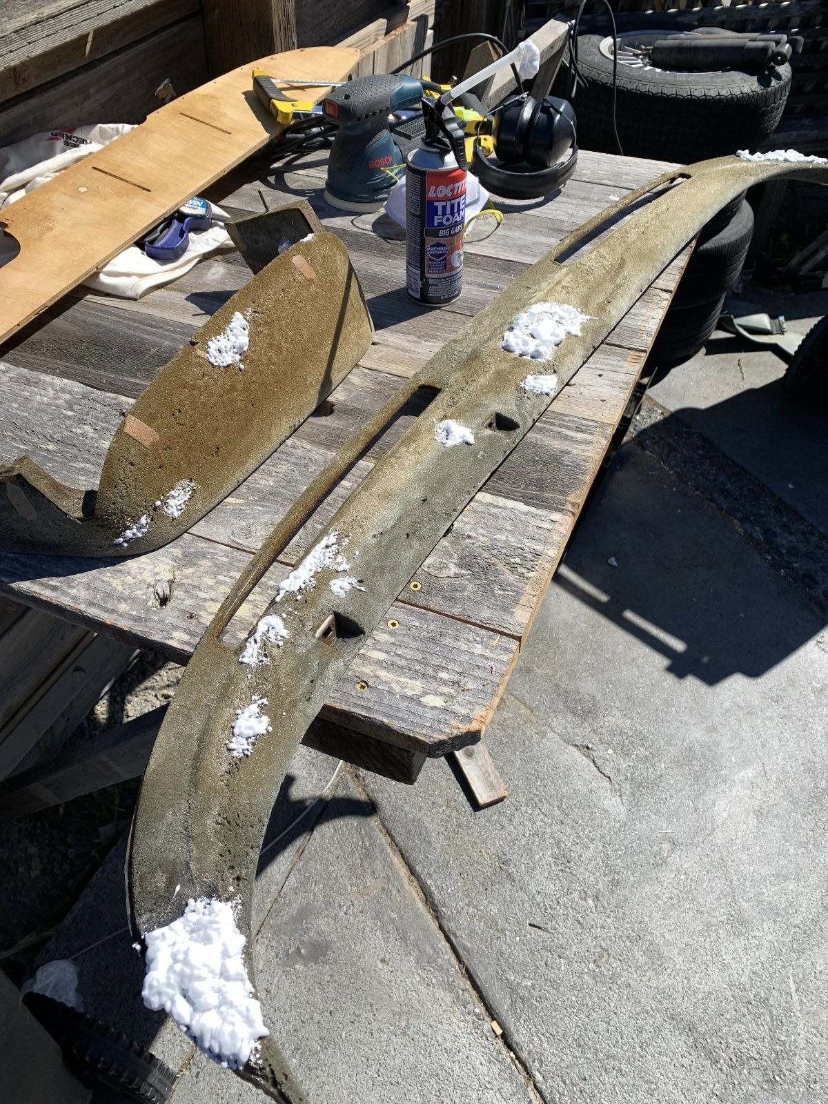 First step was to remove the old vinyl. As it turns out it’s not really vinyl but some sort of plastic that was formed around the foam. Using a heat gun and some scrapers it was not too difficult of a job. Once I had the foam laid bare, I filled the holes from the fasten seatbelt sign as well as several other areas where the original foam had not completely filled the space. I tested several different options and finally chose Loctite Tite Foam for having the closest cell structure and density to the original. It is also exterior rated and uv resistant. Then shaped it with a random orbital sander.