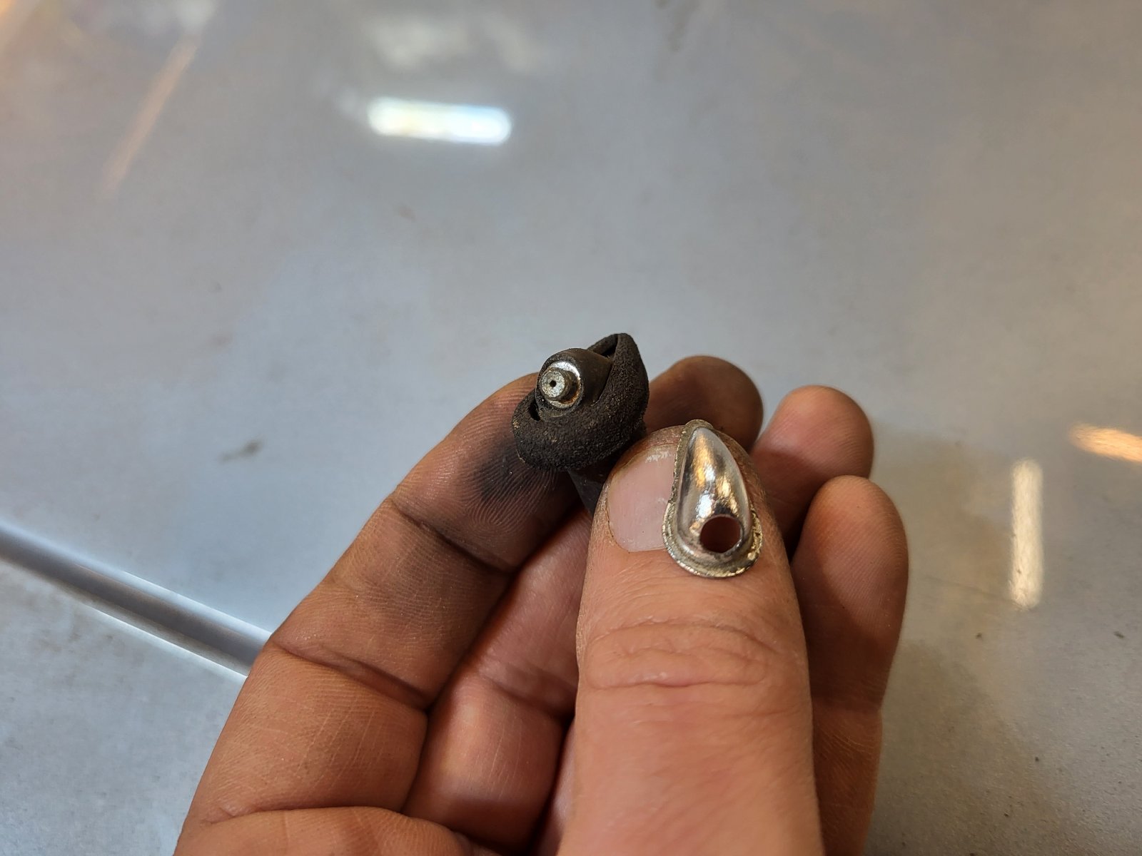 At the top is a metal cap that can be pried off; it retains a small metal ball that is the actual jet opening. It's ball shape allows it to rotate inside the rubber part that fits snugly around it.