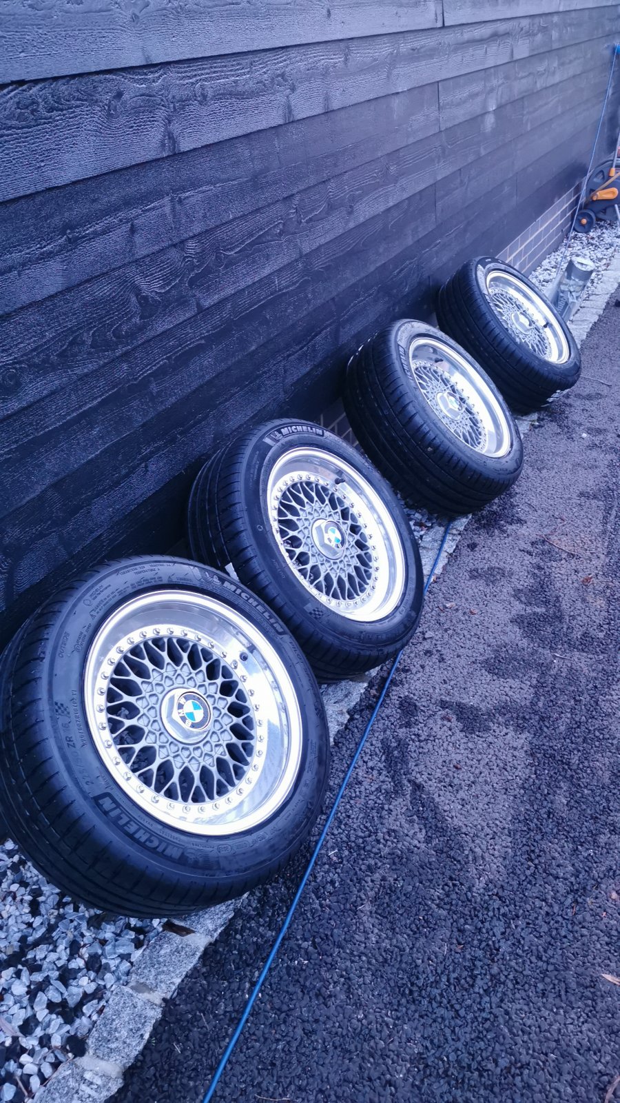 205 55 and 225 50 16 Michelin pilot sport 4s. Wheels are 1986 date stamped and really look the part on the car
