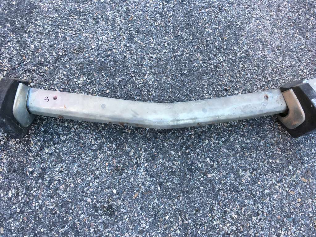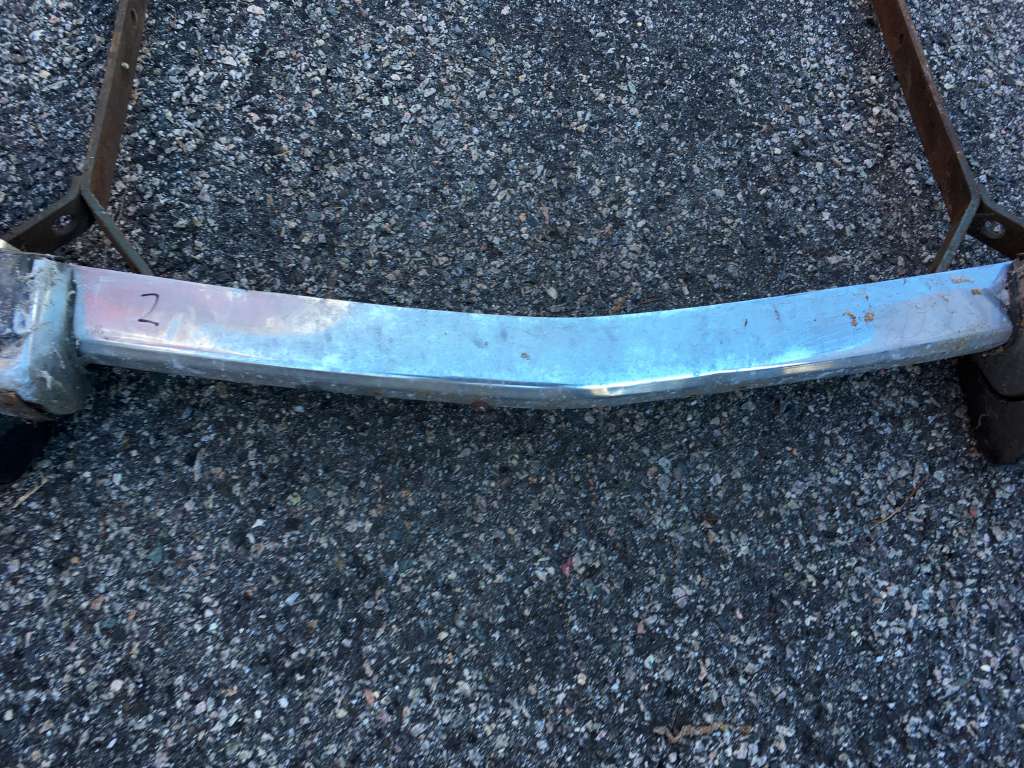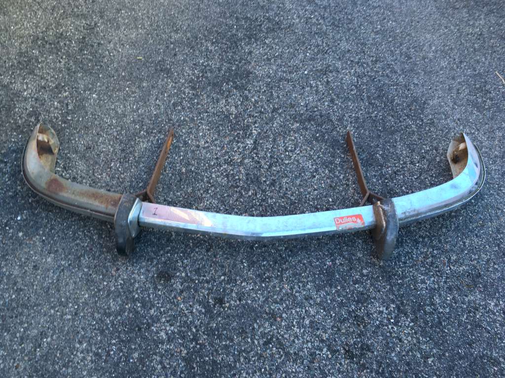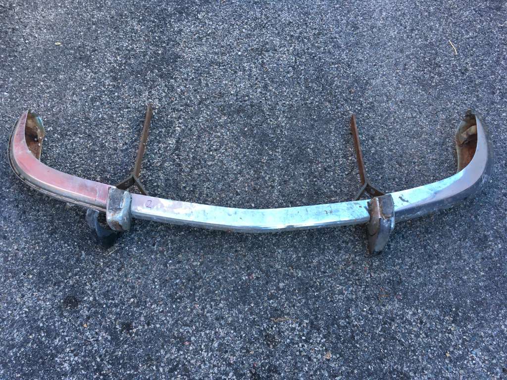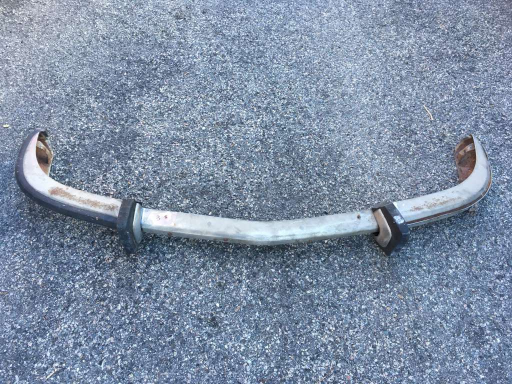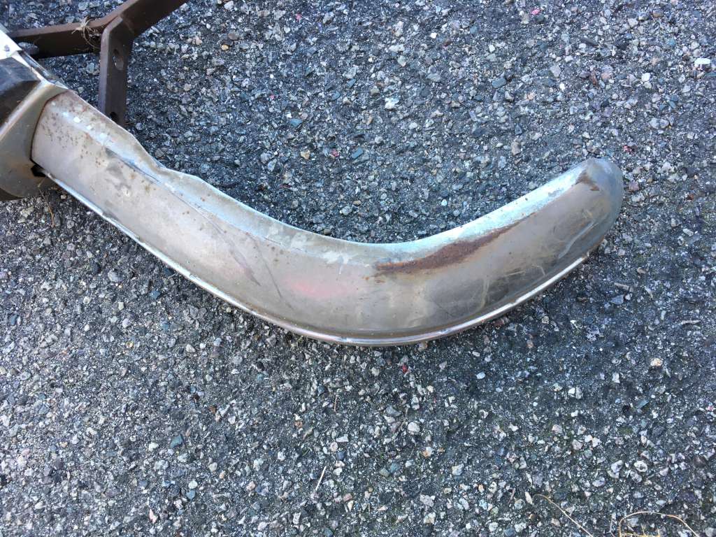 Bumper #3: Dull finish but no dents, missing the left rubber strip, has holes in the center section for driving lights, 1972-style bumperettes look intact with some rubber cracking on the bottom of one, a lot of corrosion on the inside, no brackets.