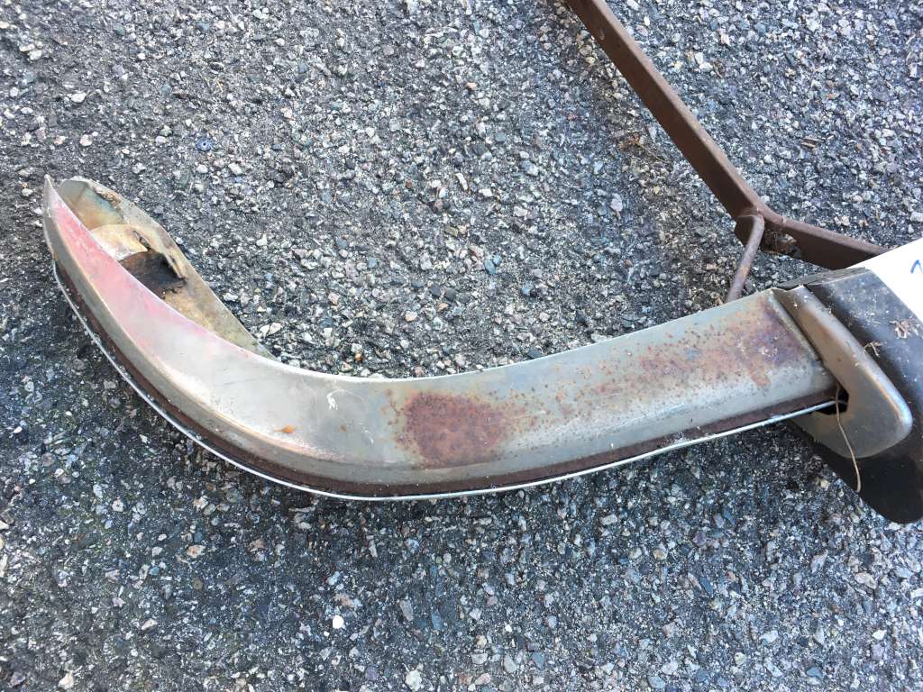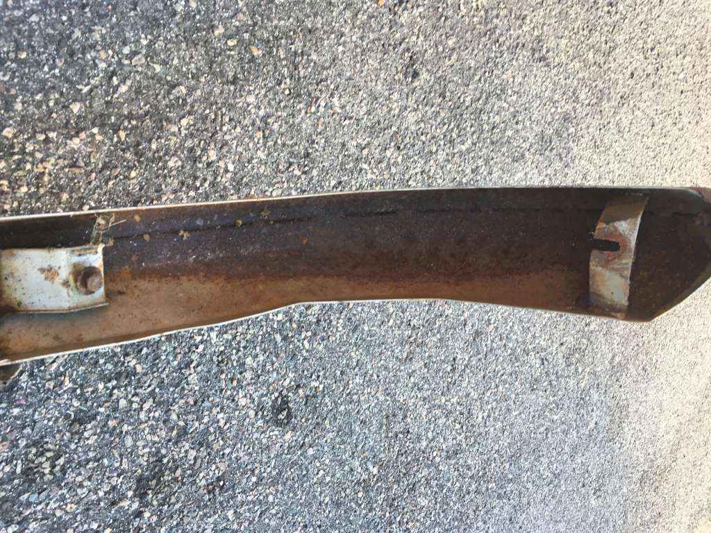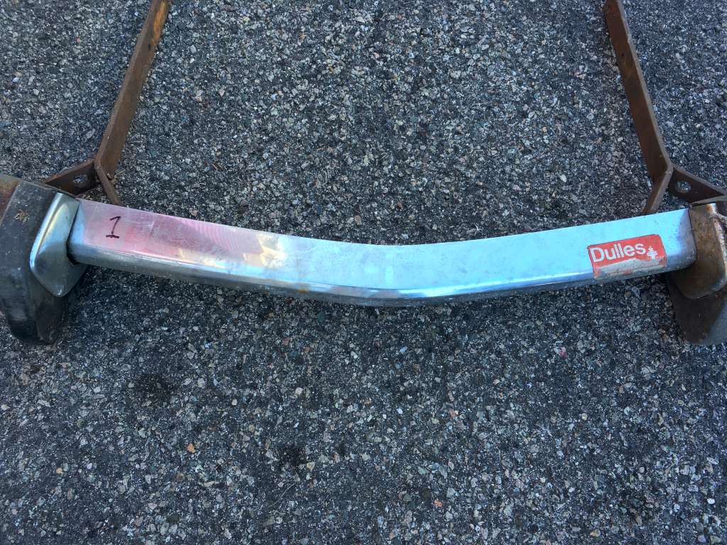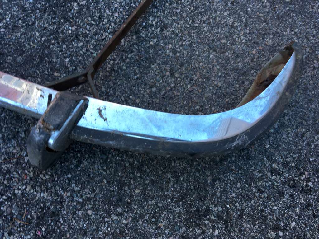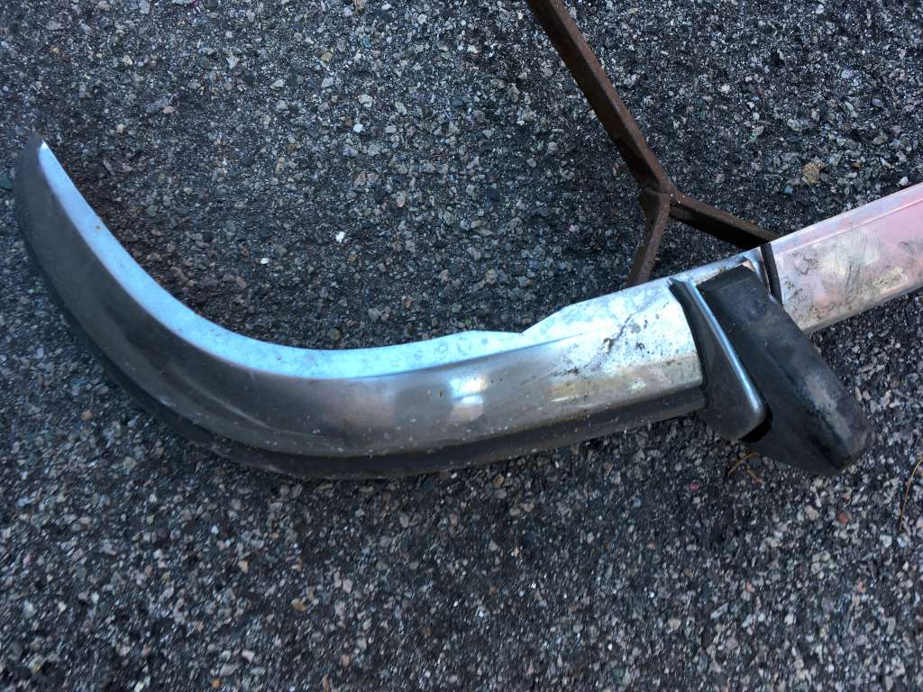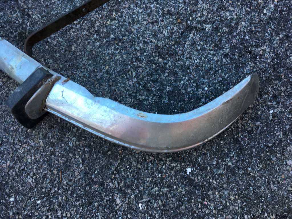 Bumper #4: Some light corrosion, no rubber strips, dents on the left section and the underside of the center section, 1972-style bumperettes look intact, looks like one of the L-shaped mounting brackets is wrong.