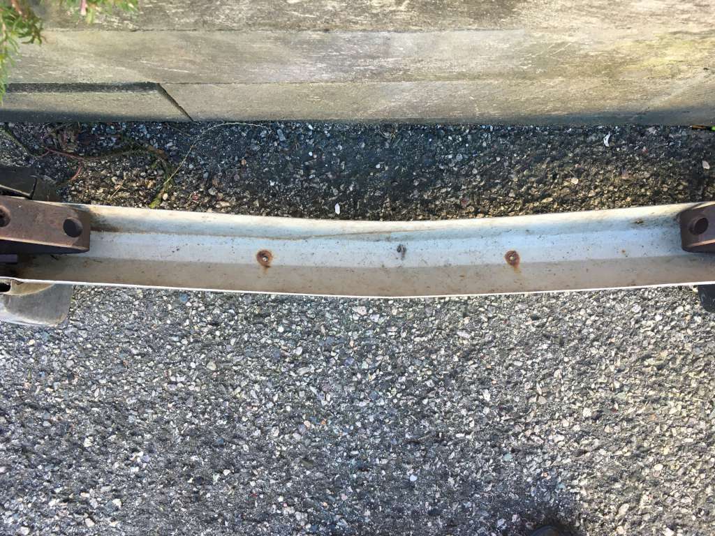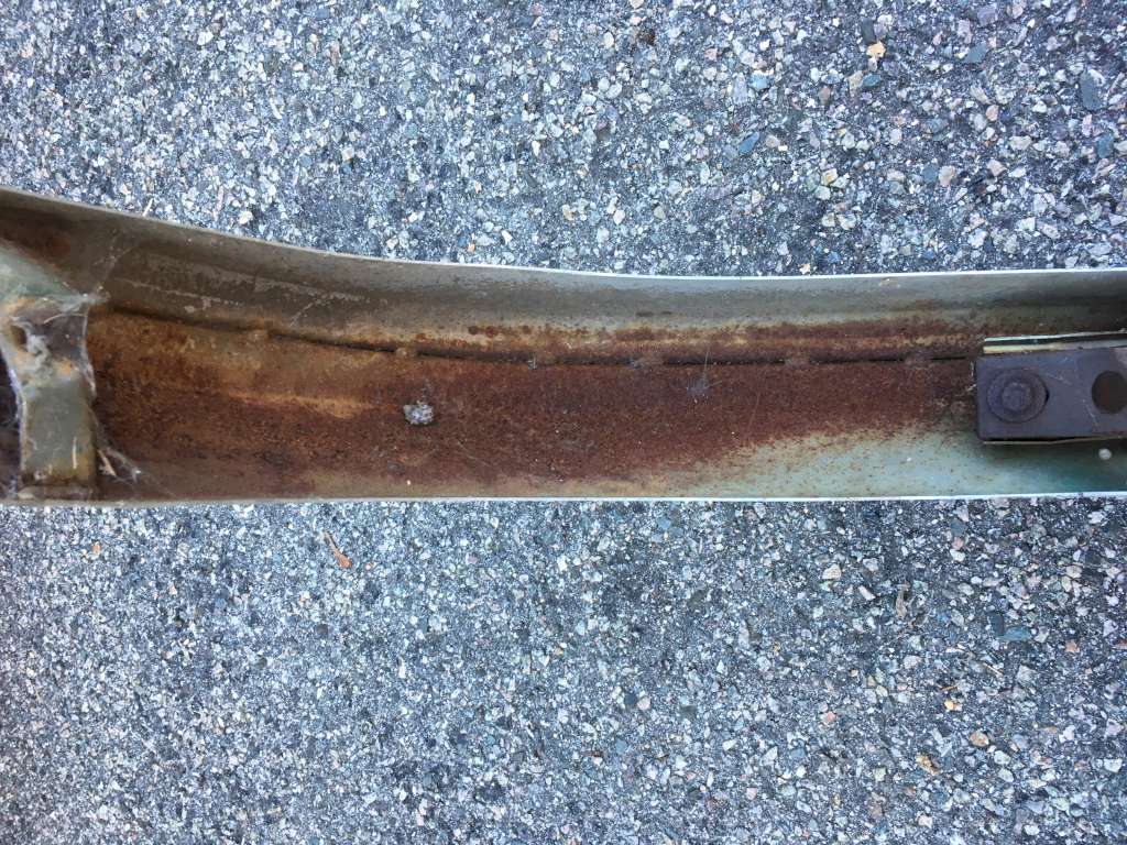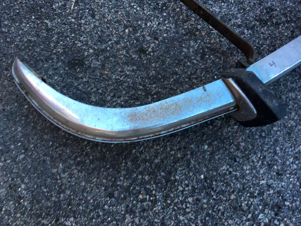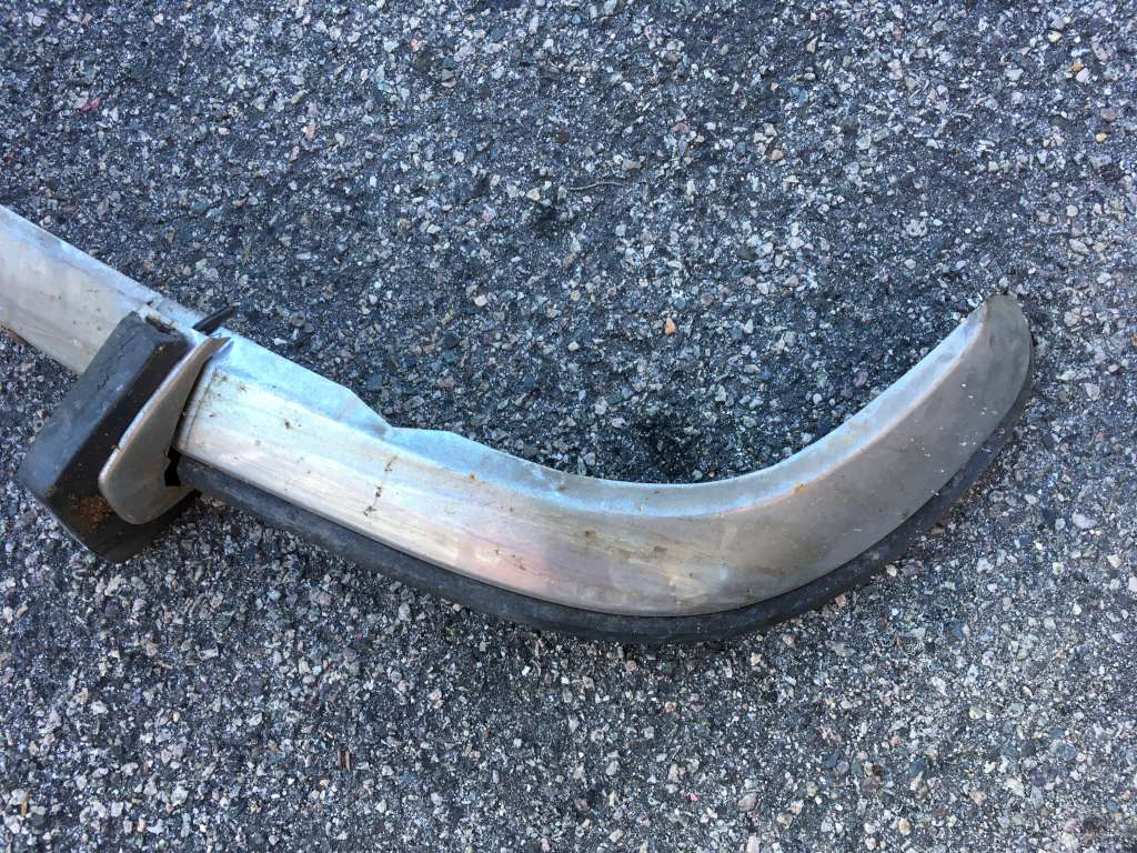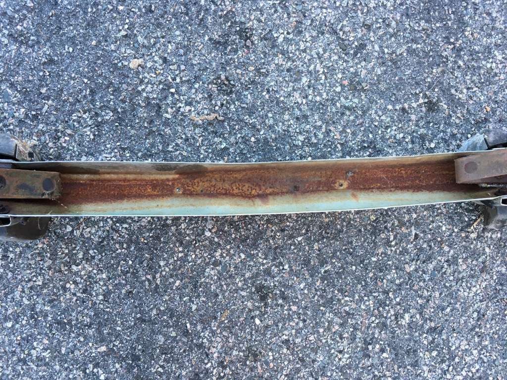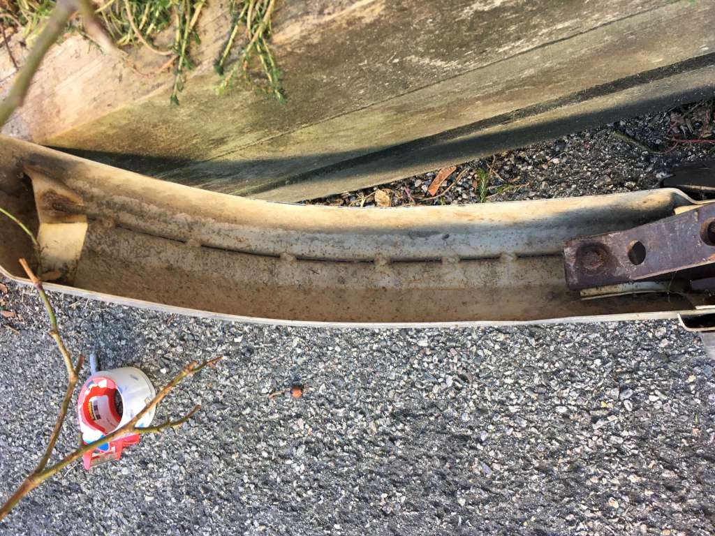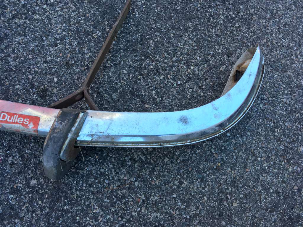 Bumper #4: Some light corrosion, no rubber strips, dents on the left section and the underside of the center section, 1972-style bumperettes look intact, looks like one of the L-shaped mounting brackets is wrong.