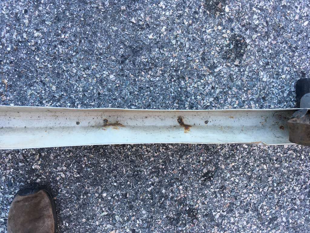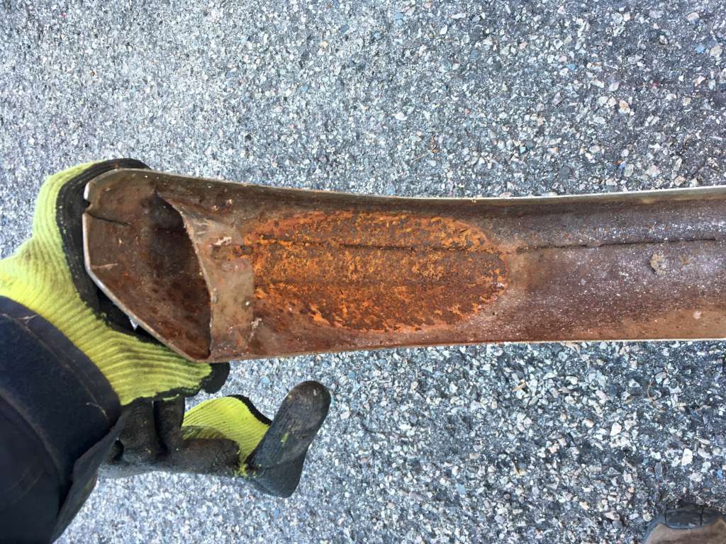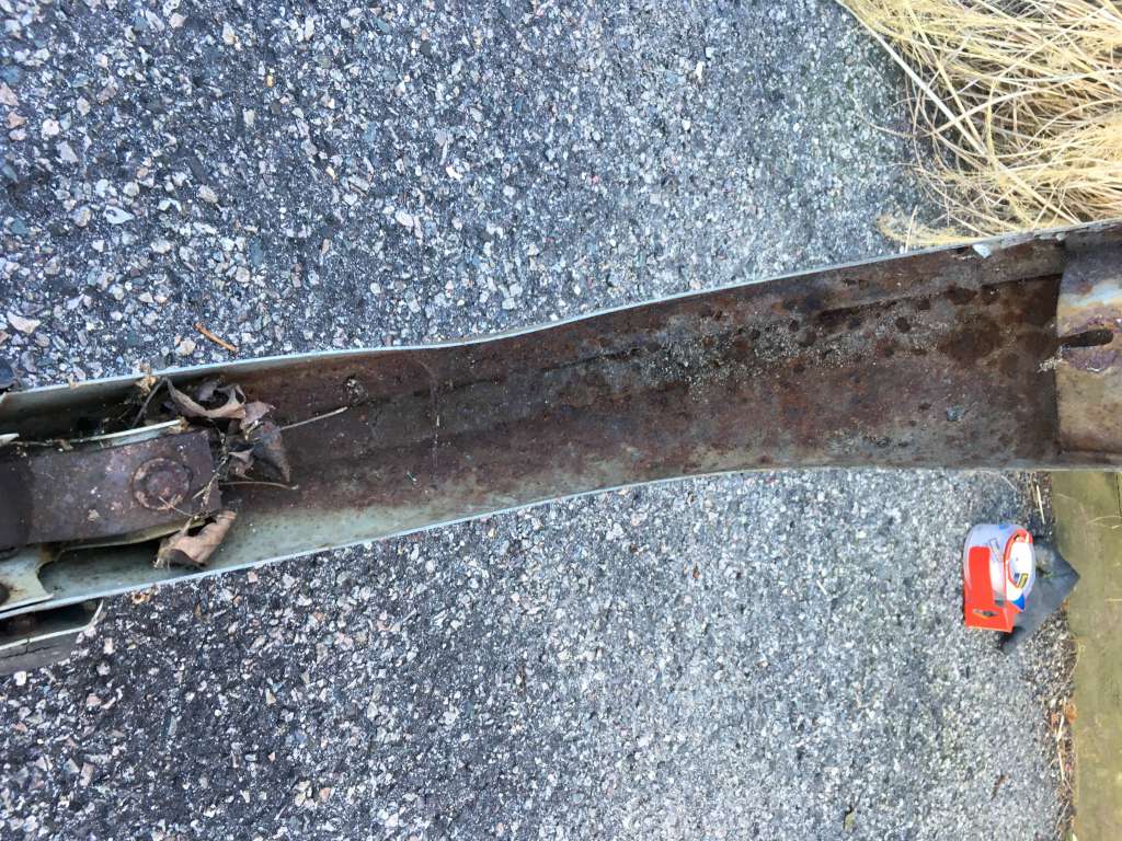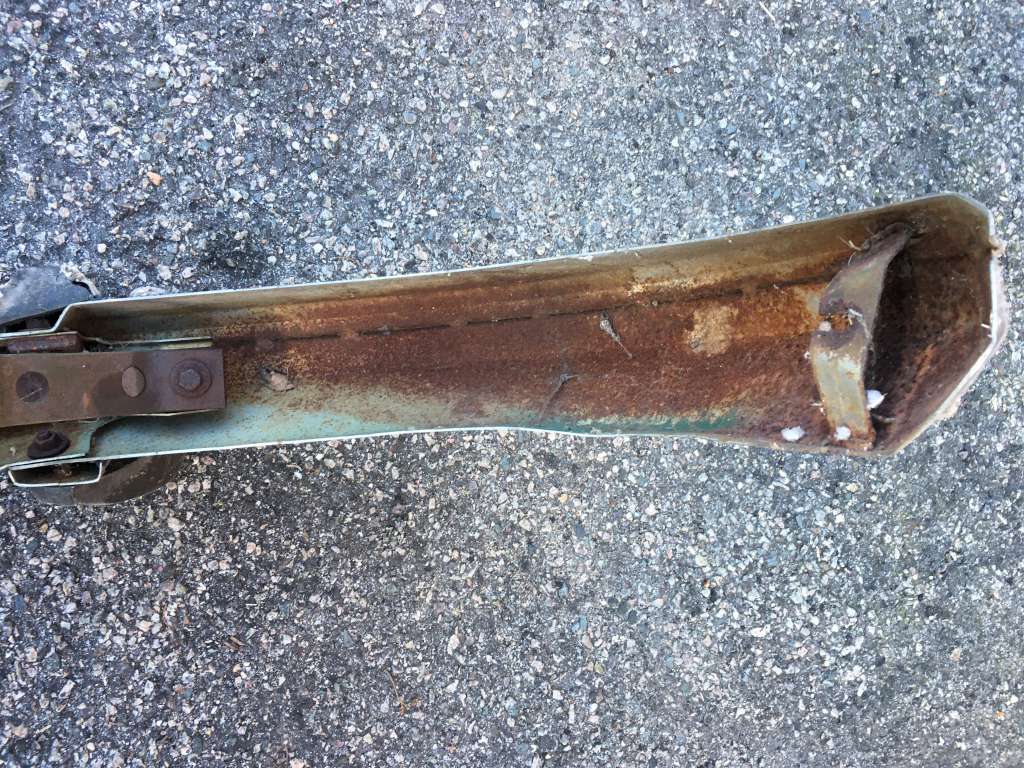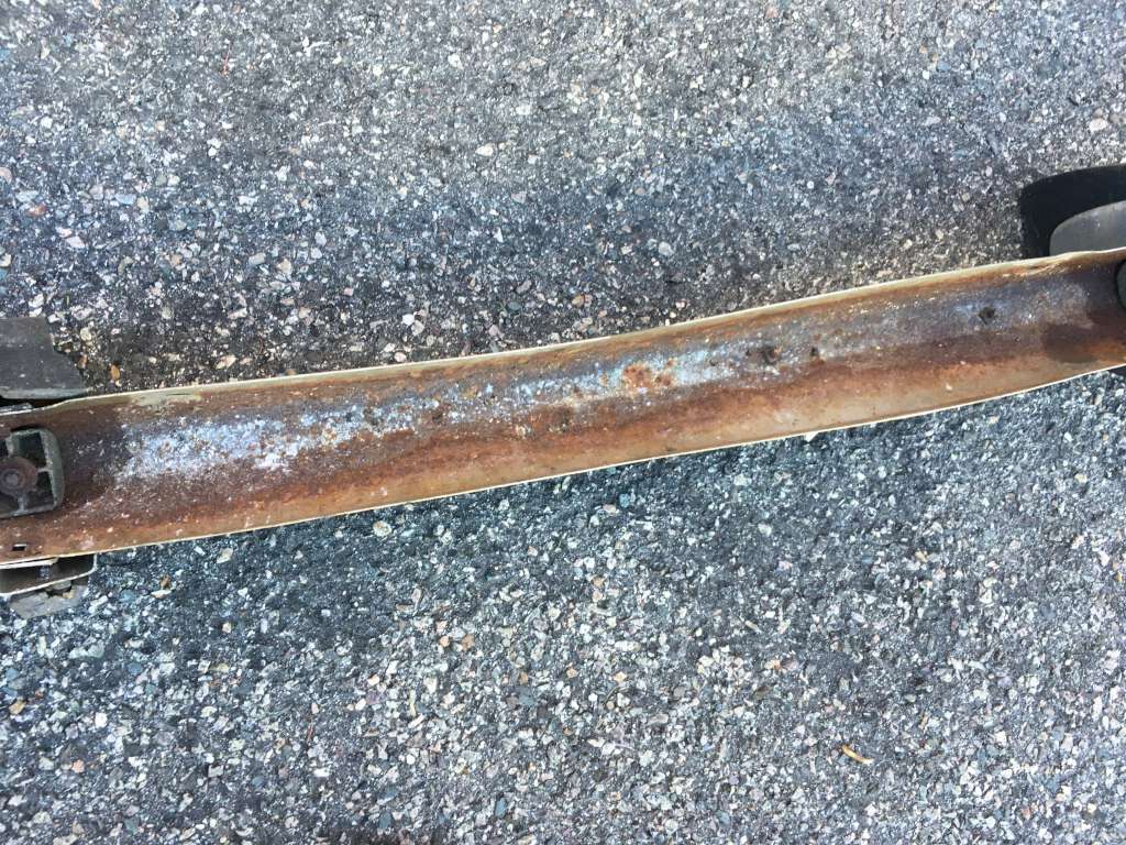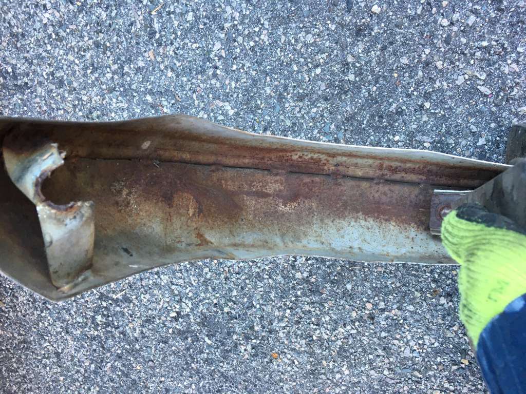 Bumper #4: Some light corrosion, no rubber strips, dents on the left section and the underside of the center section, 1972-style bumperettes look intact, looks like one of the L-shaped mounting brackets is wrong.