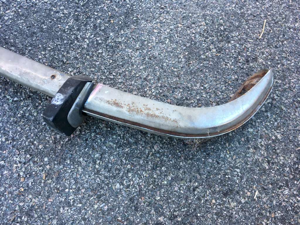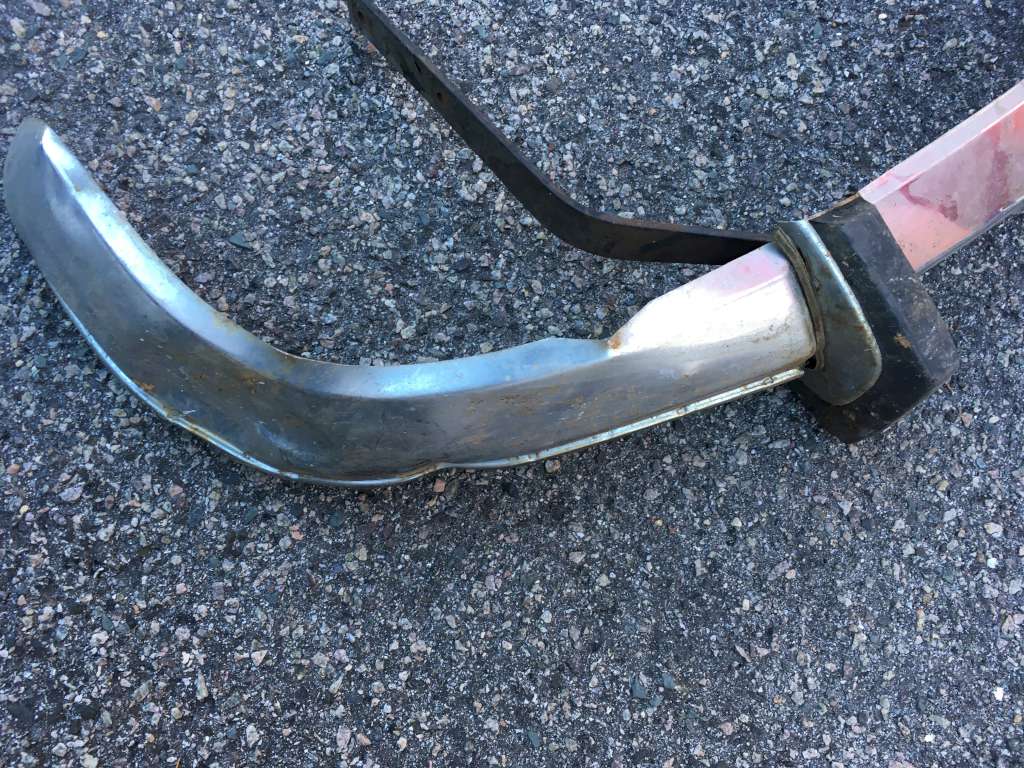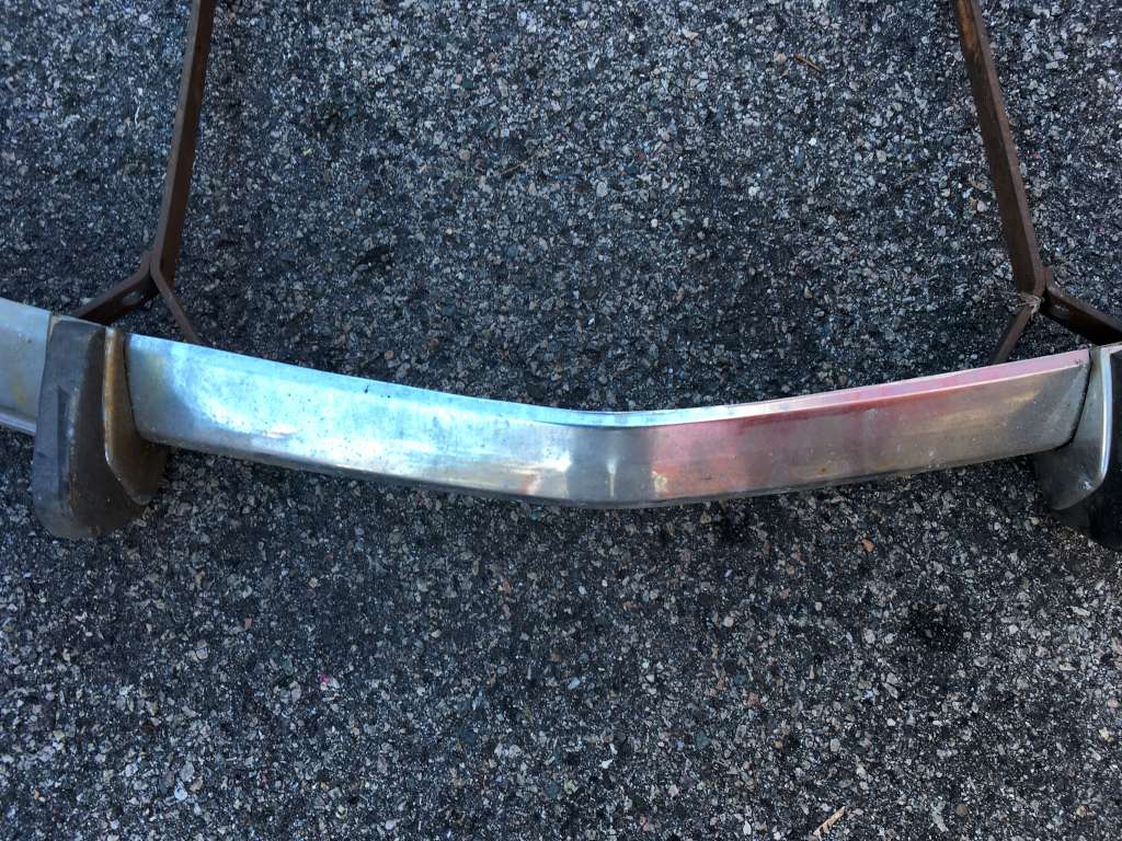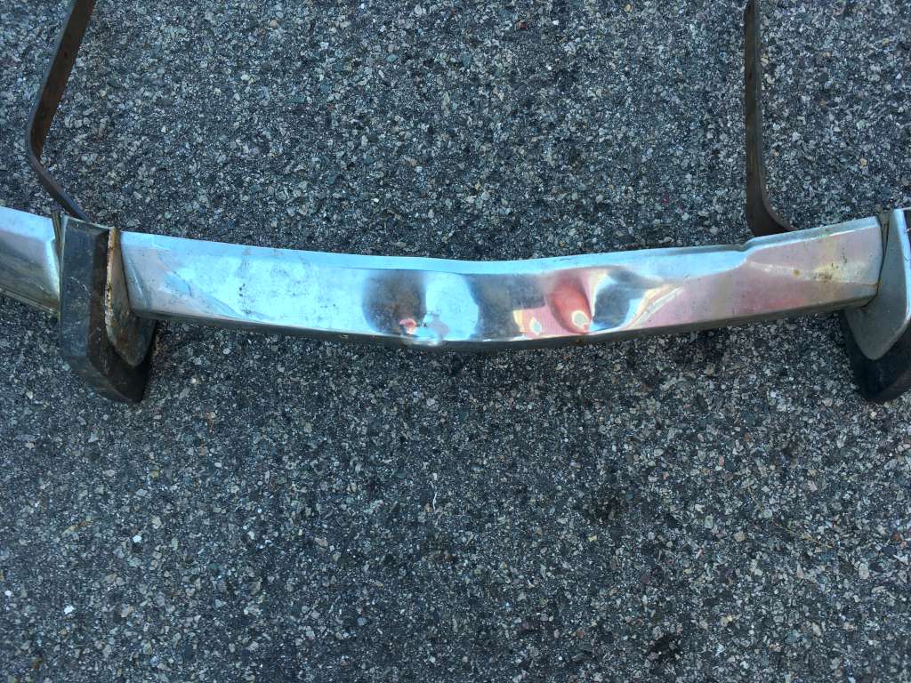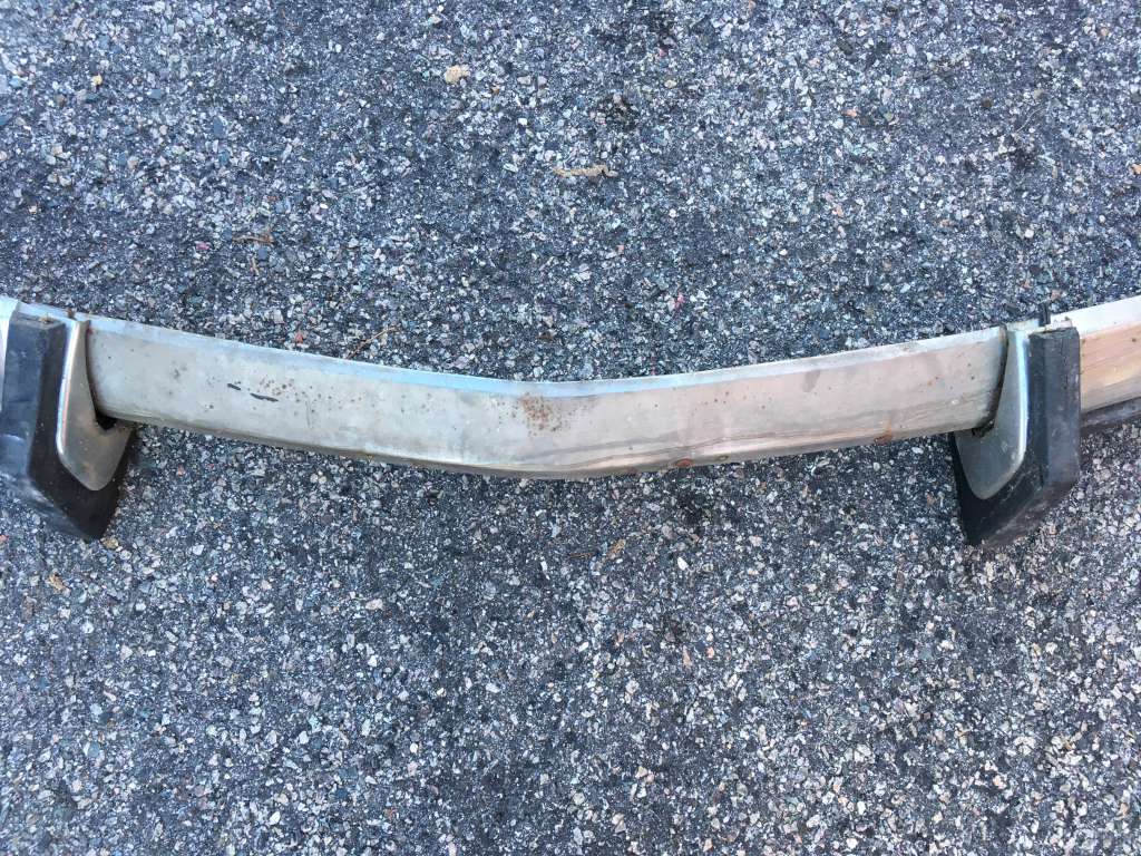 Bumper #2: Probably the best one, fairly shiny chrome, one very small dent underneath the right section, missing the right rubber strip, rubber on the 1973-style bumperettes are detached, some corrosion on the inside, triangular brackets.