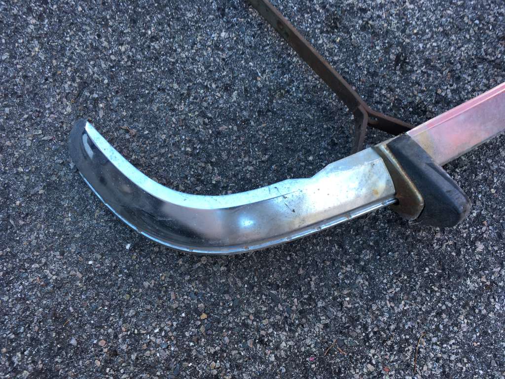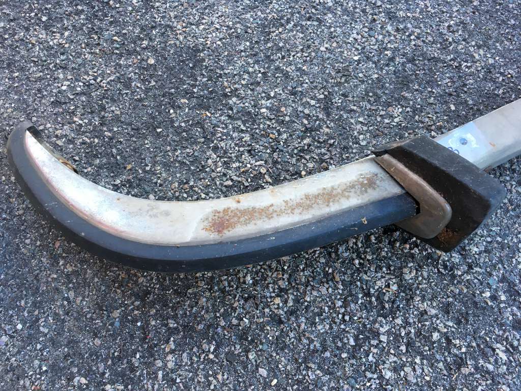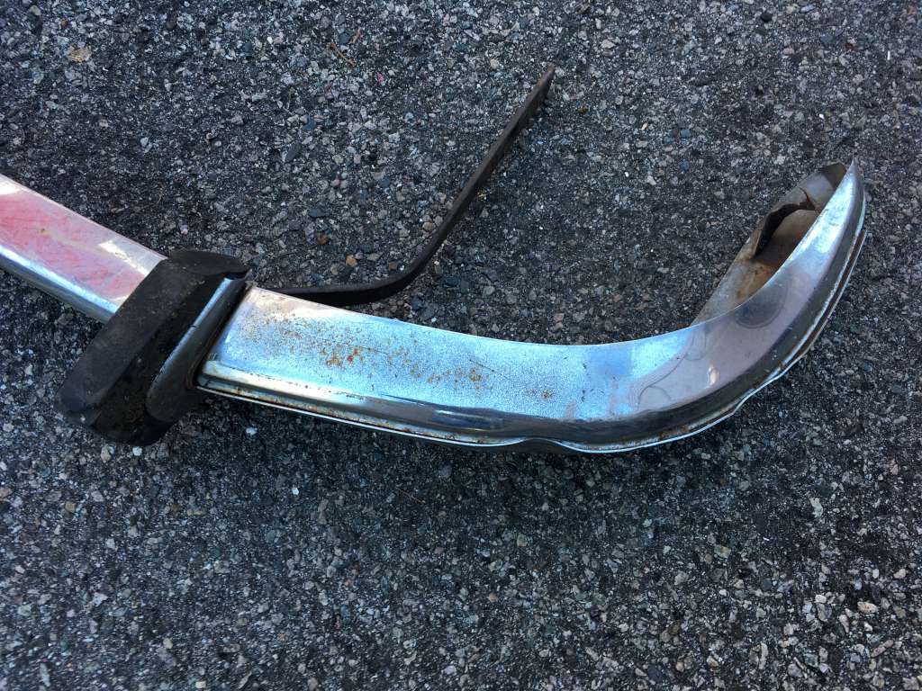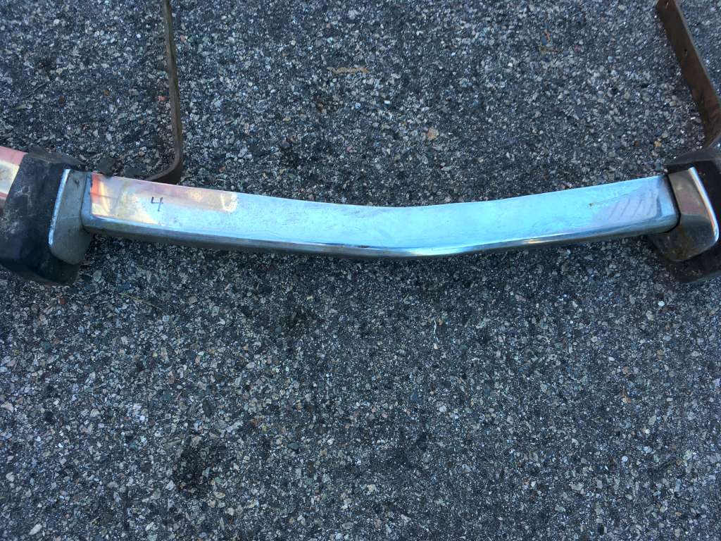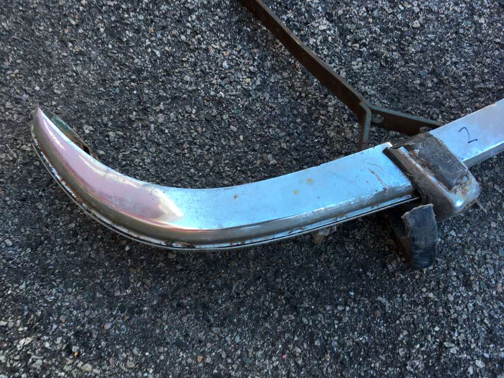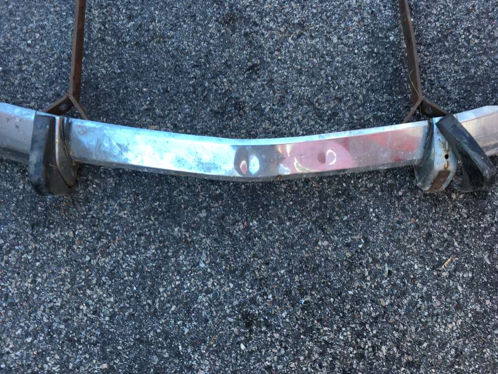 Bumper #2: Probably the best one, fairly shiny chrome, one very small dent underneath the right section, missing the right rubber strip, rubber on the 1973-style bumperettes are detached, some corrosion on the inside, triangular brackets.