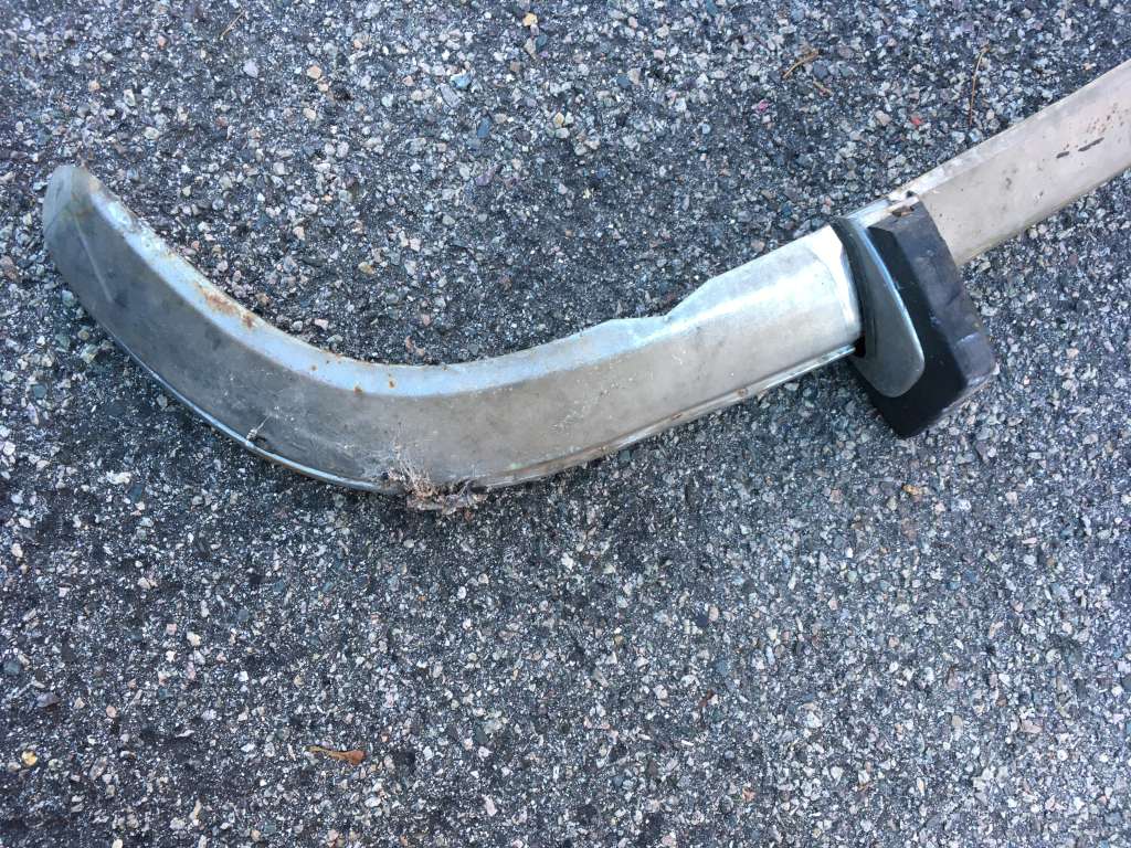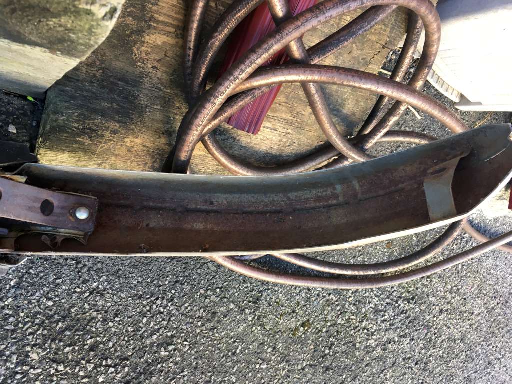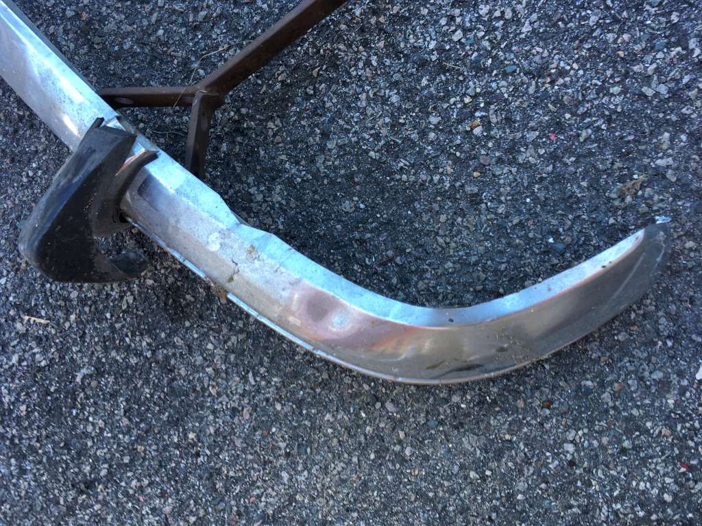 Bumper #1: Shiny left and center sections, dull and corroded right section, 1973-style bumperettes look intact but old, missing both rubber strips, triangular brackets.