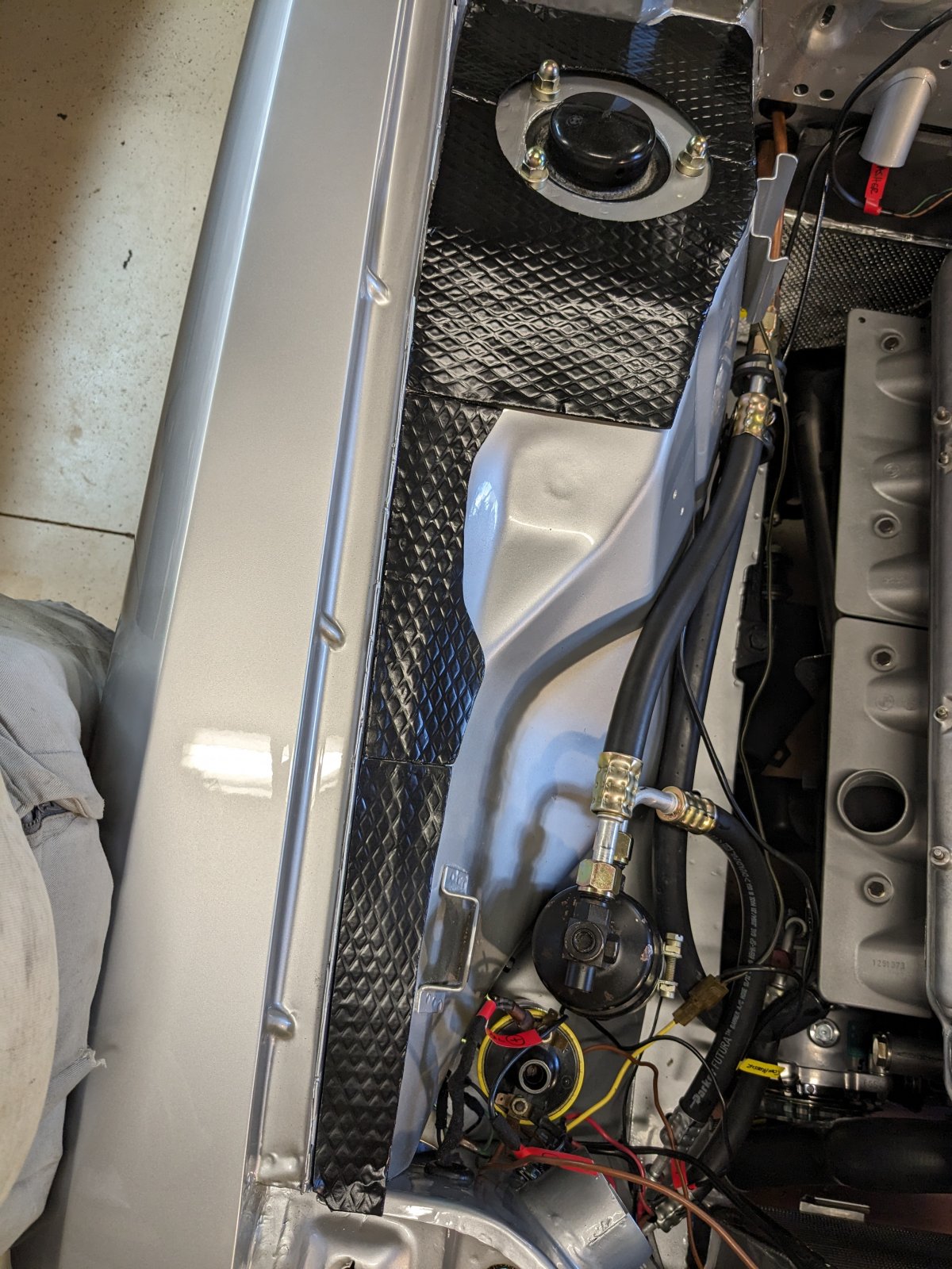 I know this has been covered in the past but it was brought up again in this thread. With regard to the strut tower insulation (sound deadening), I am going to use this stuff. Not Original but looks ok and we just cut ours from patterns that were posted a while ago. I am not going to paint the pieces at this time as I kind of like the black contrast to the silver. May change our mind in the future.