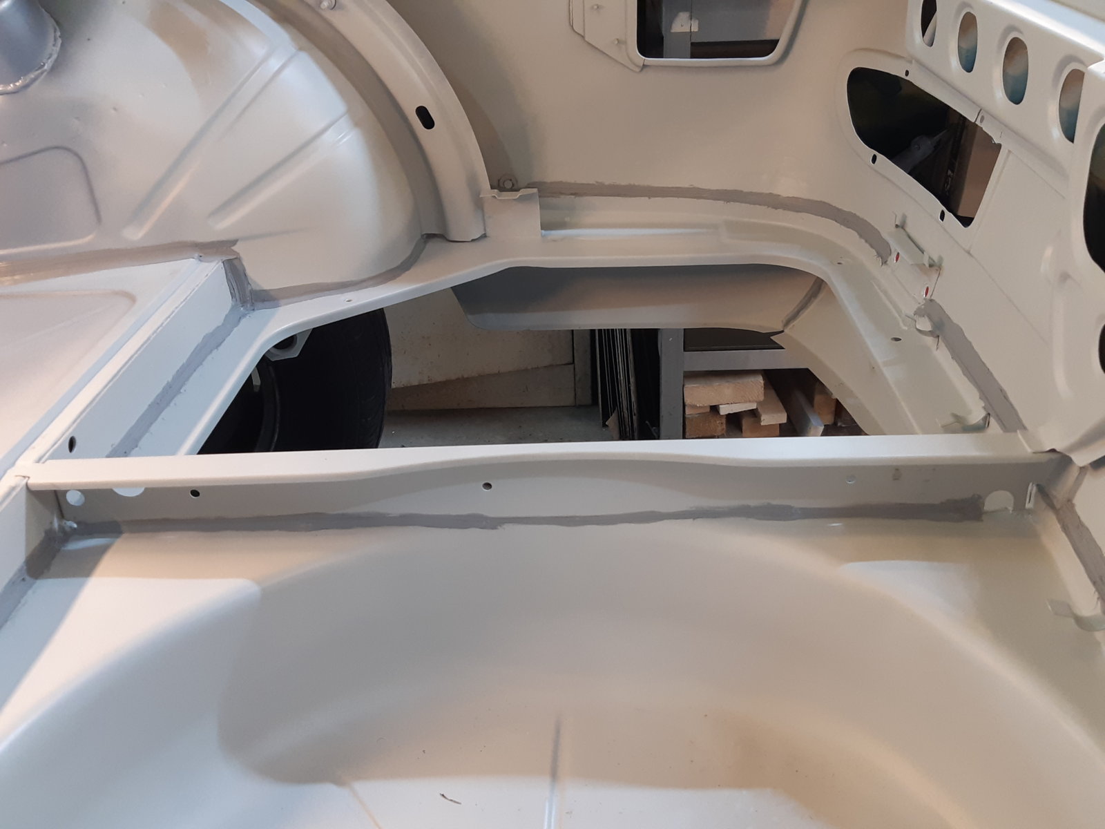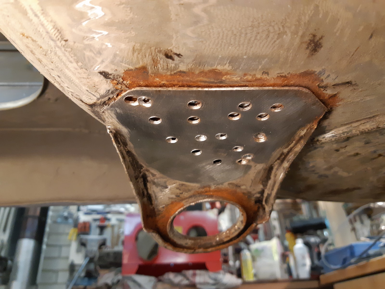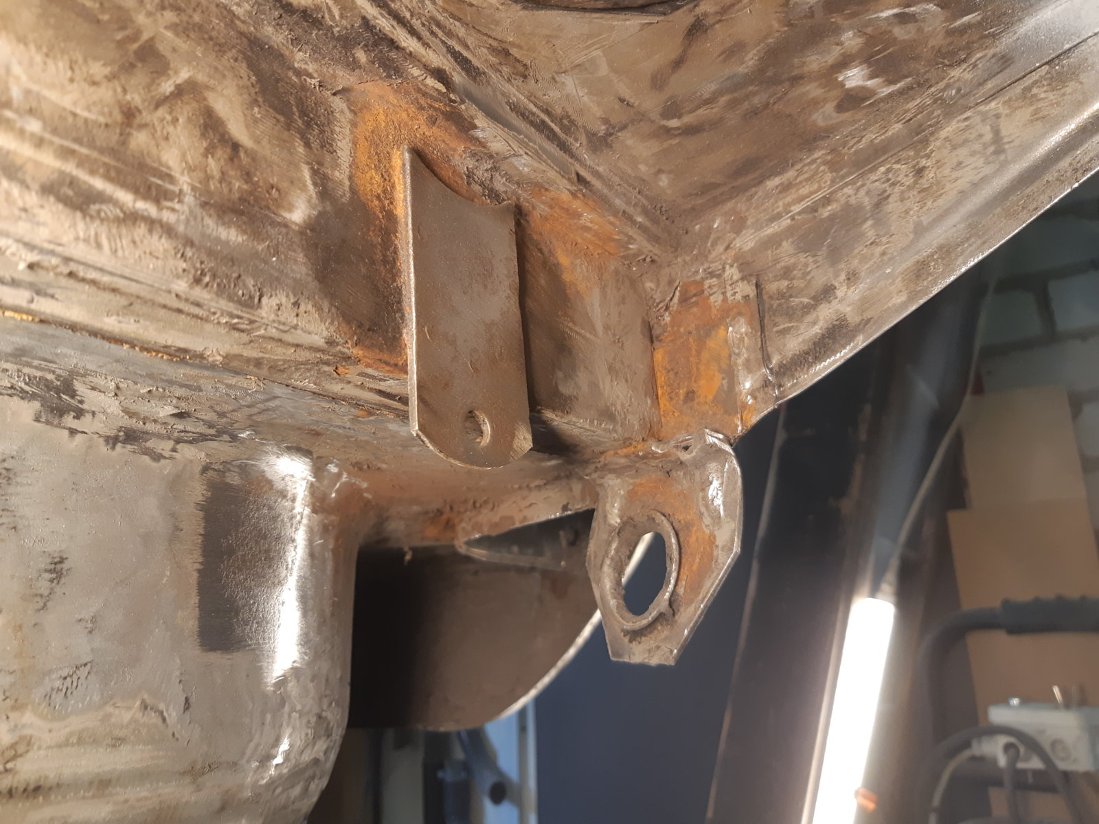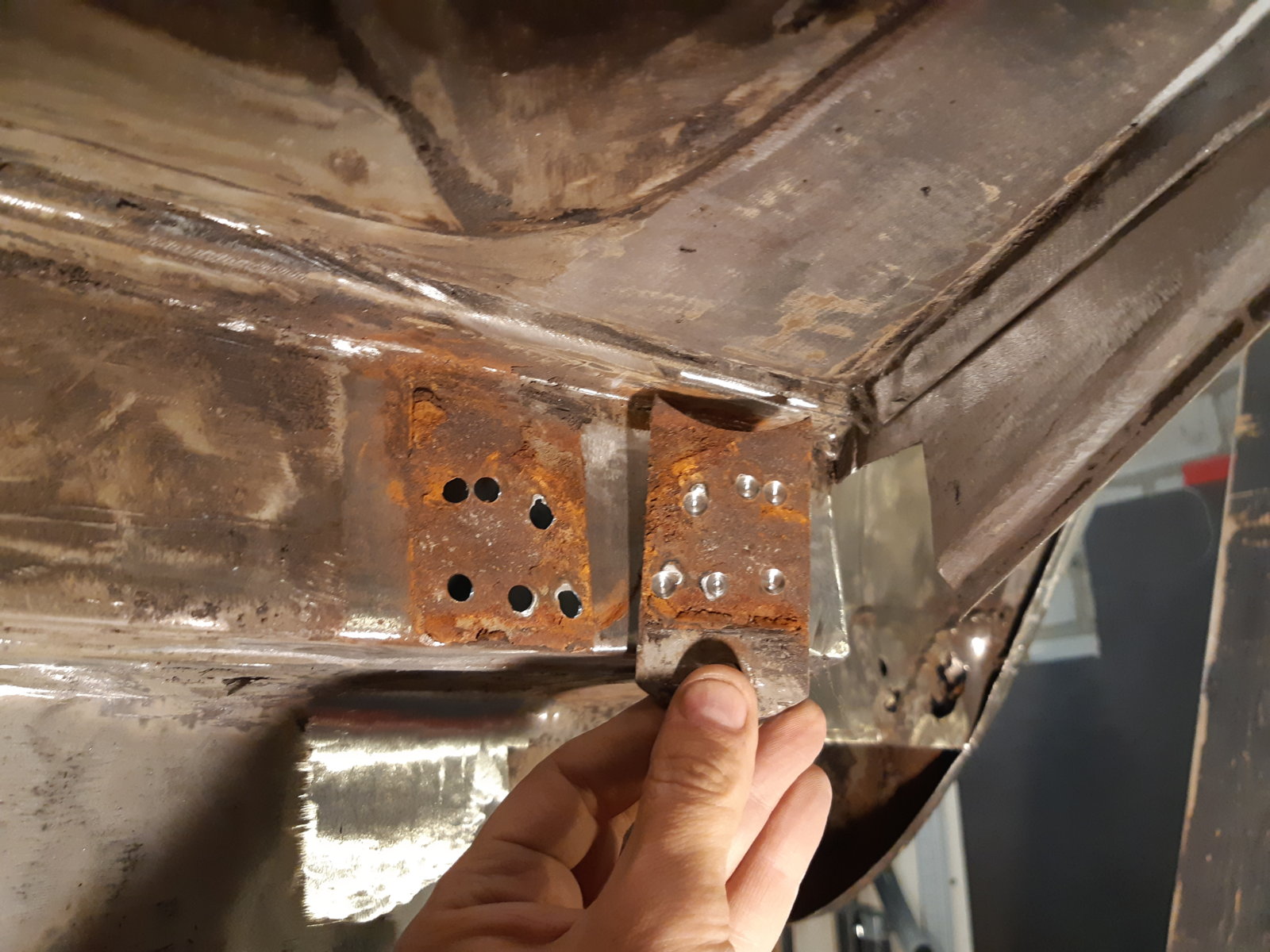 With the left rear floor in place, I tackled the rear subframe mounting point and the whole corner around it as well. It needed everything new; wheel well section, floor section & sill section. the only thing that was still OK was the thick reinforcement itself that holds the ~20*200 mm thick/long knurled bolt; I just sandblasted it and had it zinc coated.