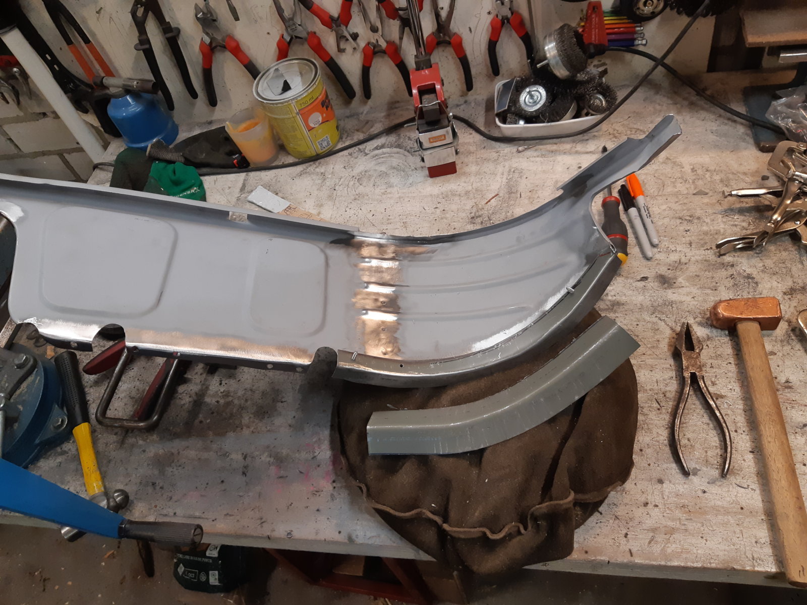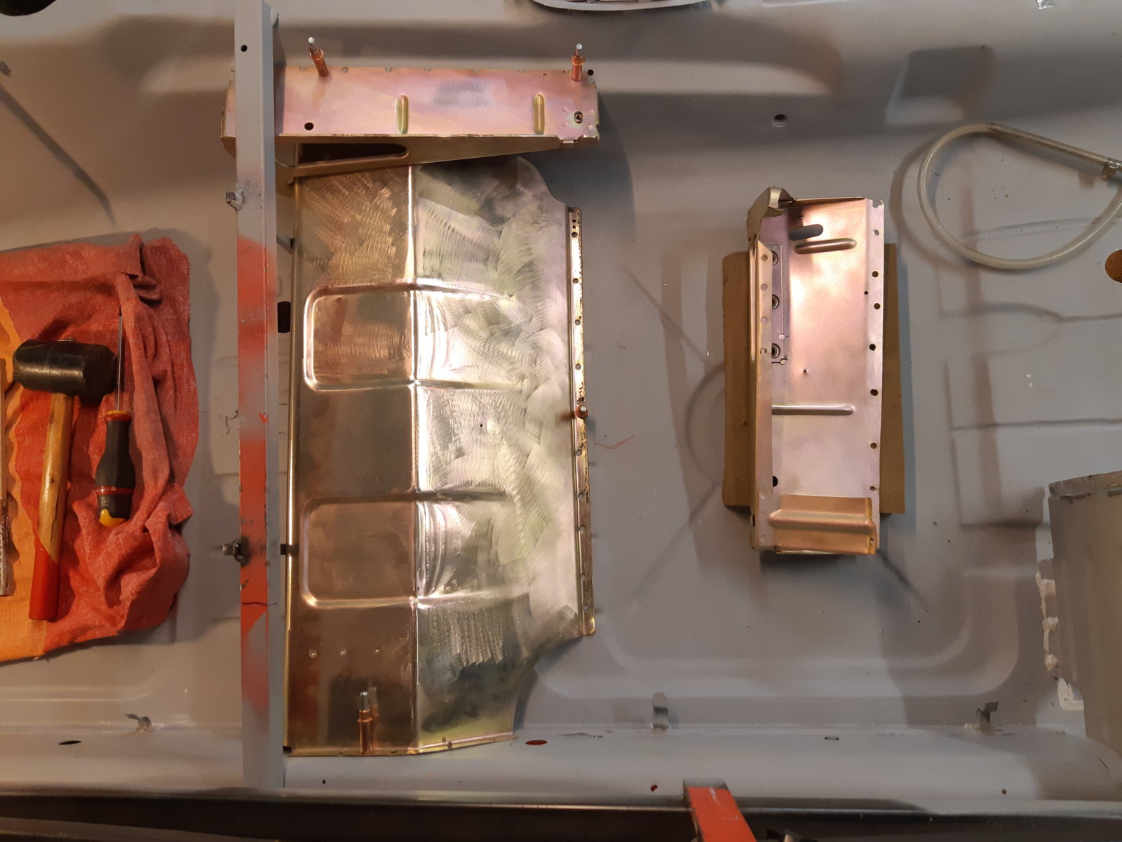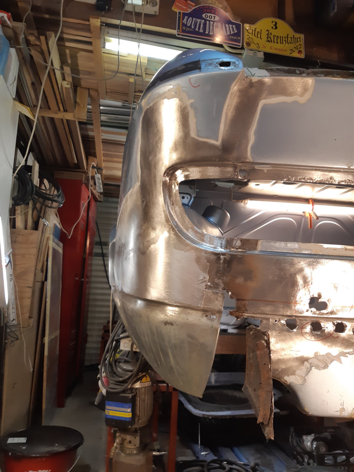 With the left rear floor in place, I tackled the rear subframe mounting point and the whole corner around it as well. It needed everything new; wheel well section, floor section & sill section. the only thing that was still OK was the thick reinforcement itself that holds the ~20*200 mm thick/long knurled bolt; I just sandblasted it and had it zinc coated.