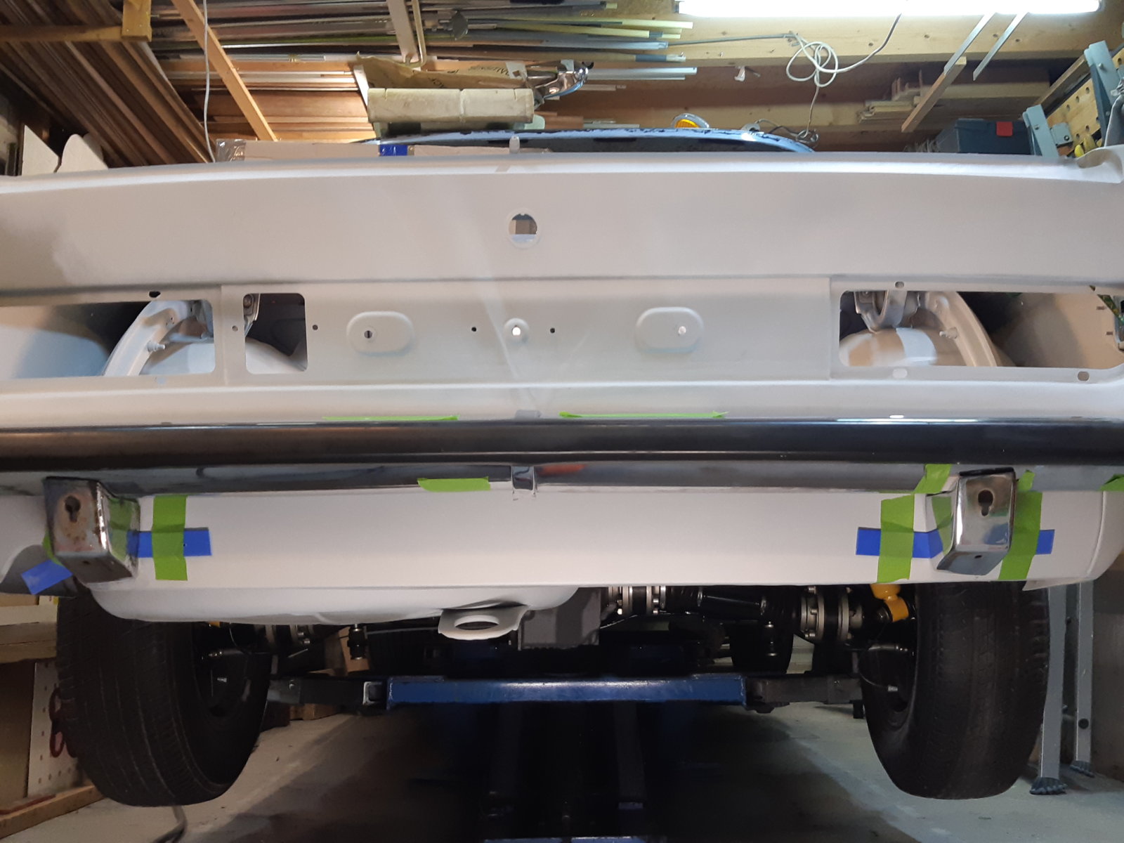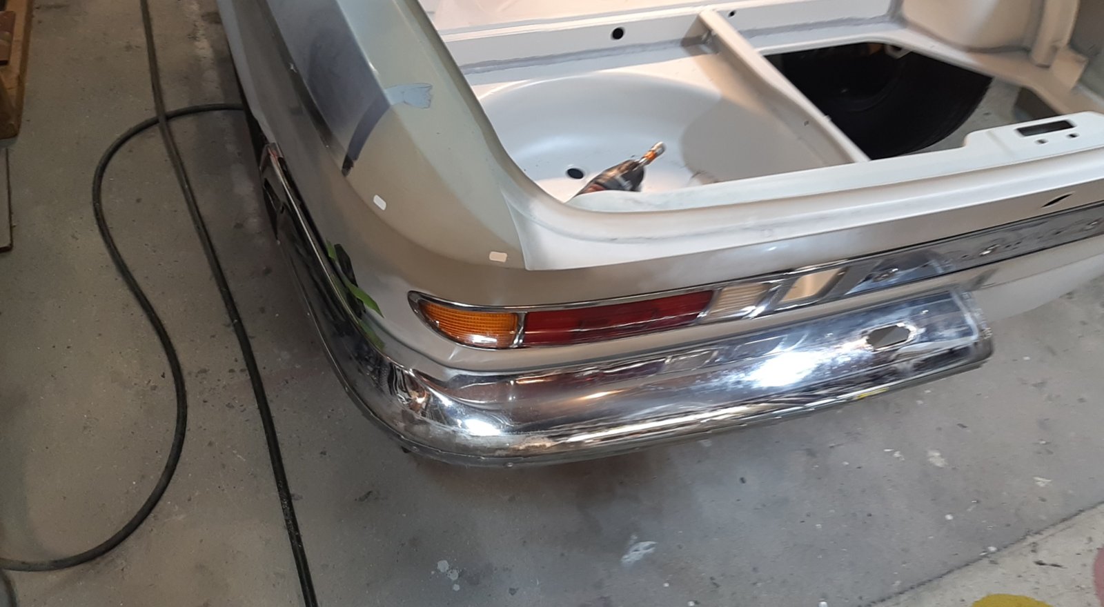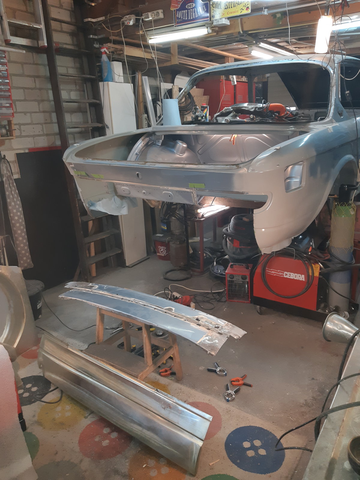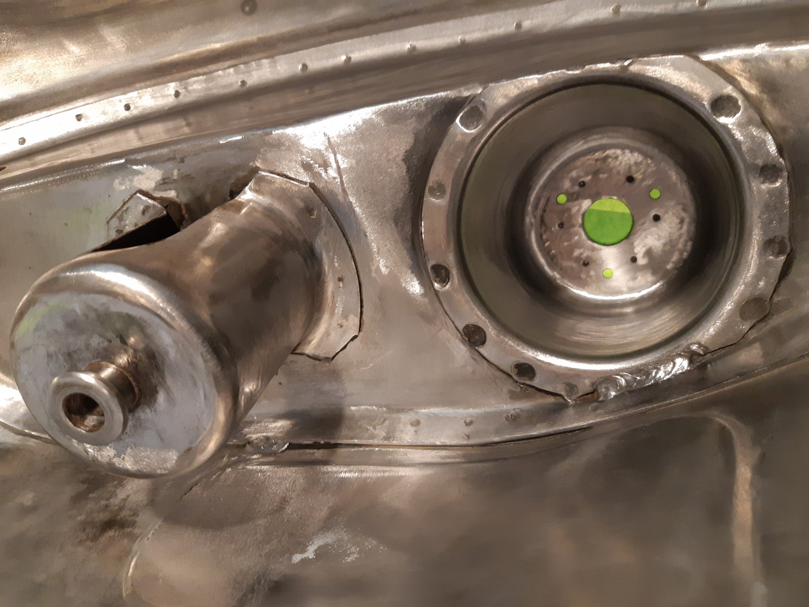 With the left rear floor in place, I tackled the rear subframe mounting point and the whole corner around it as well. It needed everything new; wheel well section, floor section & sill section. the only thing that was still OK was the thick reinforcement itself that holds the ~20*200 mm thick/long knurled bolt; I just sandblasted it and had it zinc coated.