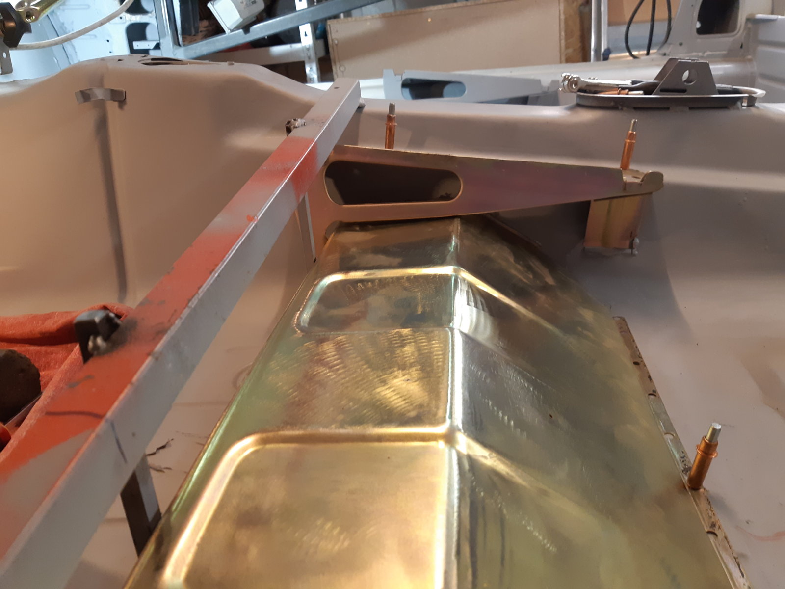 End corner of the inner sill layer was replaced earlier (part of it covered already in post # 134), and I included an extra flange on it, extending it to follow the wheel well, so it ties in better (stronger) to the rear subframe mounting point . You can see it spotwelded in pic ..232036; it's the 'flag shaped' yellow zinc part sticking out towards the left. It will be directly plug welded to the thick reinforcement plate later on, giving it a lot more stability: Originally this reinforcement is welded to the floor (0.8mm), the wheel well (0.8mm) and the sill (2.0mm). Now it has this additional flange of 2.5 mm to hold on to, and you can't see it from the outside!