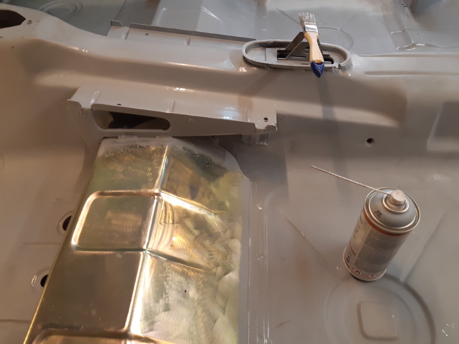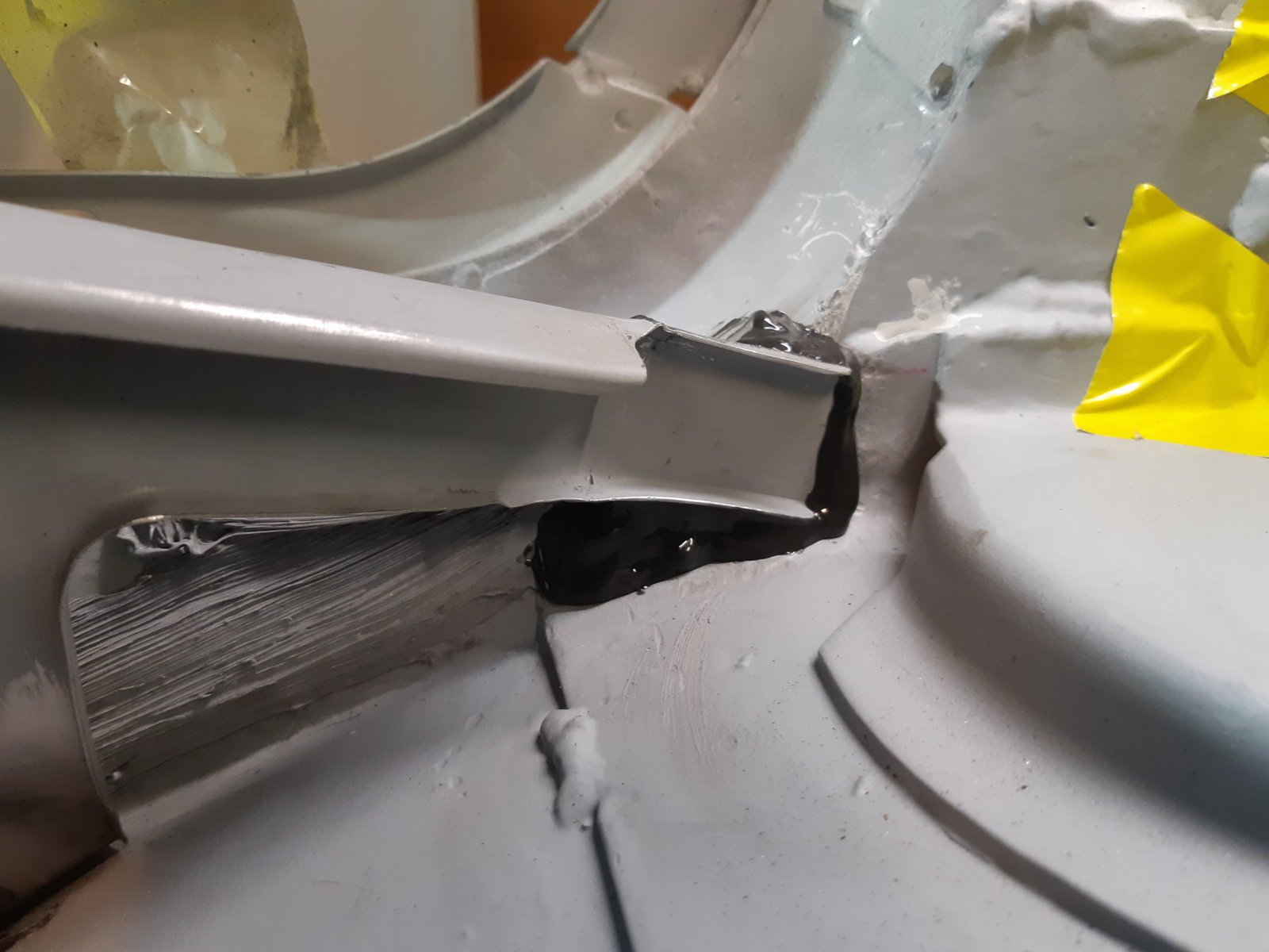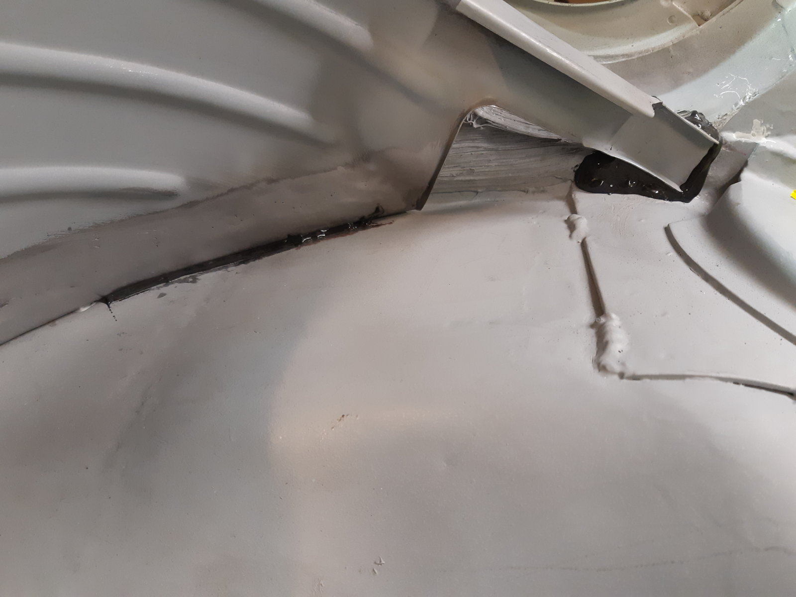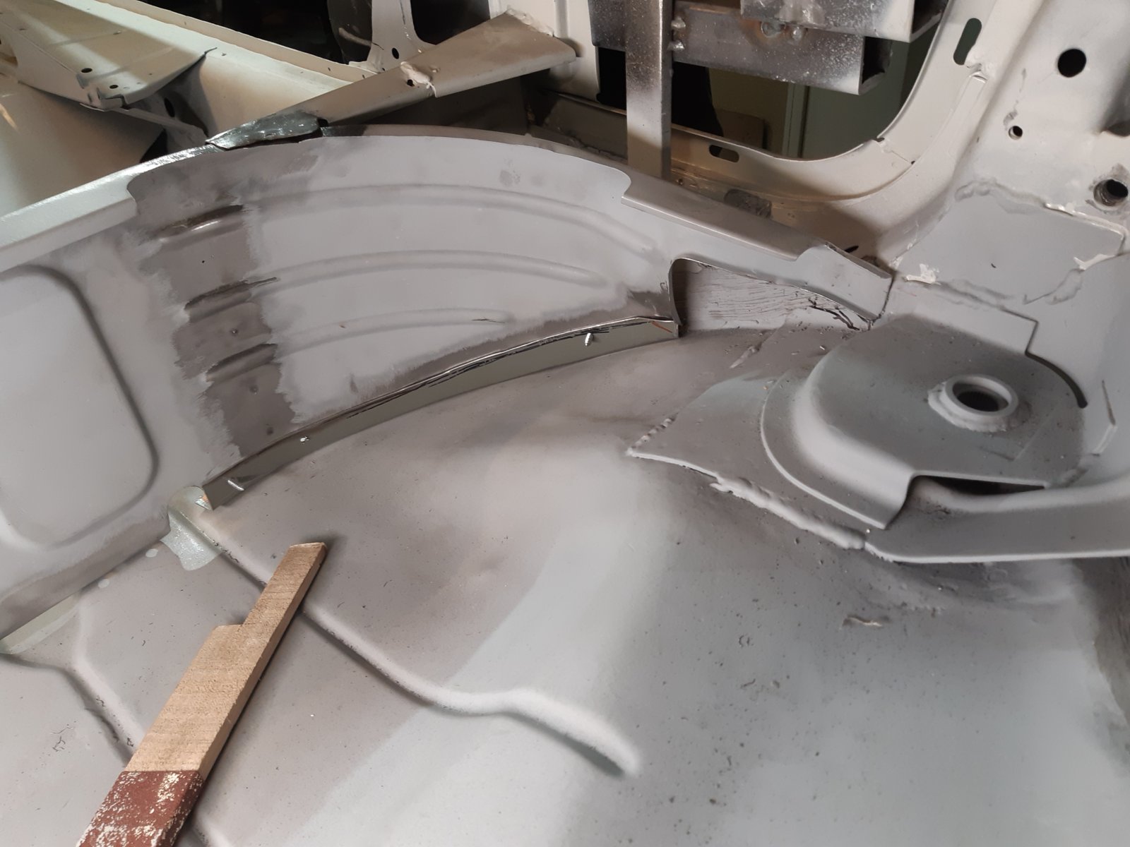 As an in between job I also cleaned out the rust between the spring mount and the wheel well in the left rear wheel arch. (pic 123720) It was not too bad, I expected more rust to come out from under it, and perhaps some pinholes into the wheelwell, but it was just surface rust. Not sure if it was worth the effort, but it is all clean again now. sandblasted & welded back in and sealed with seam sealer.