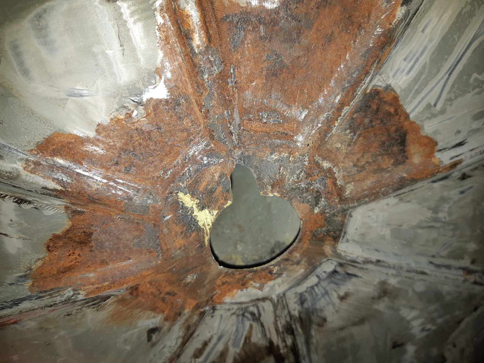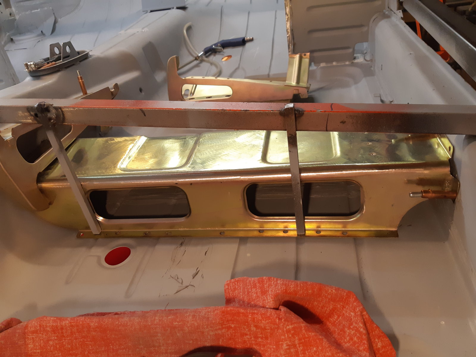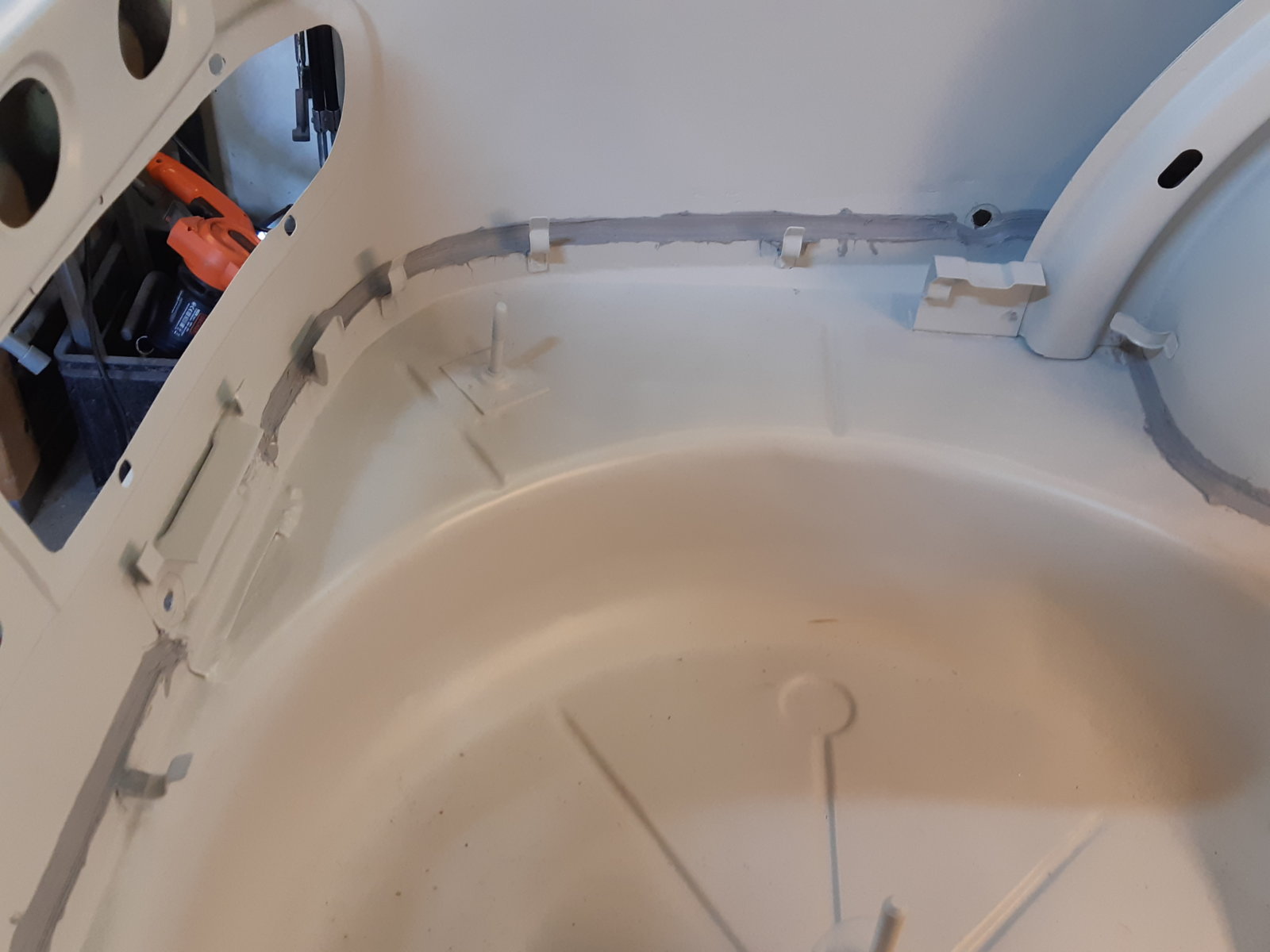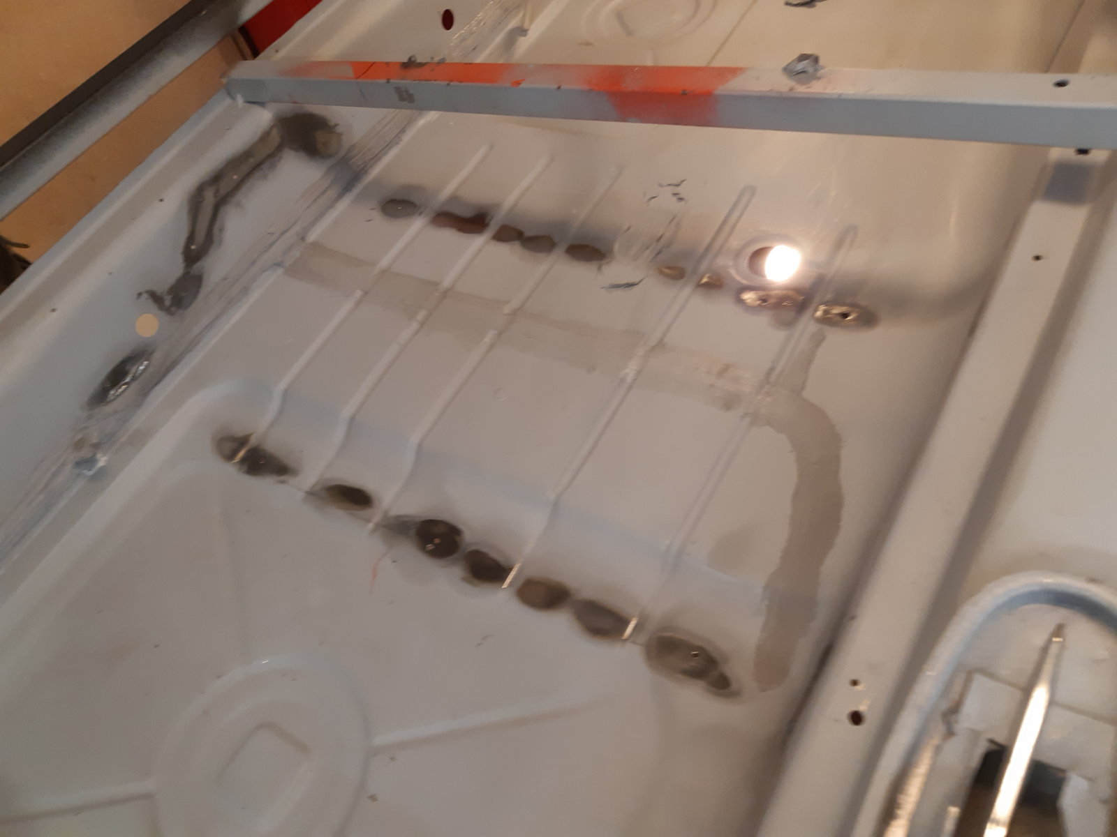 As an in between job I also cleaned out the rust between the spring mount and the wheel well in the left rear wheel arch. (pic 123720) It was not too bad, I expected more rust to come out from under it, and perhaps some pinholes into the wheelwell, but it was just surface rust. Not sure if it was worth the effort, but it is all clean again now. sandblasted & welded back in and sealed with seam sealer.