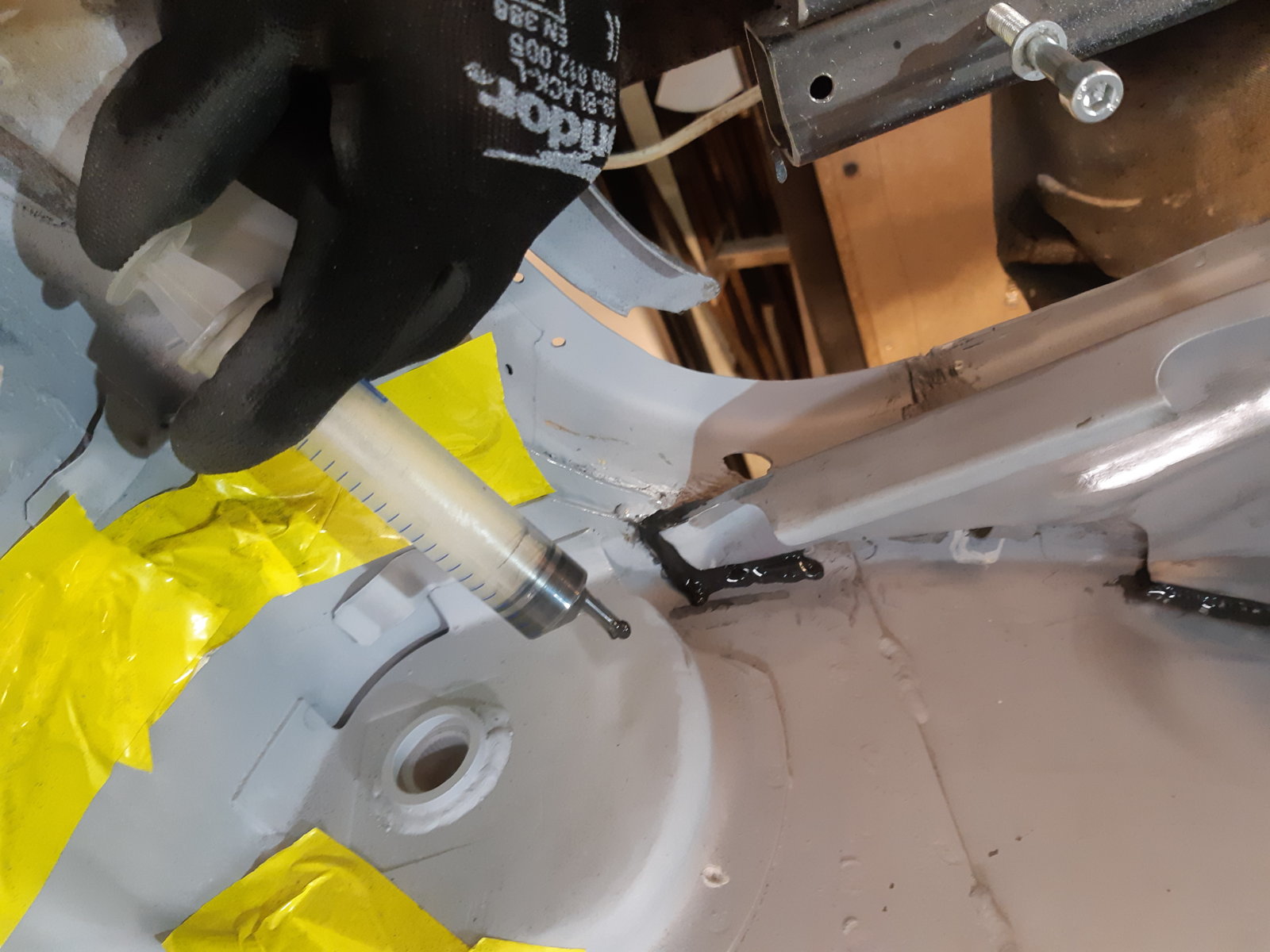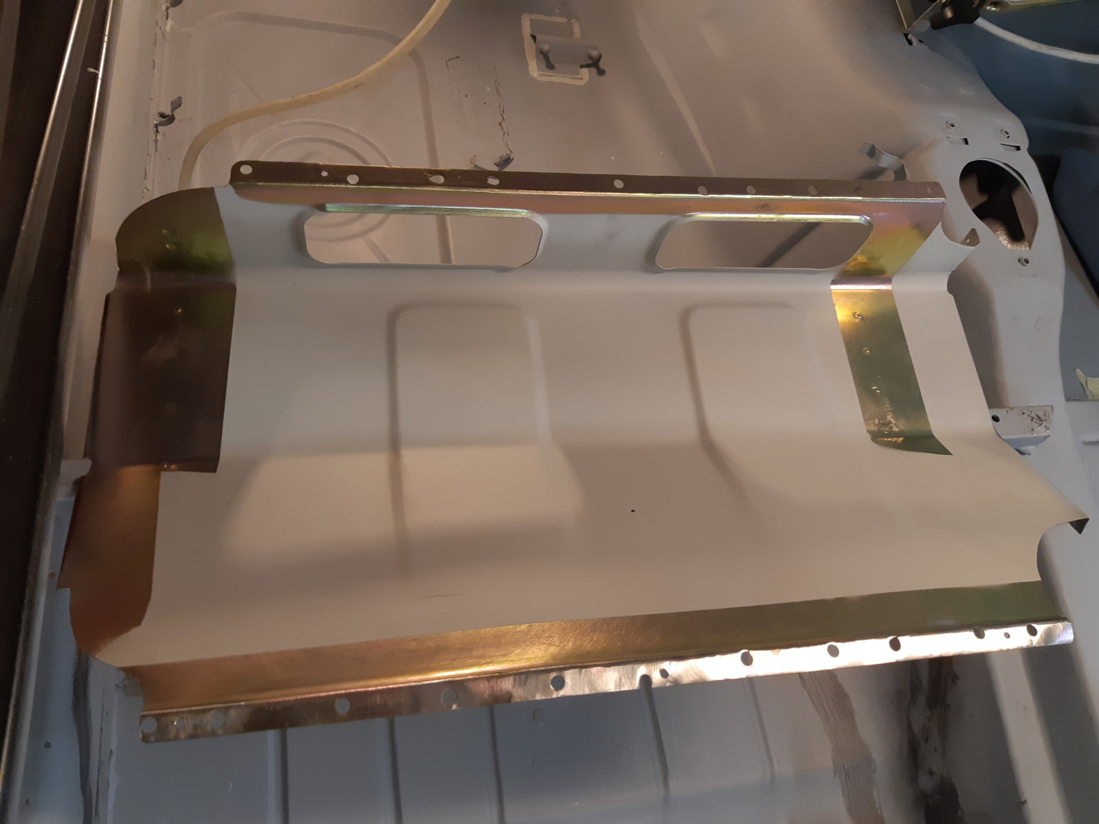 You can also see that I have omitted a rust source; the inner sill originally has a 20mm round holes for wax injection. Some of them are located on the interior side of the floor, but the most rearward point is actually on the bottom side. The white caps tend to fall out, and then it is a direct water entry point, close to a wheel. Not a good thing. So I choose to delete the hole, and made a new one that allows wax insertion from under the rear seat. That new hole is visible in 232036; it's located in the curved piece. From there it continues down through all the stacked layers, allowing wax to penetrate everywhere. (Better pic in next post, the one with the green line)