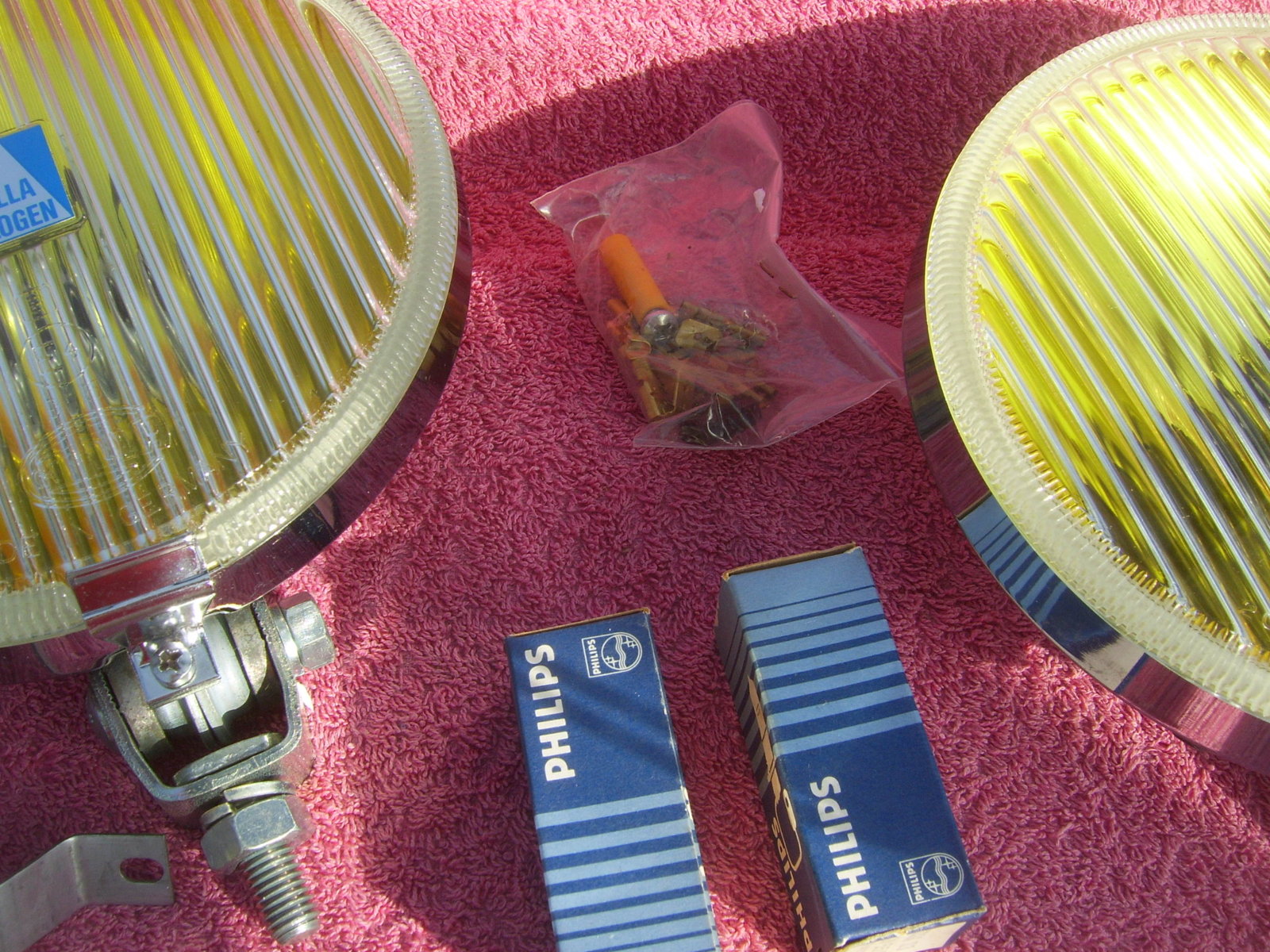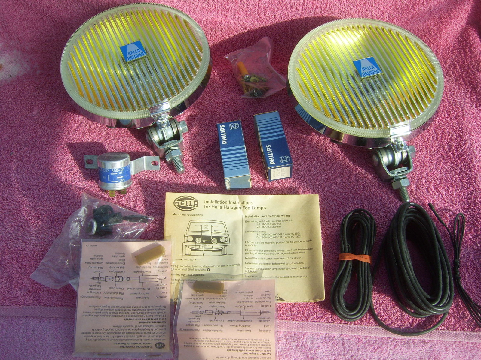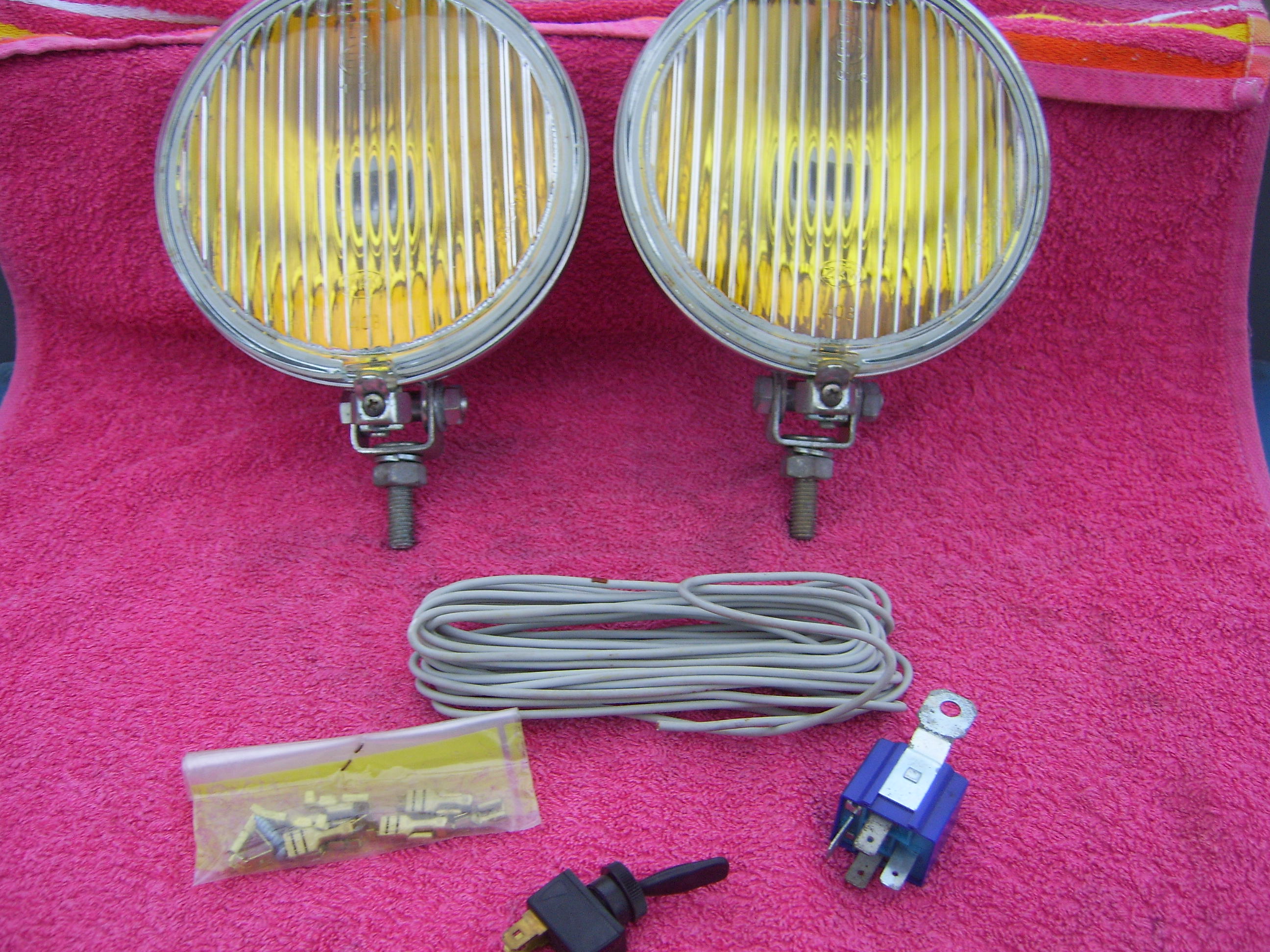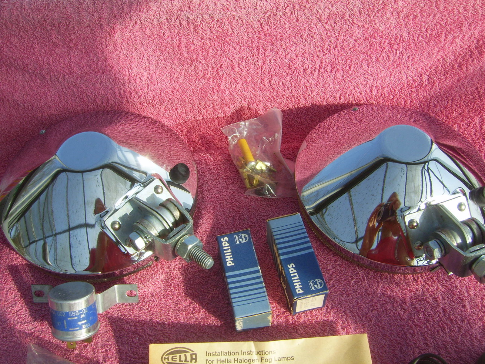 SOLD Set 6"25 NOS chrome Hella 160 yellow fog lights, still in the Original packaging. With instruction manual, switch, wiring, mounting material, 2 bulbs and relay. Price 240 euro + shipping.