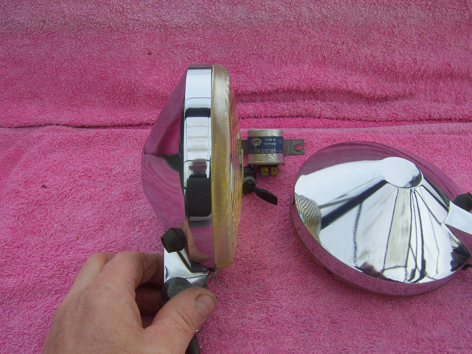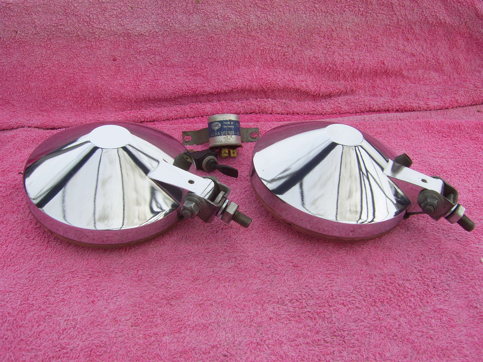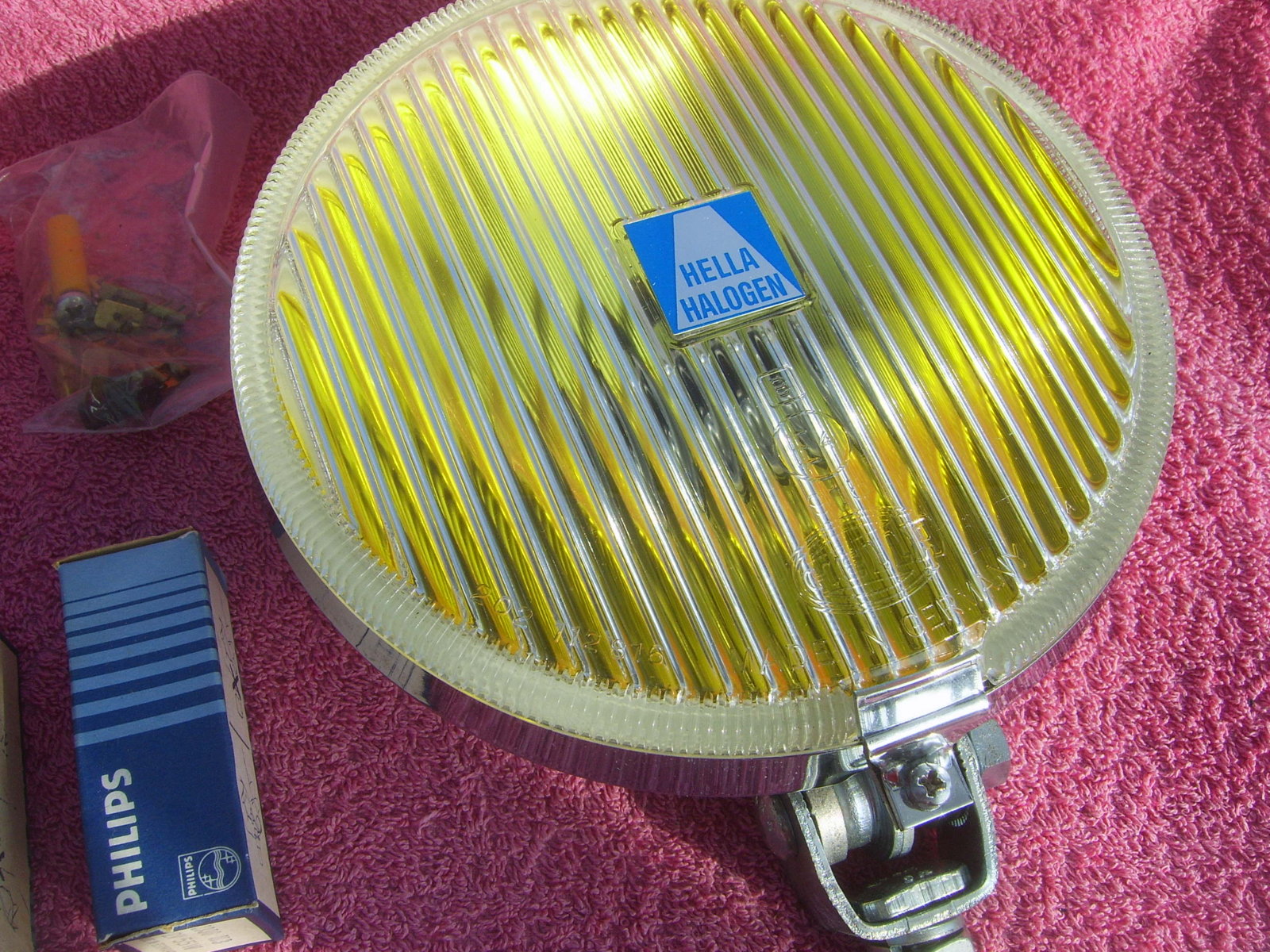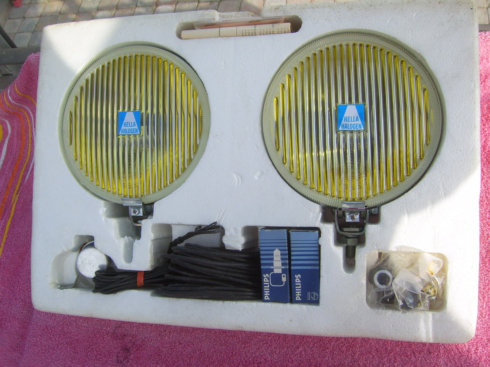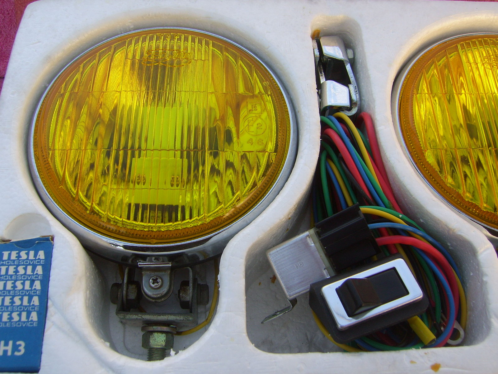 SOLD Set 6"25 NOS chrome Hella 160 yellow fog lights, still in the Original packaging. With instruction manual, switch, wiring, mounting material, 2 bulbs and relay. Price 240 euro + shipping.