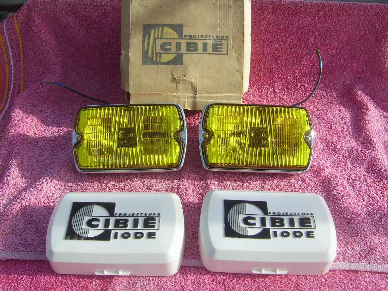 SOLD: Cibie 40 Iode yellow fog lights, included are a set Original covers. Bulbs and wiring are included, lights are working. Price 165 euro + shipping and fee.