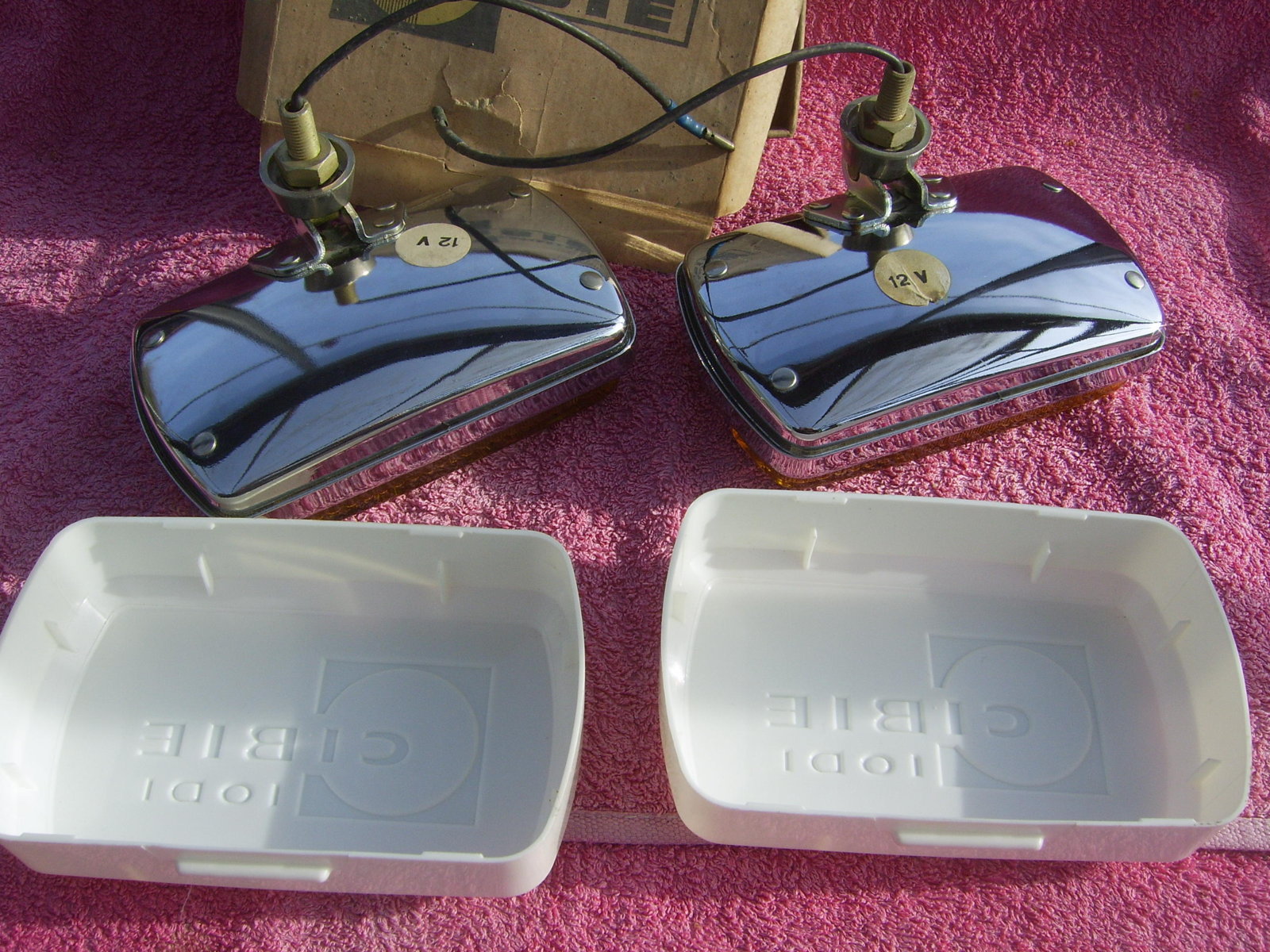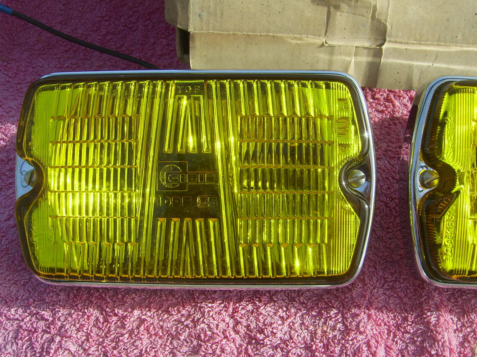 SOLD NOS Cibie 35 rectangular yellow fog lights with chrome housings. Bulbs and wiring are included, lights are working. Included is one Original box. Included are the Original Cibie covers also in NOS condition. Price 225 euro + shipping.