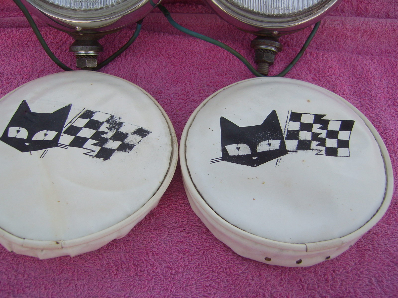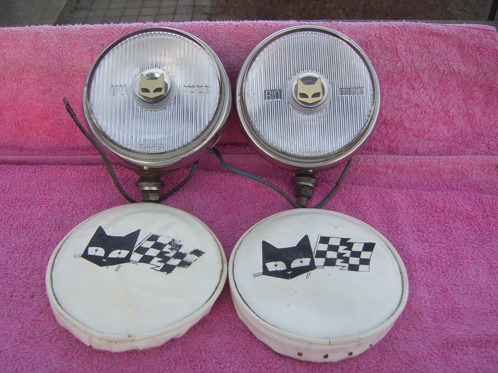 SOLD: Set Cibie 45 Iode yellow fog lights and a set very rare hard to find covers Racing Team, included are the boxes, instructions, wiring and bulbs. Lights are working. These lights are never been mounted on a car. One cover have a very tiny crack, see last picture. Price 245 euro + shipping.