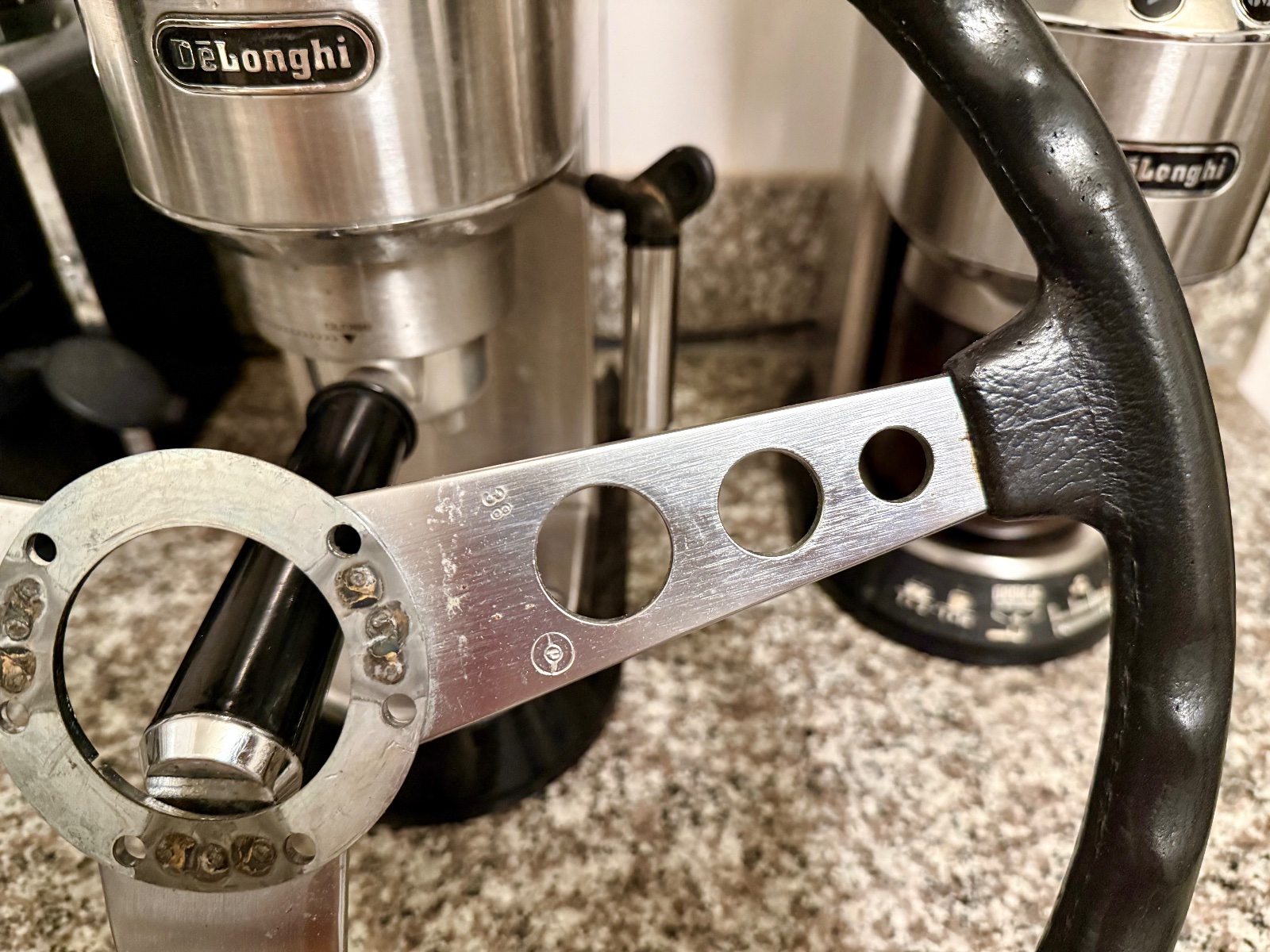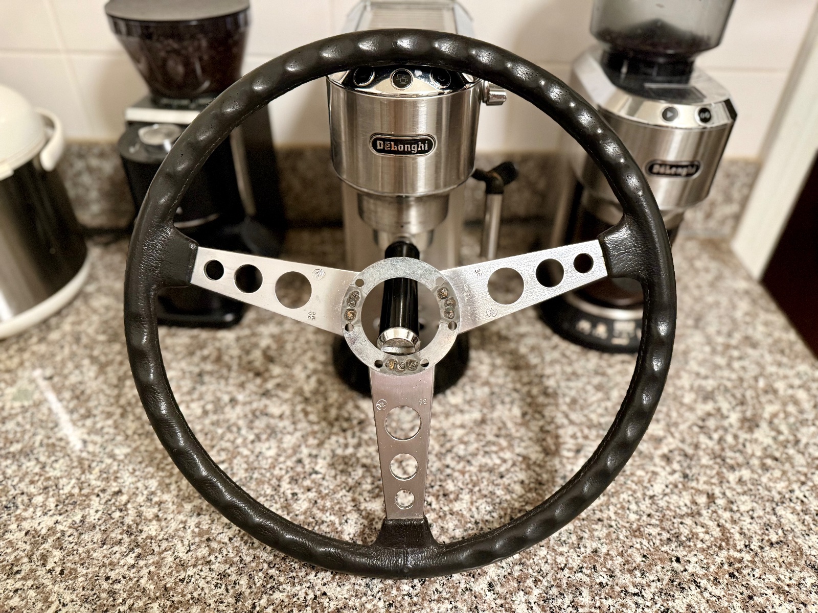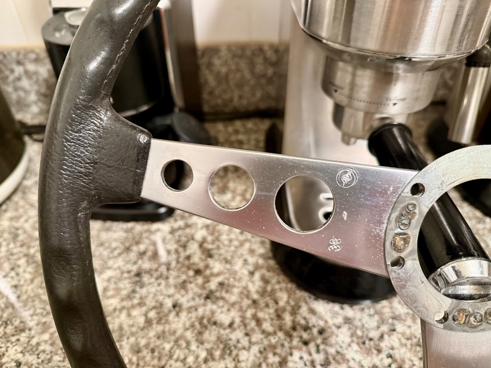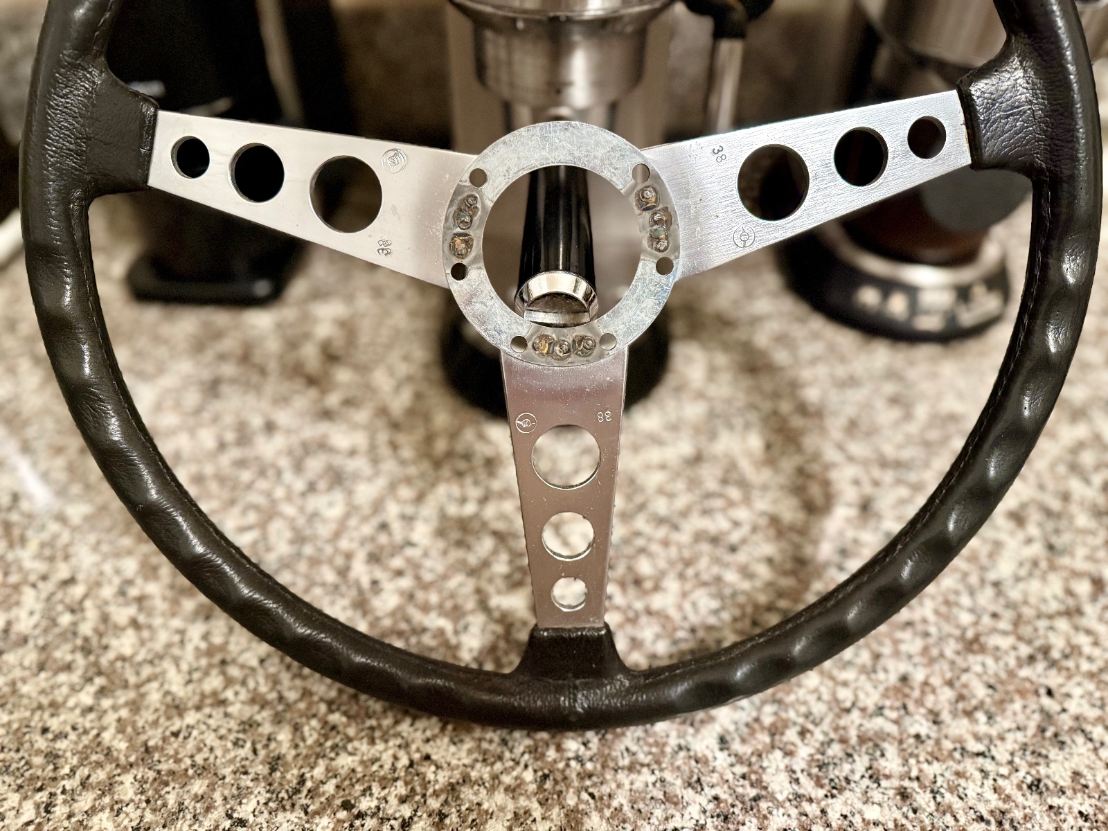 Some more photos and additional info. As stated, the foam/rubber grip imitation leather grain structure from 9 to 3 position has worn away somewhat. Still, the grip is in excellent shape, the feel and looks are kind of like the modern smooth grain BMW leather steering wheels.
