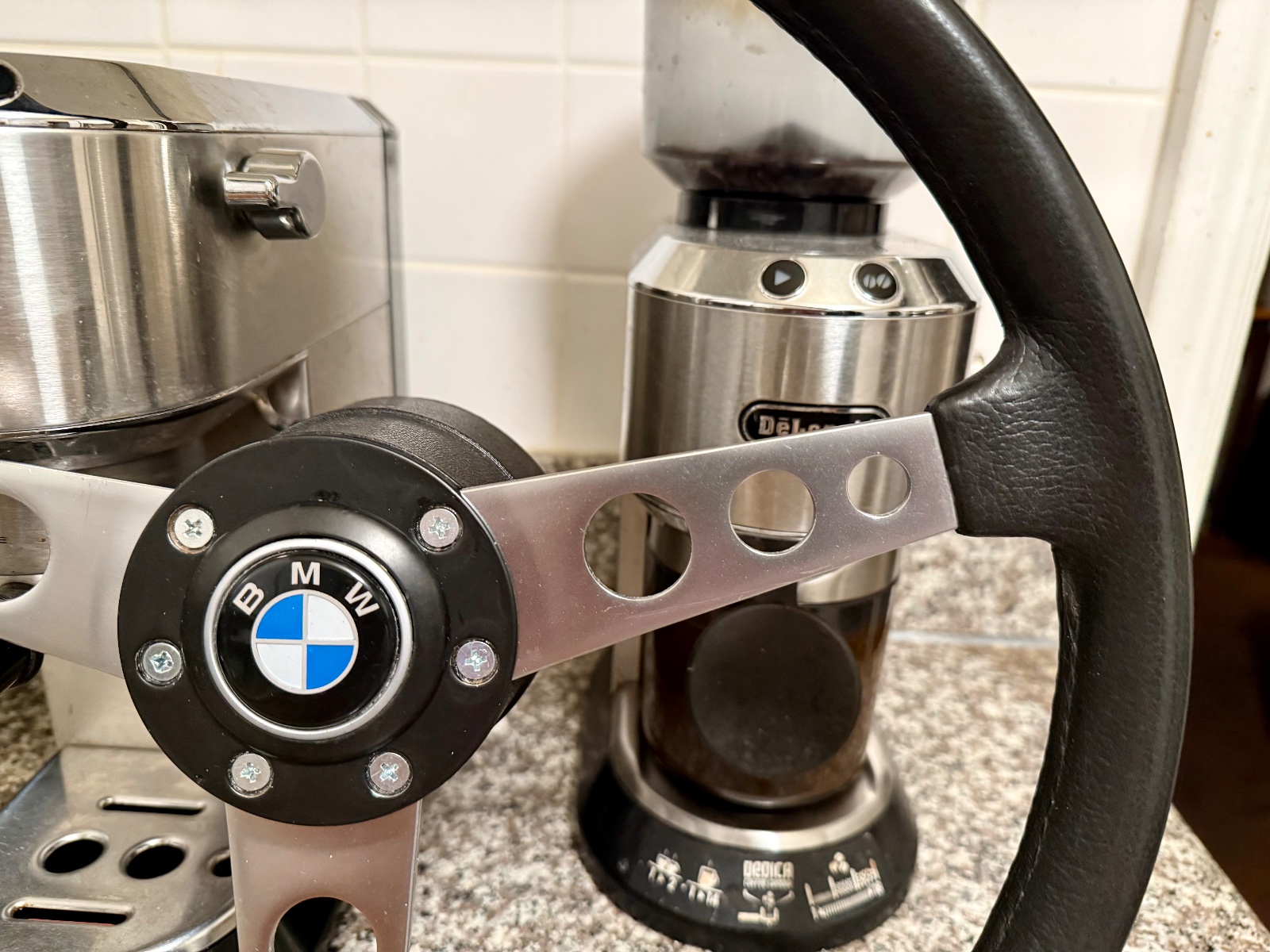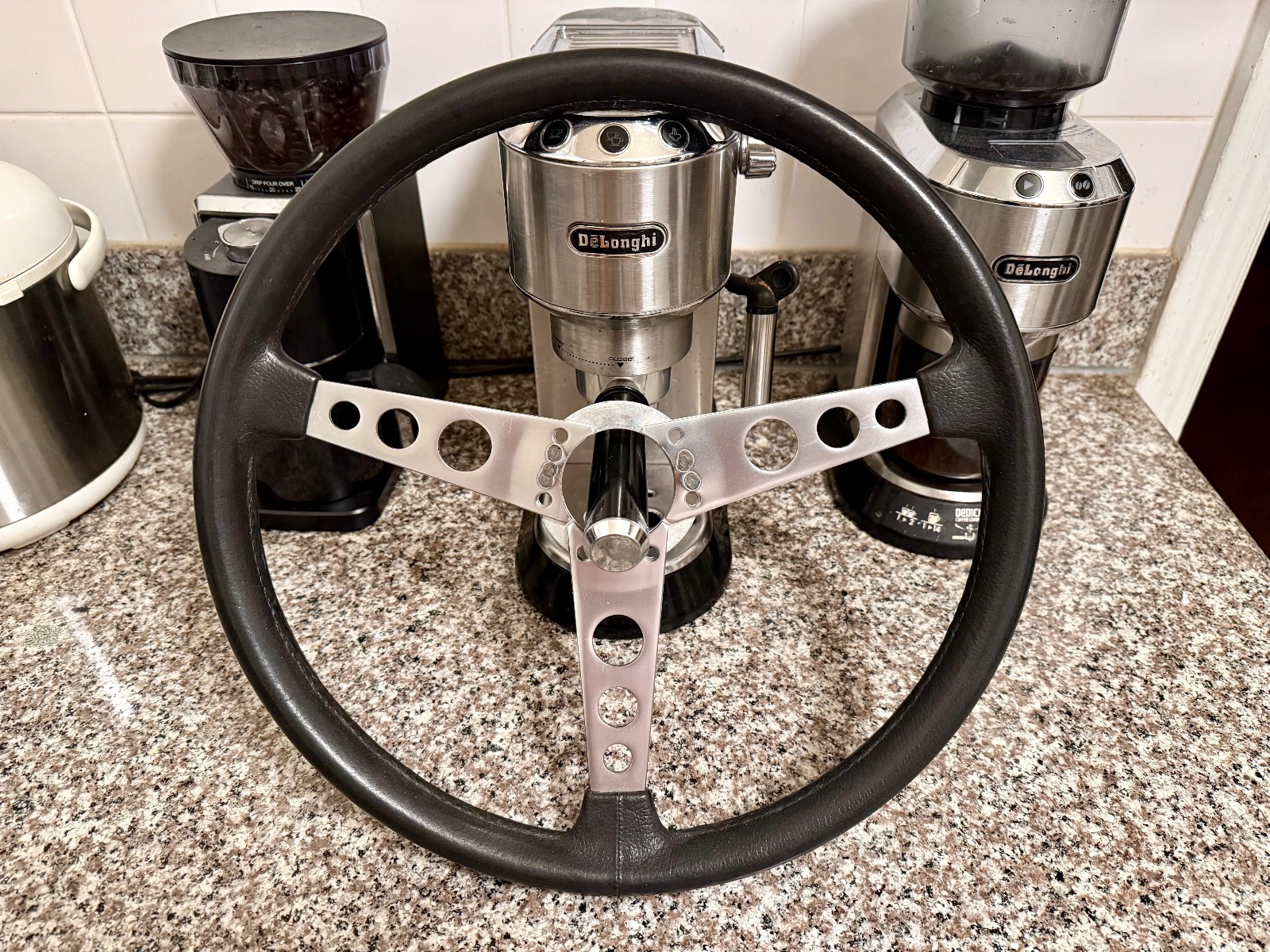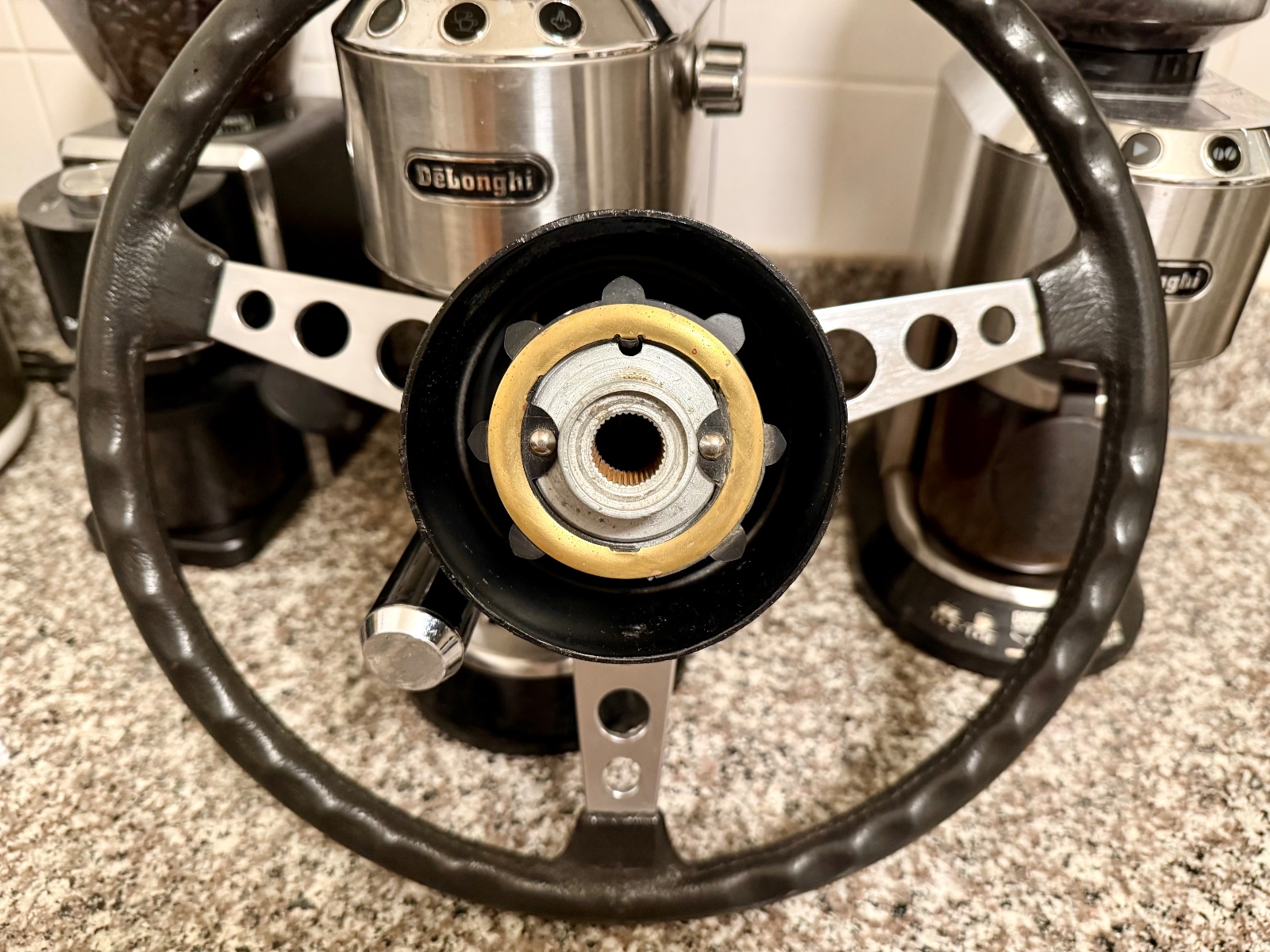 Some more photos and additional info. As stated, the foam/rubber grip imitation leather grain structure from 9 to 3 position has worn away somewhat. Still, the grip is in excellent shape, the feel and looks are kind of like the modern smooth grain BMW leather steering wheels.