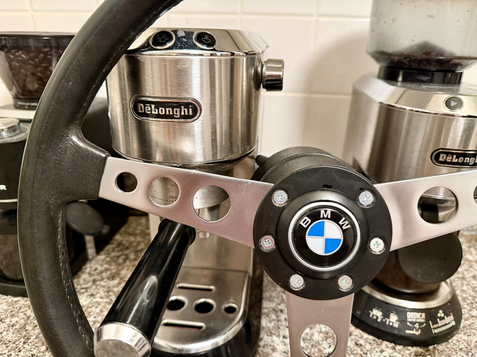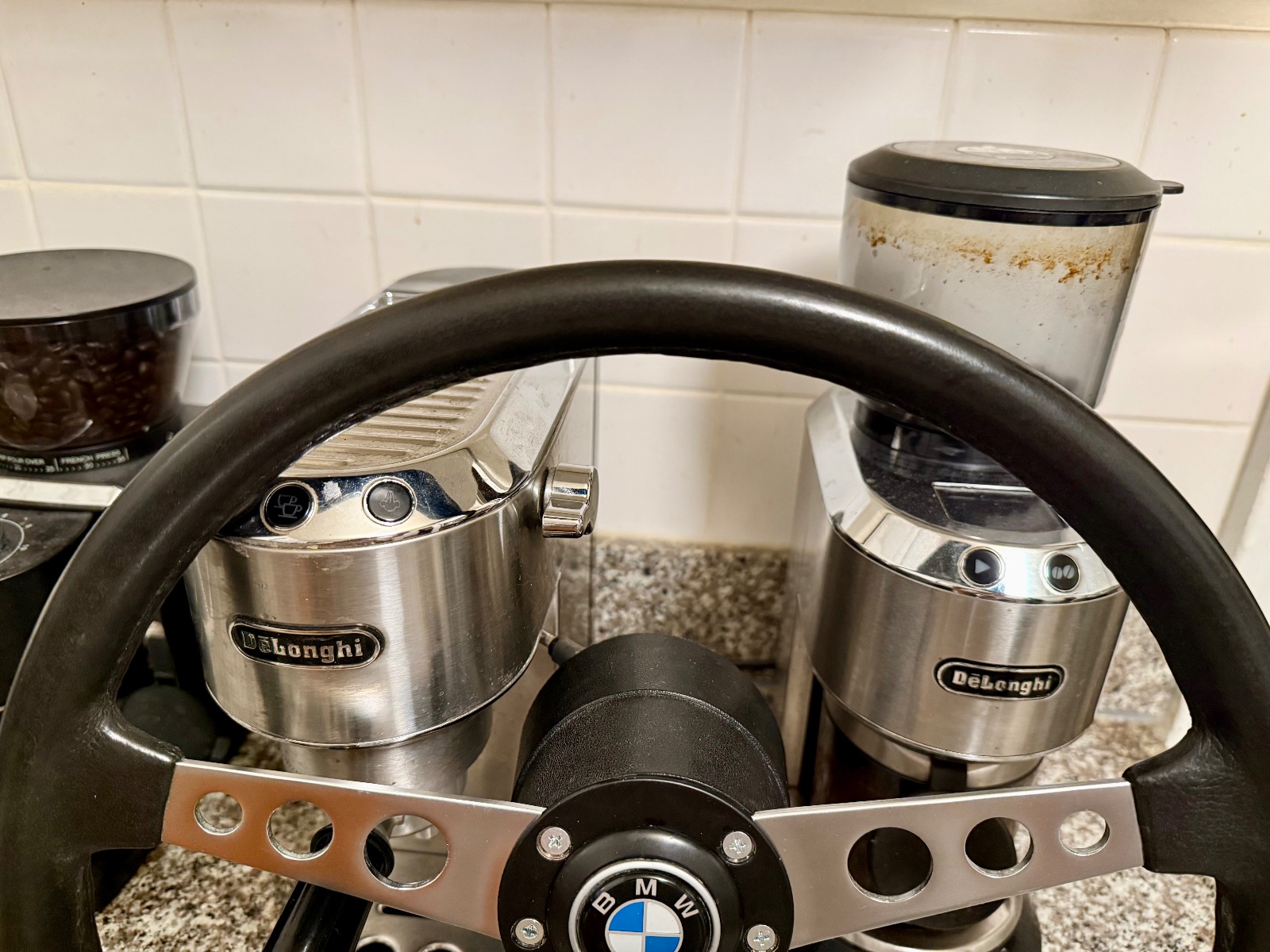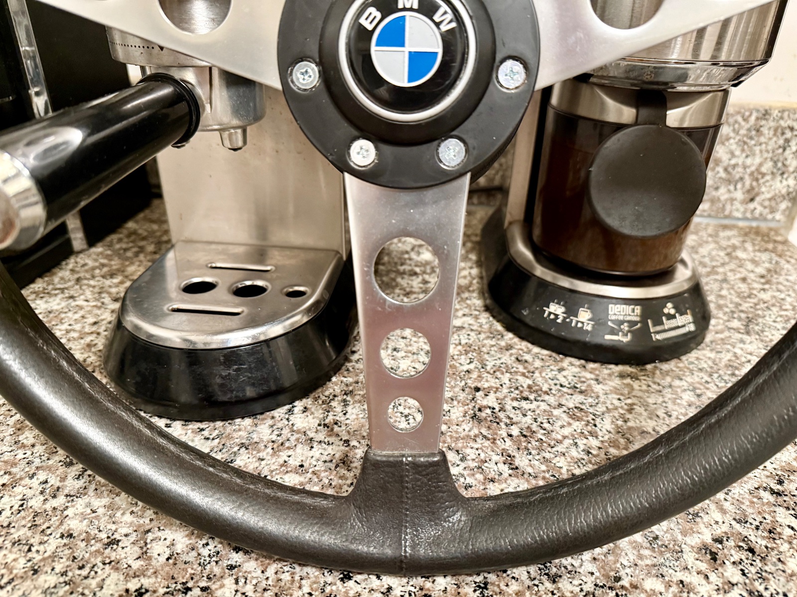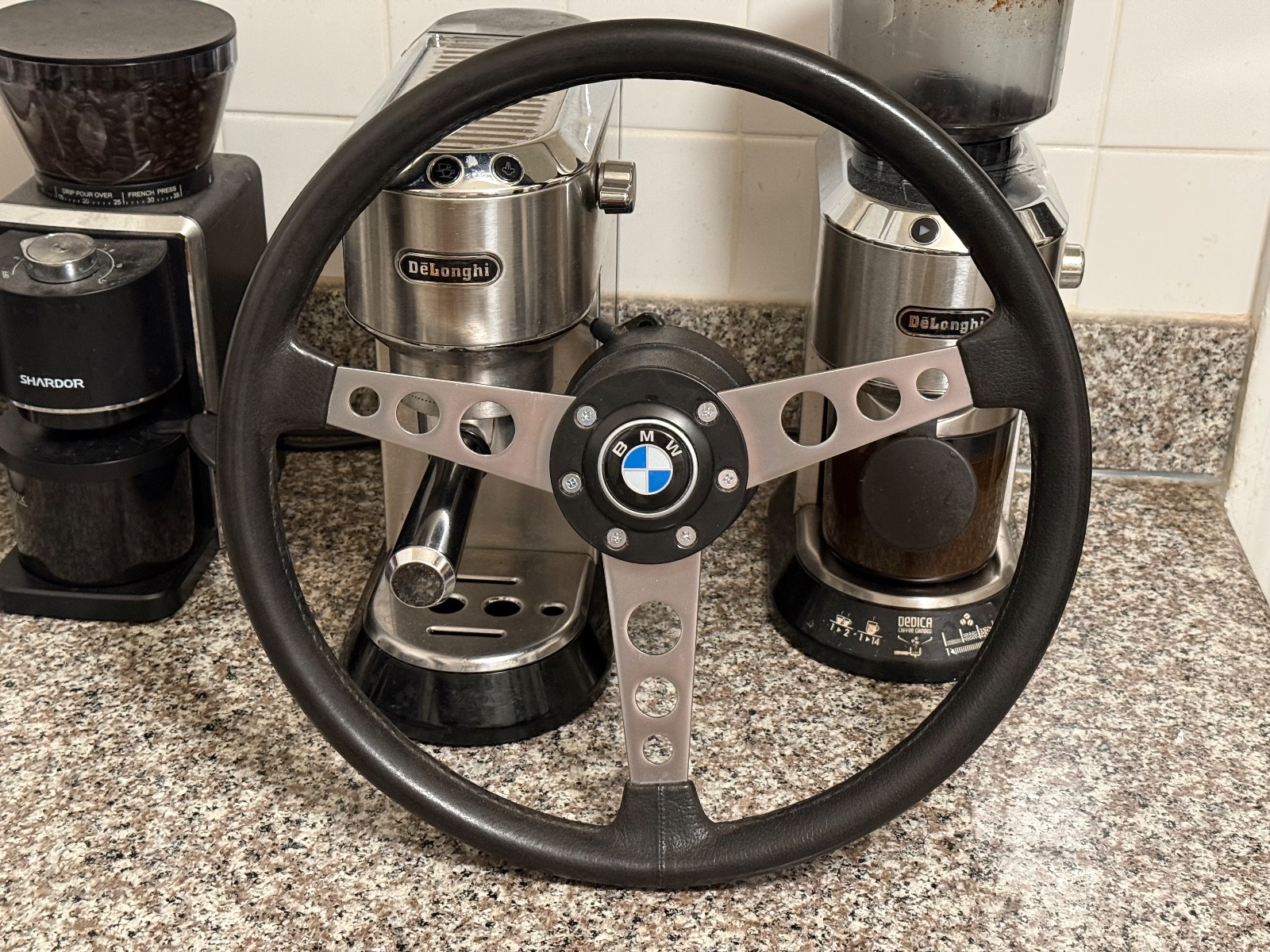 Some more photos and additional info. As stated, the foam/rubber grip imitation leather grain structure from 9 to 3 position has worn away somewhat. Still, the grip is in excellent shape, the feel and looks are kind of like the modern smooth grain BMW leather steering wheels.
