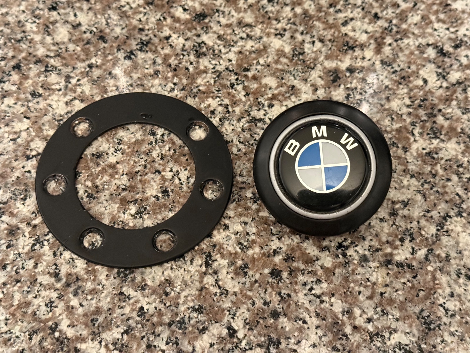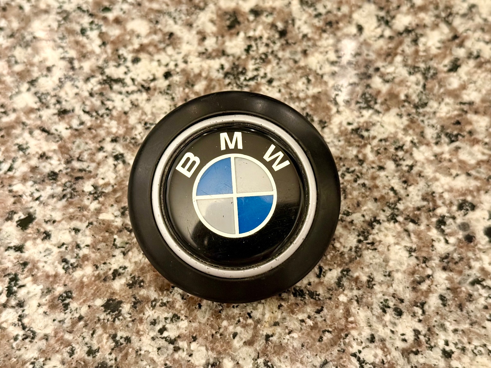 The excellent condition alloy hub is the correct e9 unit with an aftermarket horn contact ring that was bought a few years ago from a fellow Euro forum member. The black plastic hub should is also in great condition with no cracks or missing chunks. The factory Petri horn button is in excellent condition also. The 6 hole black horn button trim ring is in very good shape. The original black finish on the ring has been touched up at few spots that chipped.