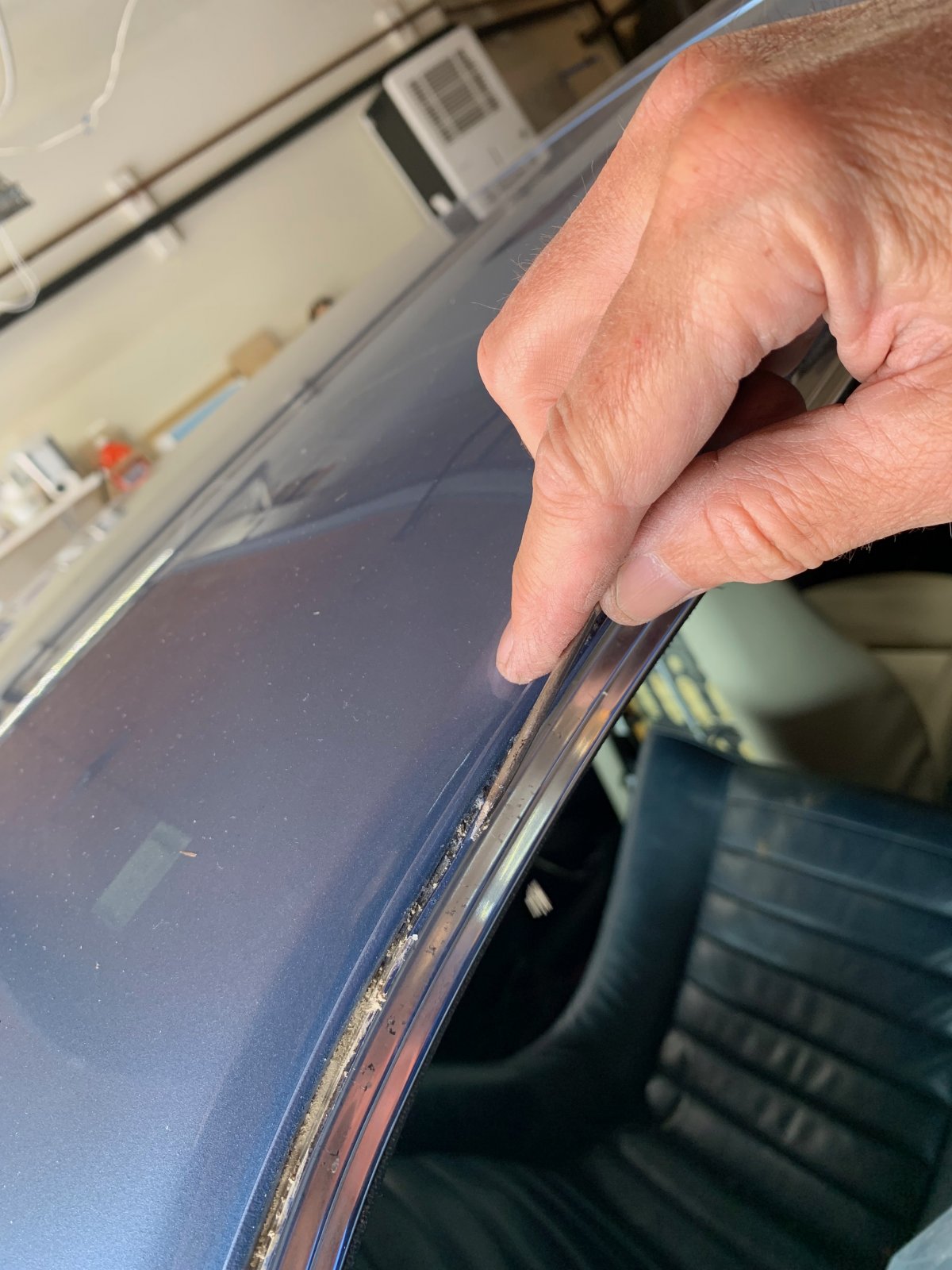 Make sure that the aluminum flat piece that lines the inside opening of the door and rear window is installed first since the drip rail trim needs to go over that. Shot from below looking up towards the top of the front quarter window: The trim is "folded" over the aluminum door inner "lining".