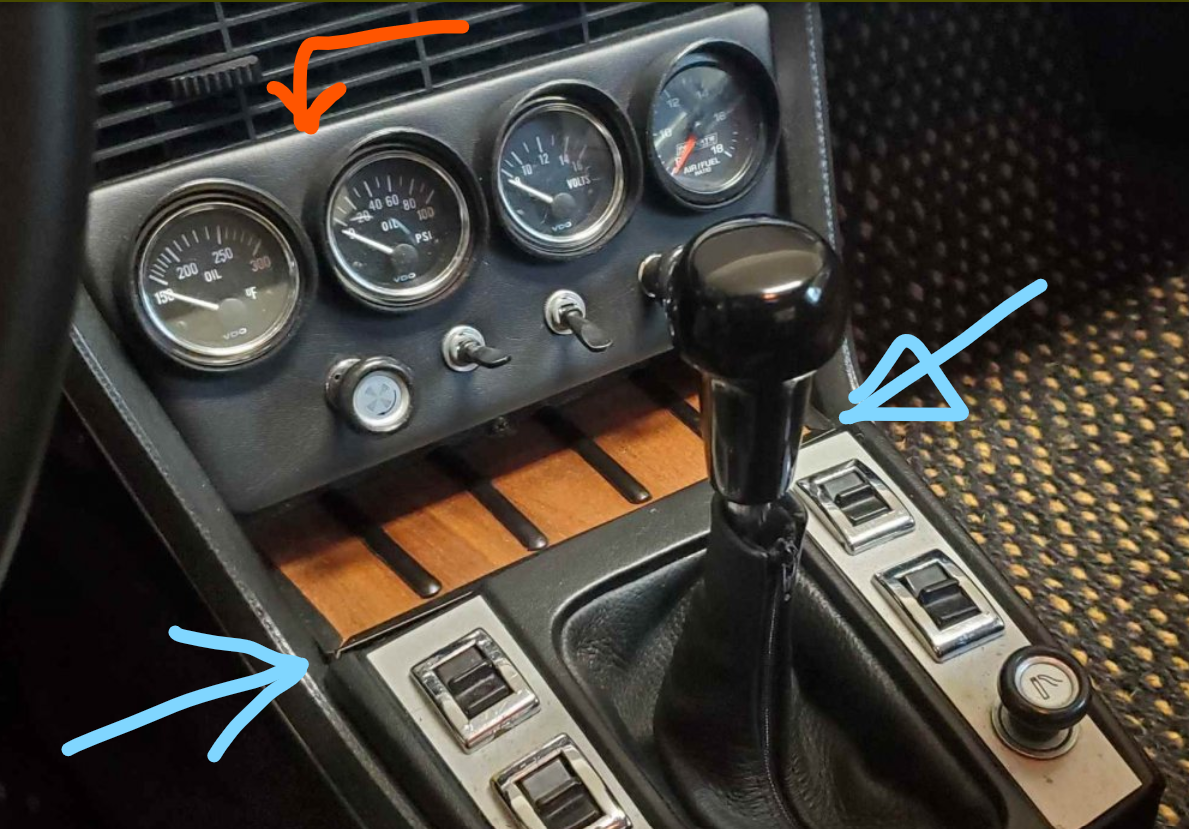 I got rid of the ashtray and fabricated a sheet steel face that would fill the front of the console top to bottom. I placed cutouts for the hazard switch (in its original location) and new oil pressure and volts gauges and stereo and other bits. I used VDO Cockpit series gauges. I found some nice looking vinyl that seemed to match the dash pretty good and bonded that to the sheet metal.