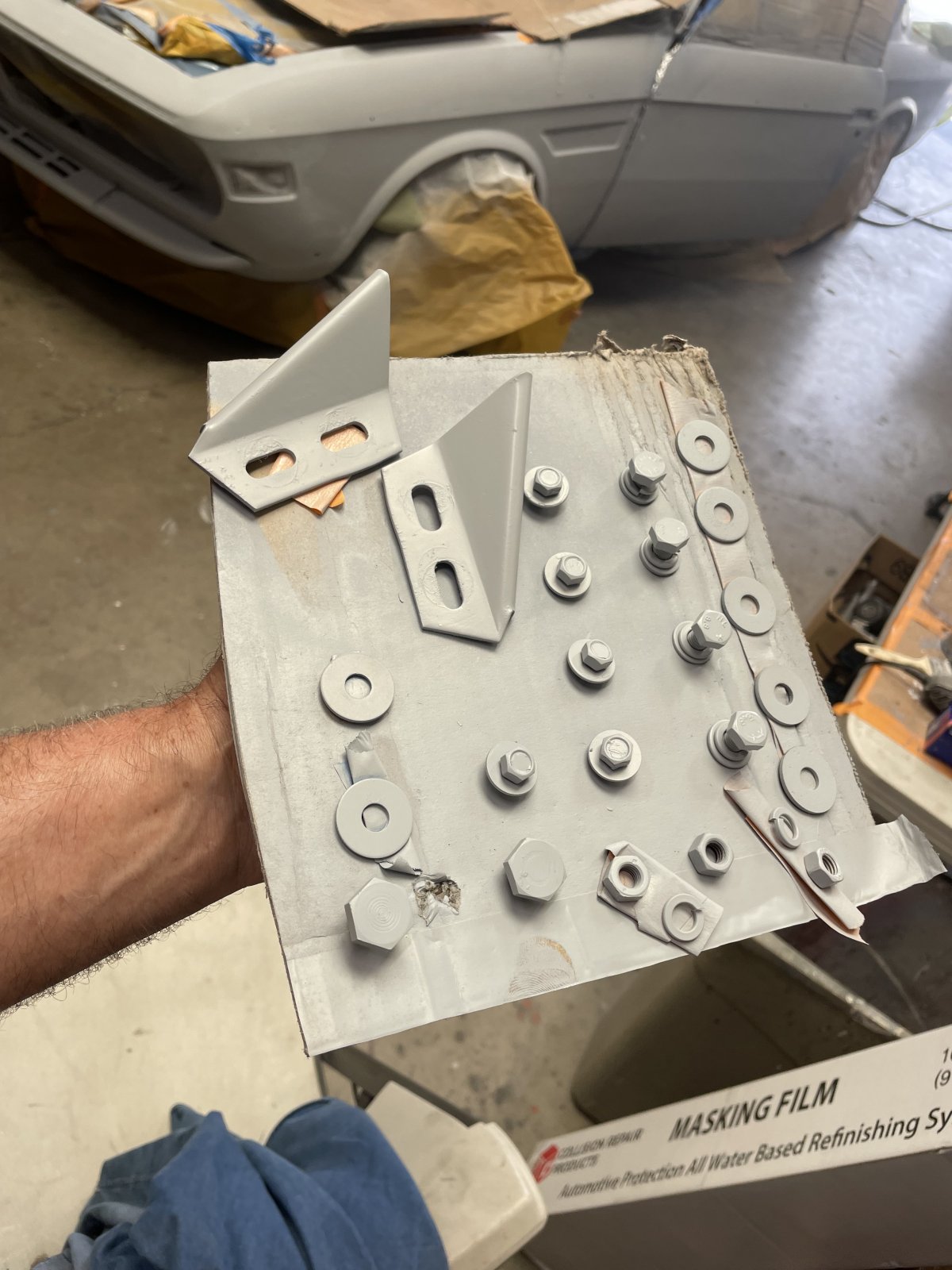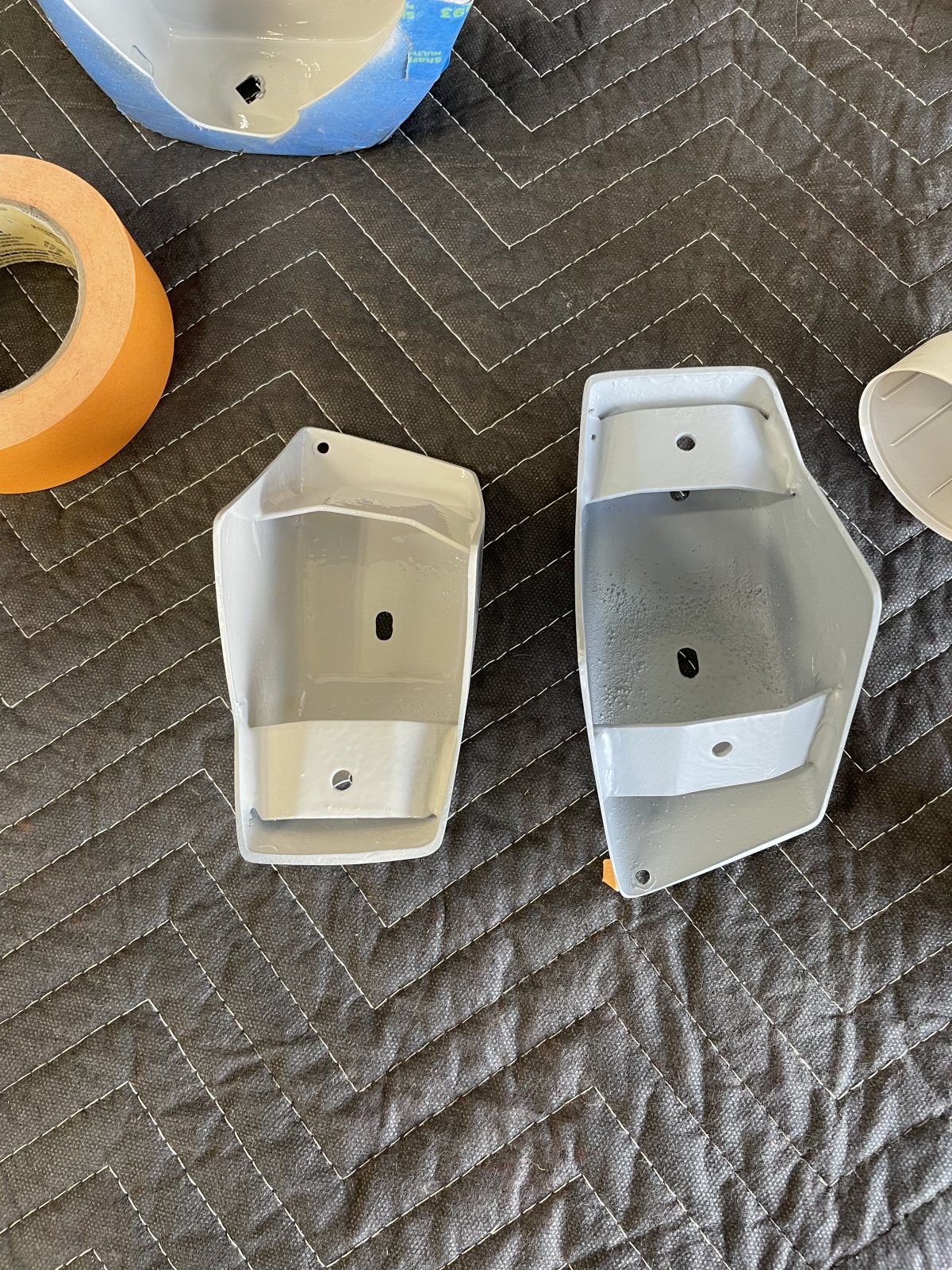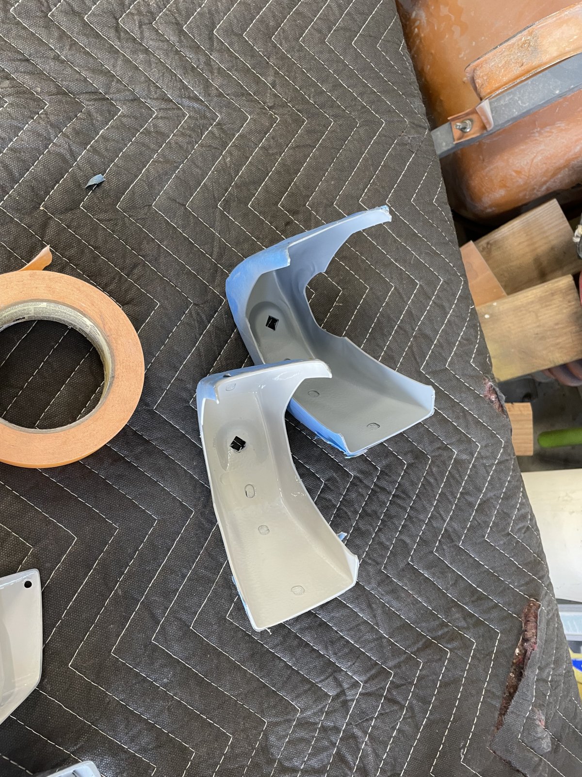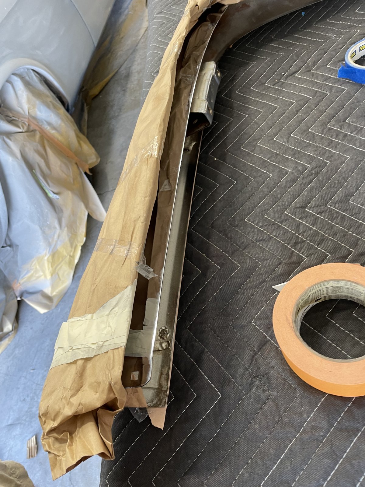 I am now waiting for a slot in the schedule for the paint booth, basically idling on other small projects before it goes in the booth. While all my spray equipment is still out and the primer table is in full swing, I decided to finish the bumper assemblies, a totally thankless job. The bumpers originally came with a taupe / warm grey paint on the inside surfaces to protect them from rusting. To recreate this I am using a two step process. First with some modern DTM primer to seal off all the inside surfaces. After mixing it, before it goes in the gun, I brush it on the back sides of the mounting plates in the inside, an area you cannot get to with a spray gun. The brush strokes sort of melt away once you spray the rest of the part. The second coat is simply a color coat with the closest color match to the original taupe color. All the bumper sections remain in their protective packaging masked right up to the edge.