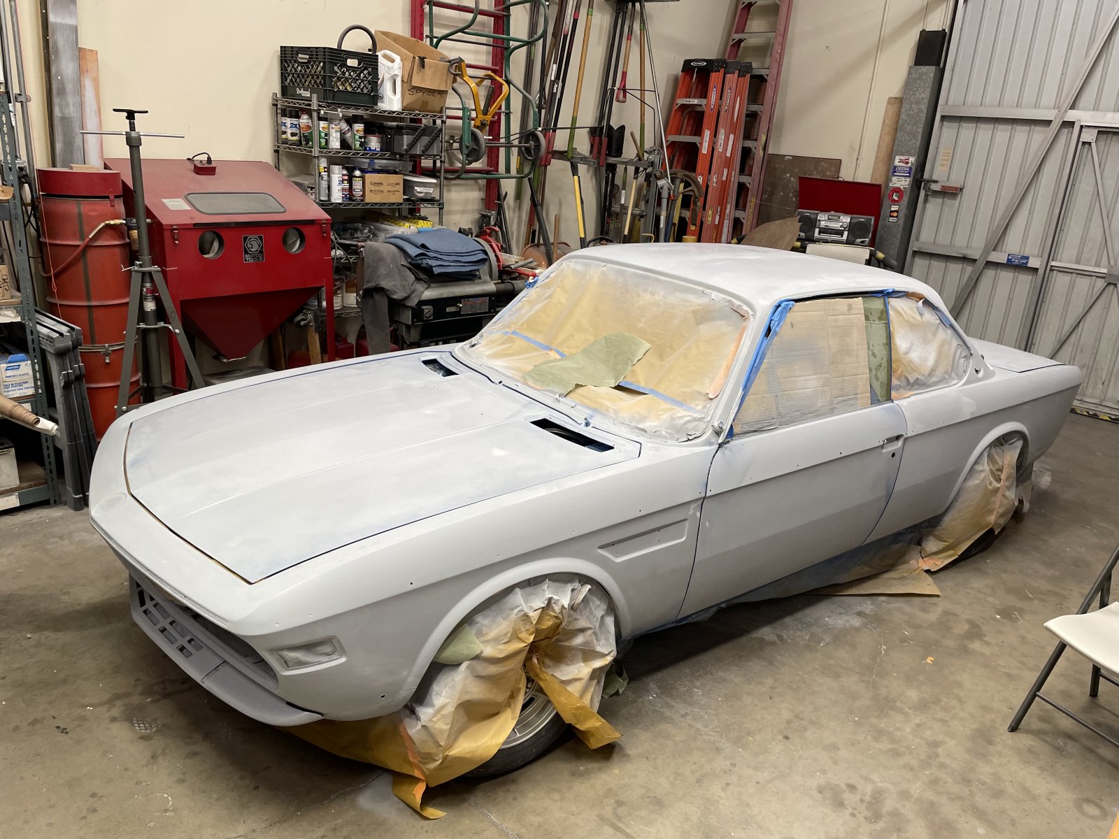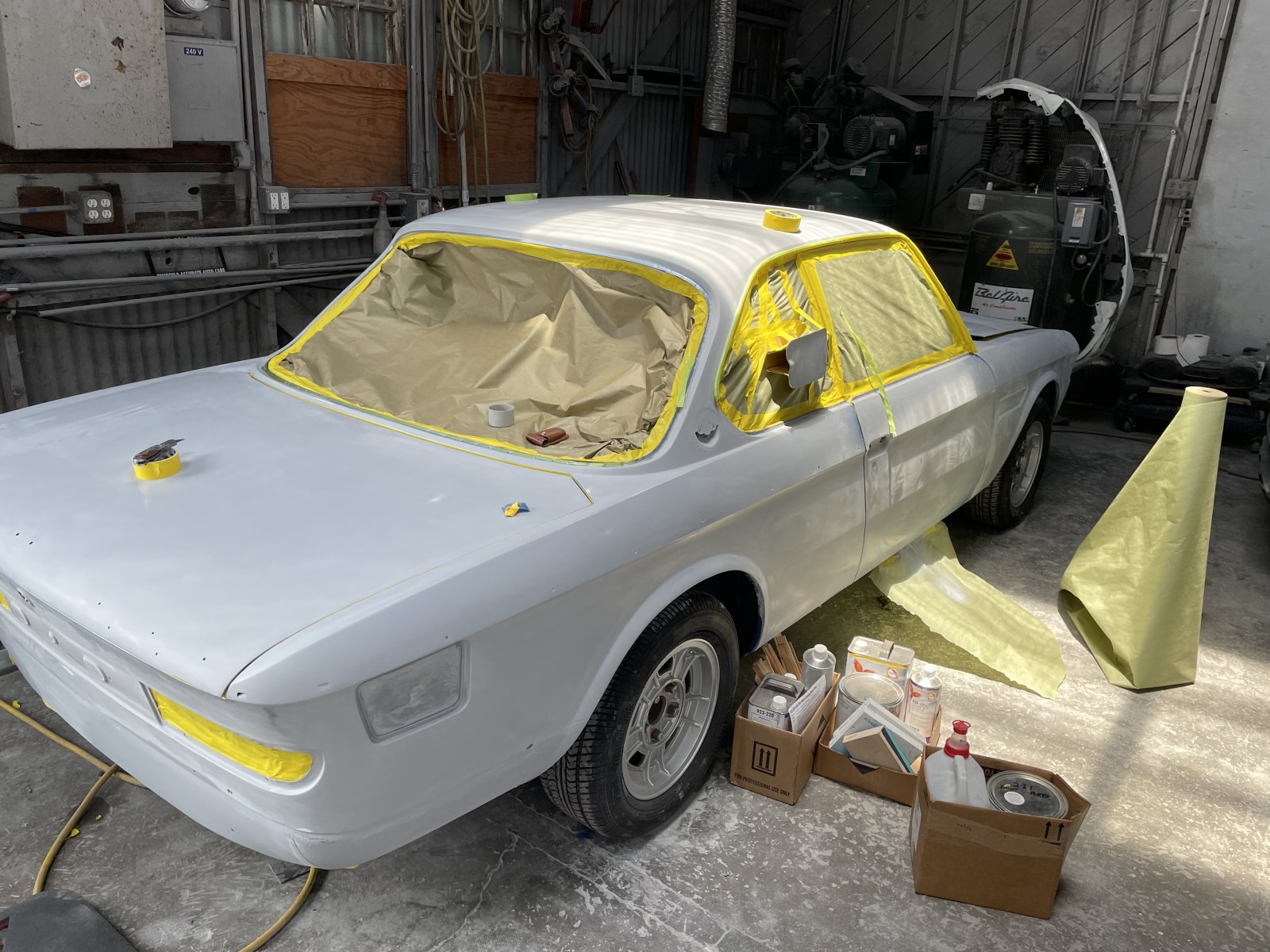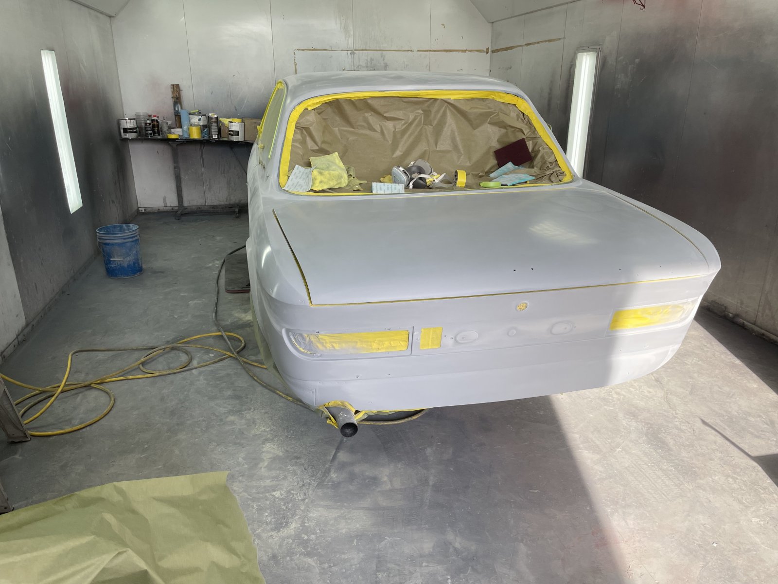 The car left the shop yesterday as a spot opened up for the paint booth. Here is the flatbed towing the Coupe to the undisclosed location. Upon arrival, the inspection by serious processionals had begun. After lots of scrutiny, it was decided to address four small low spot imperfections, and one high spot, with more bodywork and primer. I'd been starring at the panels for a month and had gone primer blind. Theses guys don't miss anything and I am oh so happy to be humbled, by professionals, while the car is in primer. That final prep and priming went quick. Todays remasking went on in parrallel and it was about 13 man hours as the entire car had to be covered with new paper and tape. Engine comp. under hood and under trunk are all taped off with soft edges. Tomorrow, it'll be a lite skuff on the primered spots and then booth cleaning, booth cleaning, filters, booth cleaning and then into the base coat and clear. Its water based so it is going to be a looooong day.
