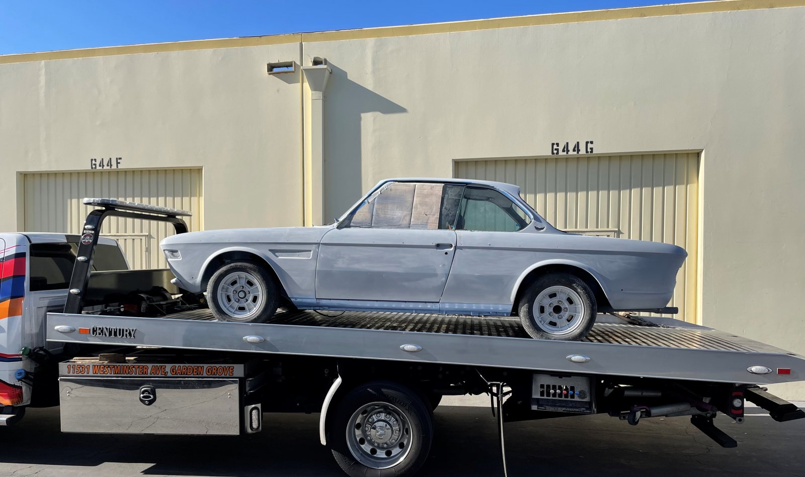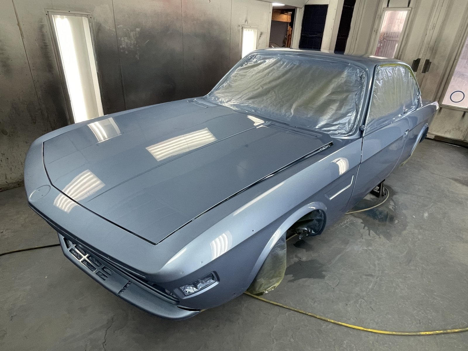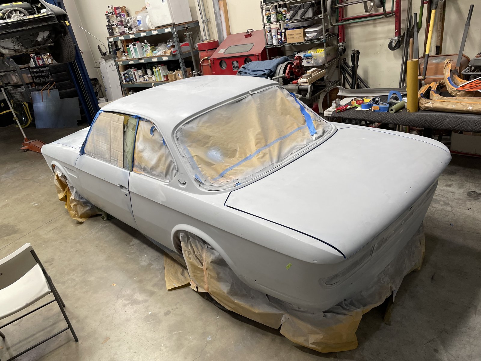 The car left the shop yesterday as a spot opened up for the paint booth. Here is the flatbed towing the Coupe to the undisclosed location. Upon arrival, the inspection by serious processionals had begun. After lots of scrutiny, it was decided to address four small low spot imperfections, and one high spot, with more bodywork and primer. I'd been starring at the panels for a month and had gone primer blind. Theses guys don't miss anything and I am oh so happy to be humbled, by professionals, while the car is in primer. That final prep and priming went quick. Todays remasking went on in parrallel and it was about 13 man hours as the entire car had to be covered with new paper and tape. Engine comp. under hood and under trunk are all taped off with soft edges. Tomorrow, it'll be a lite skuff on the primered spots and then booth cleaning, booth cleaning, filters, booth cleaning and then into the base coat and clear. Its water based so it is going to be a looooong day.