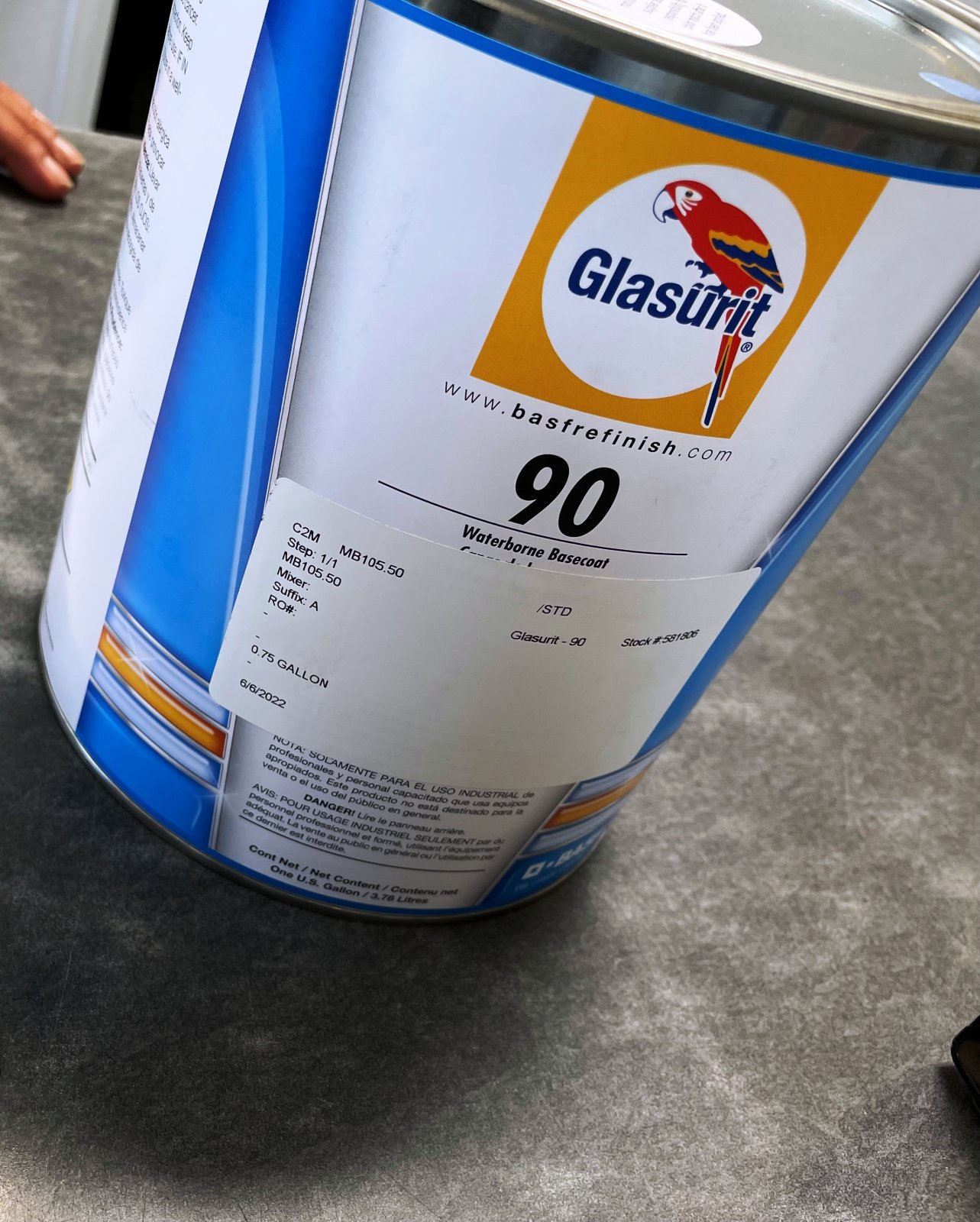 This is Glasurit's 90 line. Fully compliant in California and proud. It has the same tiny metallic flake as the original BMW paint and does not look like 'metal flake'. It goes on very evenly when applied in very restrained thin coats. We put down four coats today. It was ideal in terms of temperature -about 80F and very dry. Even with that ,after the fourth coat, we let it sit for three hours to bake out the rest of the water.