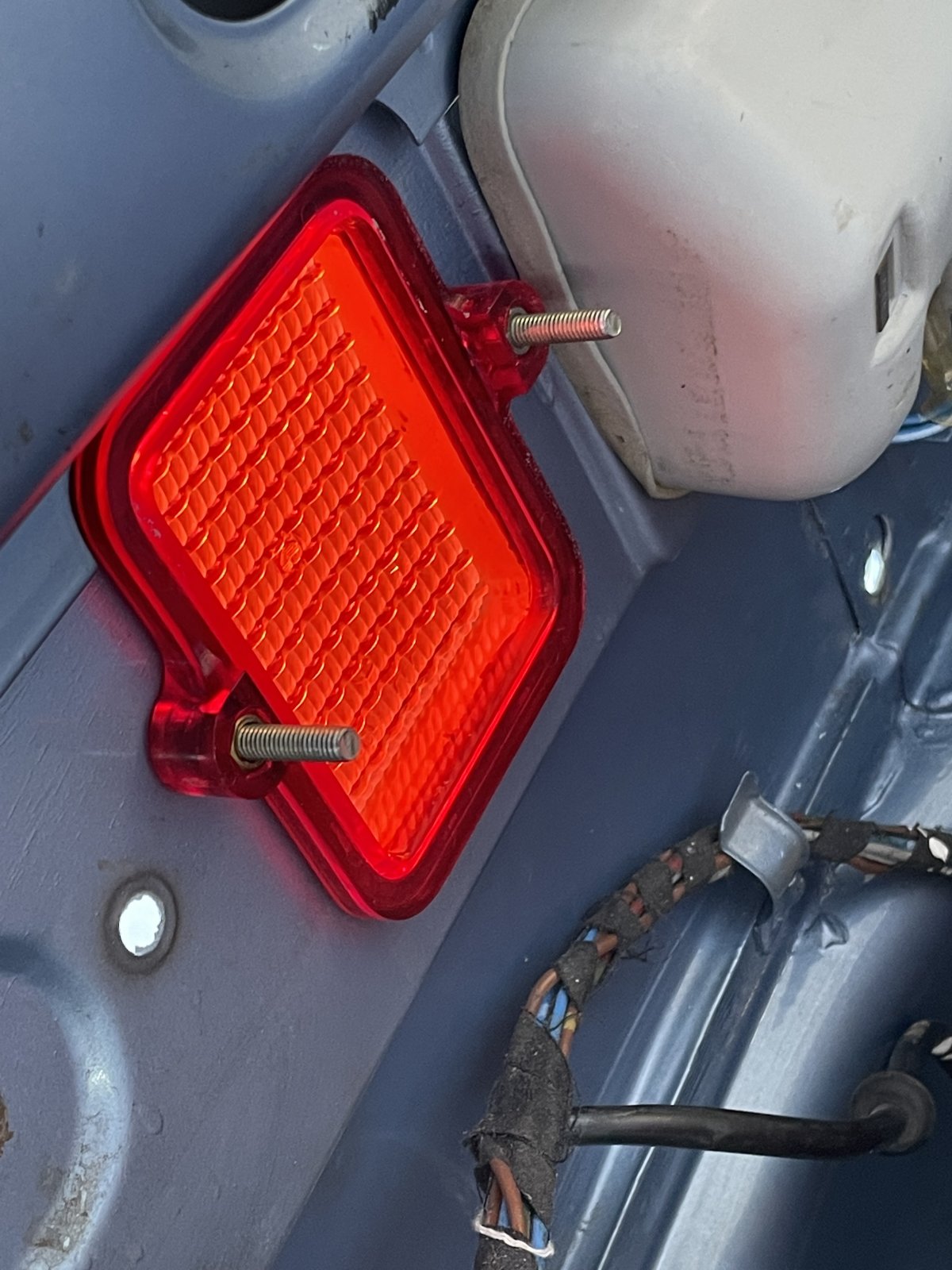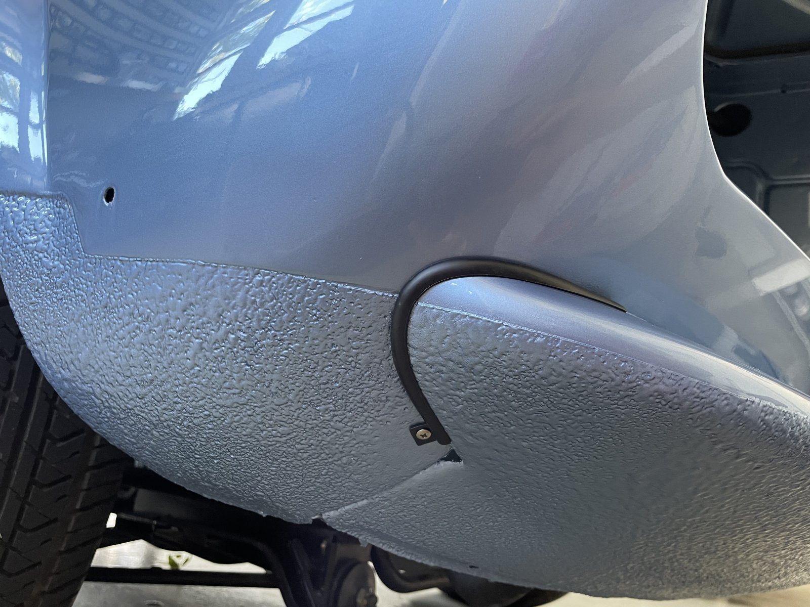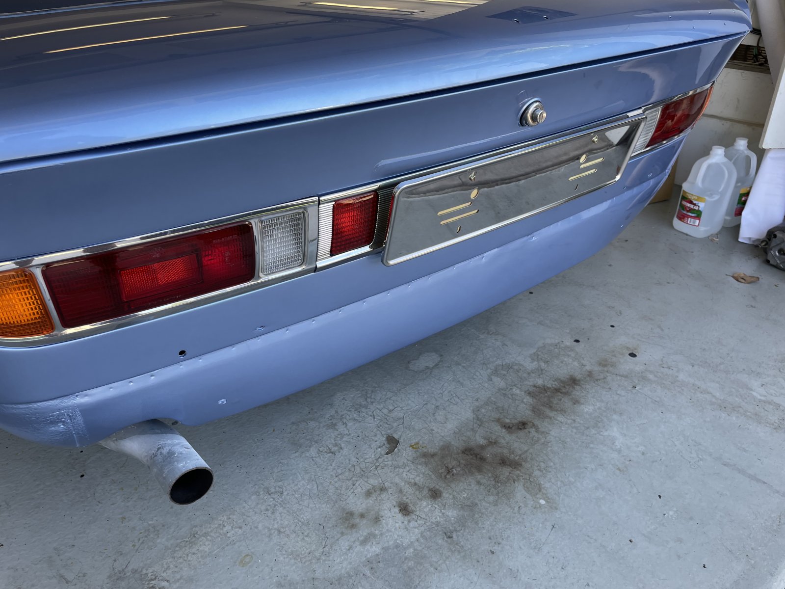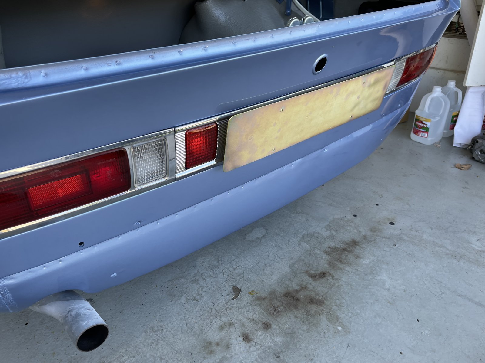 I know, I know, the black out at the "C" pillar is not stock. I think leaving this body color simply looks like overspray. I could not resist. Gas door alignment is a PITA, but now its in the bag. Euro plate mount after gold zinc plating. Euro plate will get covered with the Calif. blue plate. Fog lamp is going to require more work to make a cut out in the hard board rear wall panel.