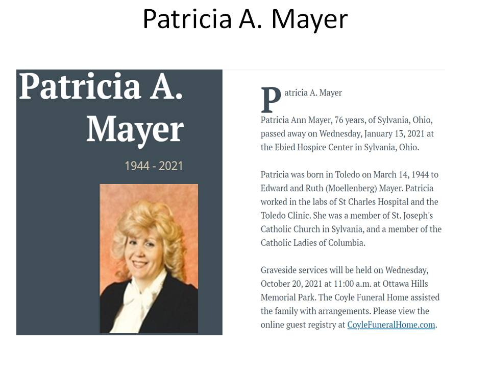 two Patricia A. Mayer's who recently passed away in the Toledo area. Here is the one that has the matching address in the original owners manual. See attached. This research continues today as I am hell bent to find out more about Patricia's life story.