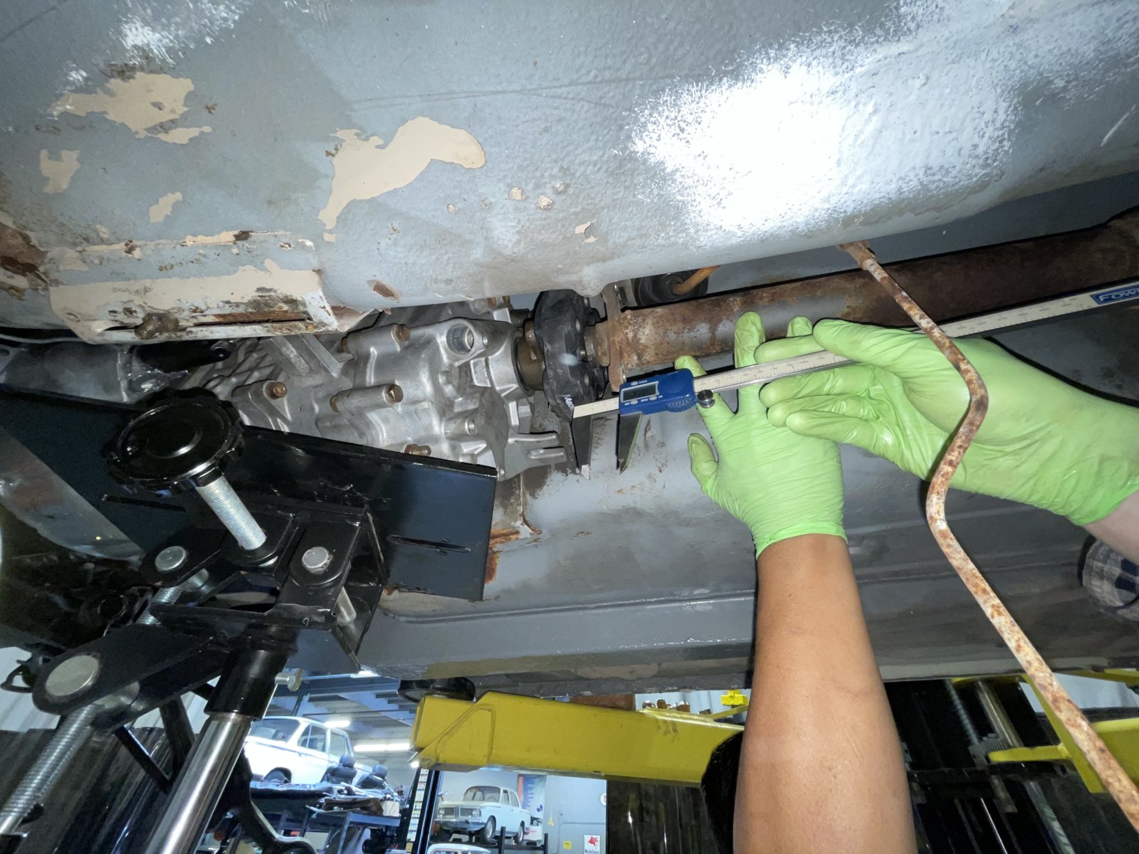 Image two, slowed us down. We did a quick re-installation, this time with the Getrag 265 attached to the engine (see image 6). This was to finalize what the new guibo depth was, holding up the original (auto drive shaft). This got us the exact dimension we needed for the lengthening this driveshaft - an item that is the longest leadtime for this project. It goes out in the morning for lengthening and a full rebuild and balancing.