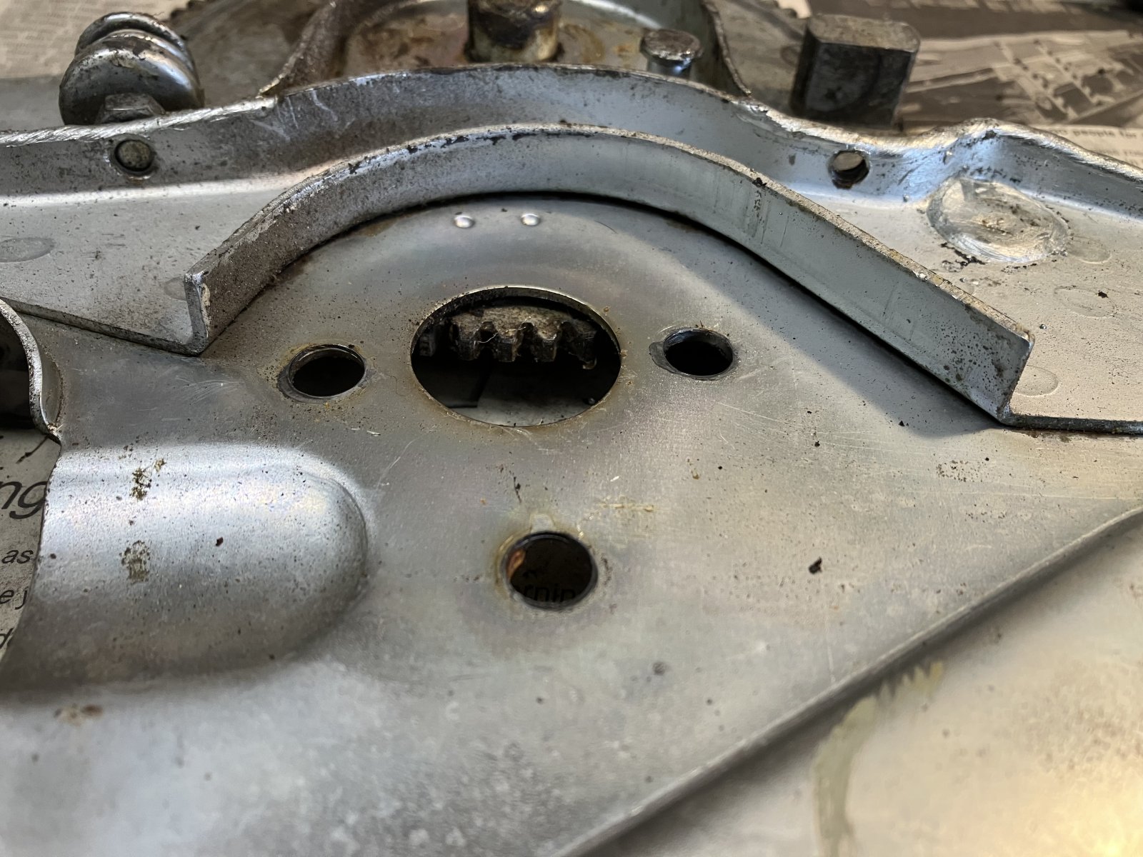 I recall posting a thread that addressed the necessary modifications to the rear regulator sheetmetal, but for the life of me, I can't find it now. In summary, the rears are similar to the fronts, in that you need to re-shape the cut-out that accepts the motor for the shape and location of the e28 motor. Additionally for the rears, you will need to cut off some sheetmetal - what HB Chris refers to as the "ridge" - that is present on the rear regulator (not clear to me what it's purpose was). The following photos show this: