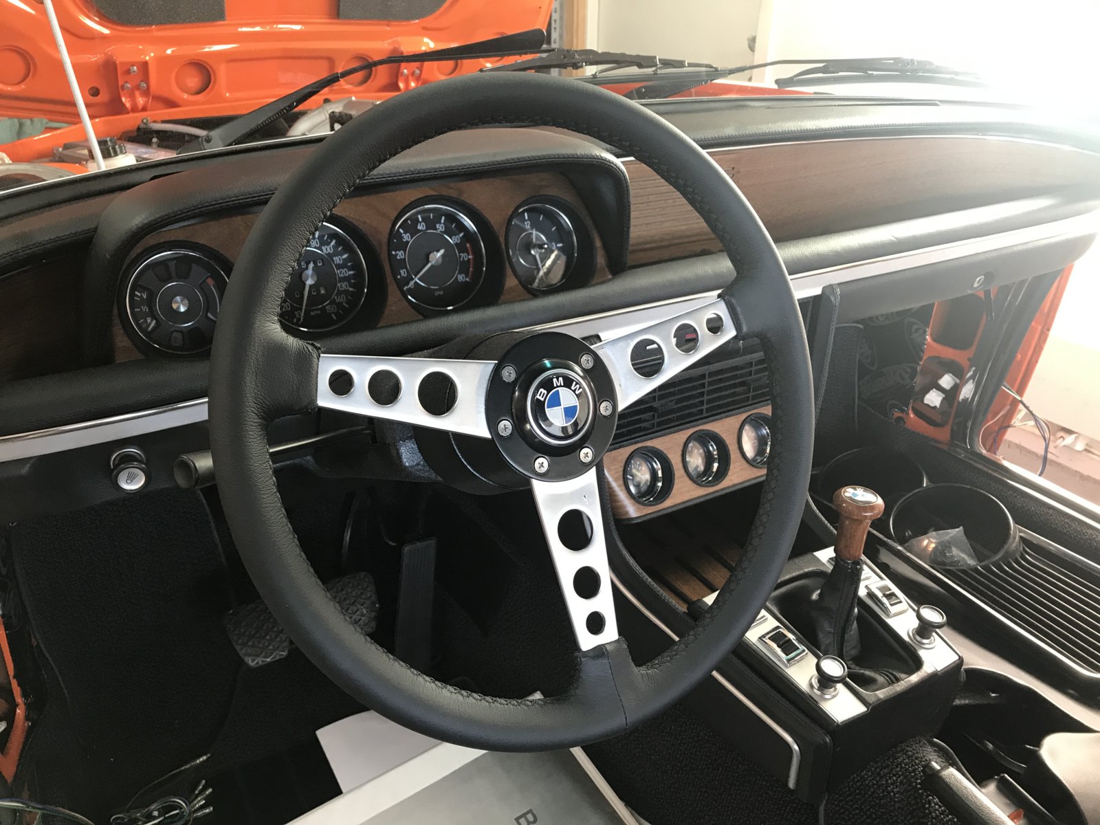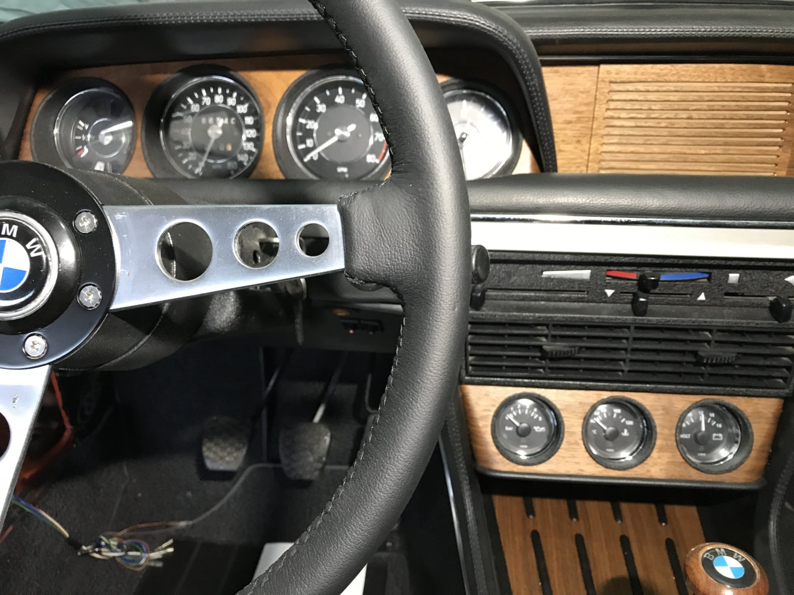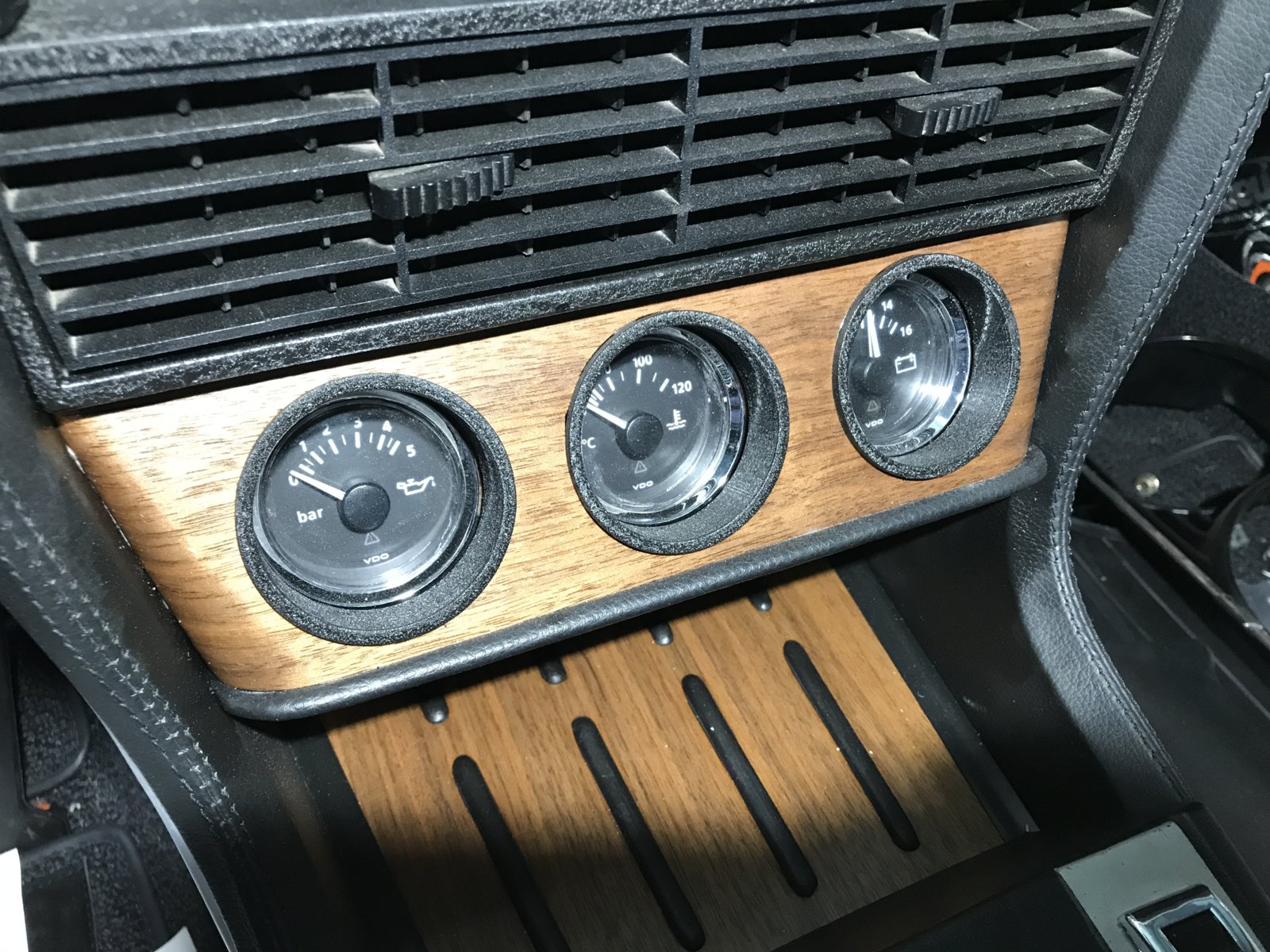 This is how I solved the need for some extra engine surveillance. The basic idea was to make it as close to original instrument layout as possible. The gauges are angled in the same way as the main cluster even if it is located further down it helps the driver to get a better view of the situation. This is a car without AC and the console is almost vertical at this point unlike the ac version. The rounding of the ends makes it easier to angle the instruments towards the driver without the bottom of the bracket protruding outside the console.