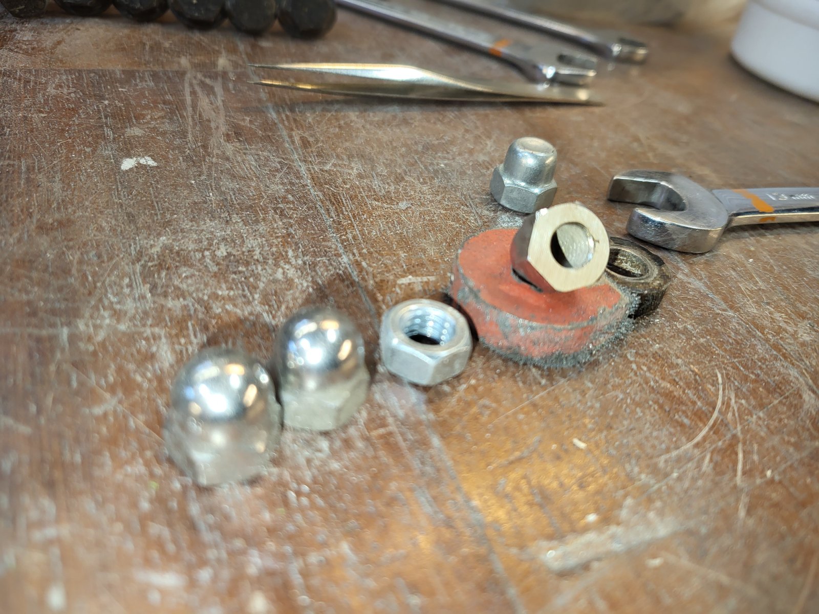 In my pictures on my wooden table are also 2 stainless domed nuts, these are clearly a bit more grey. Also 1 simple zinced nut and a zinced domed nut ( with it's cap smashed in) for color reference - these are clearly more dull. These other parts are distinctly different in color vs the 6 domed nuts on my car.