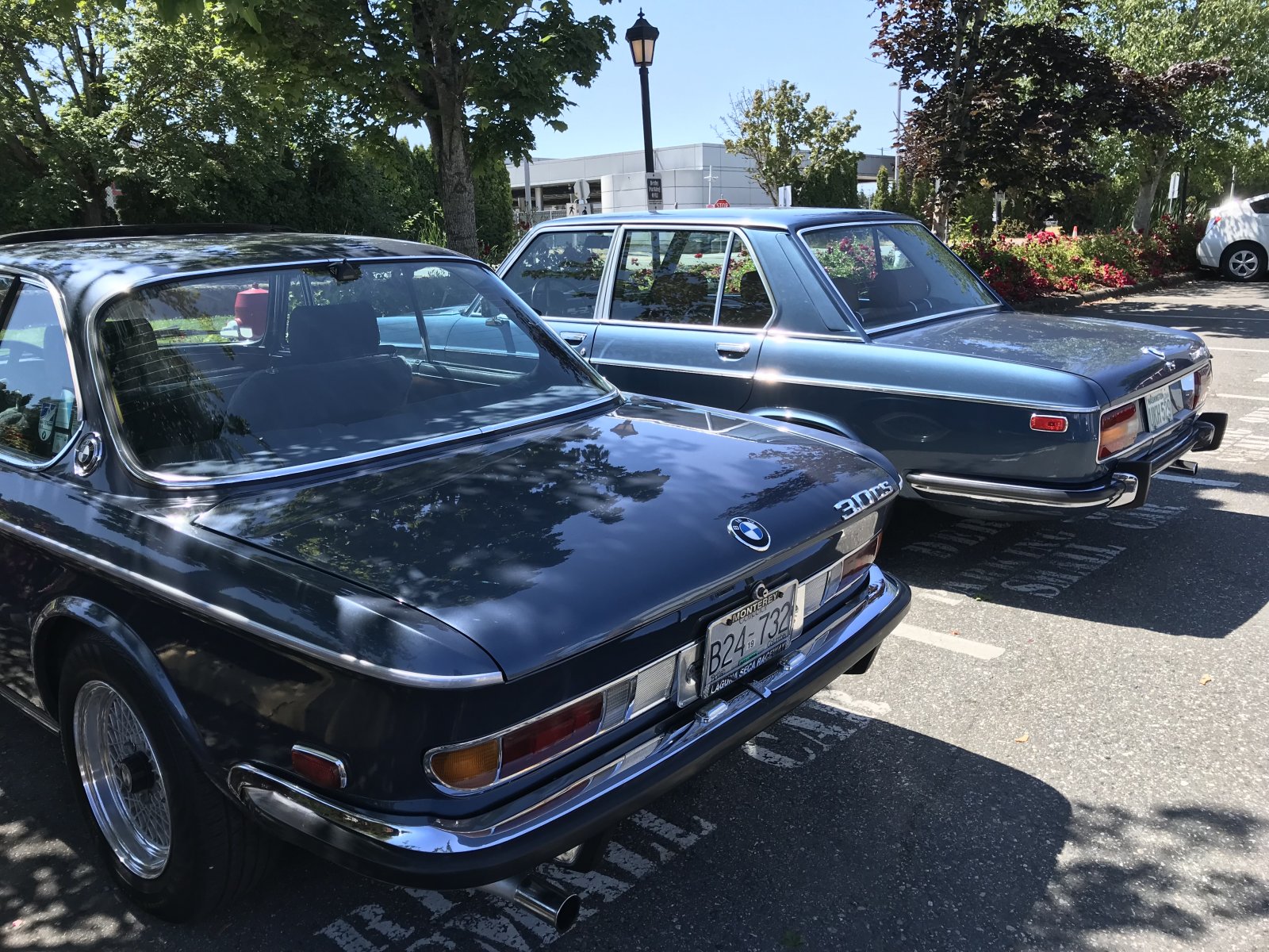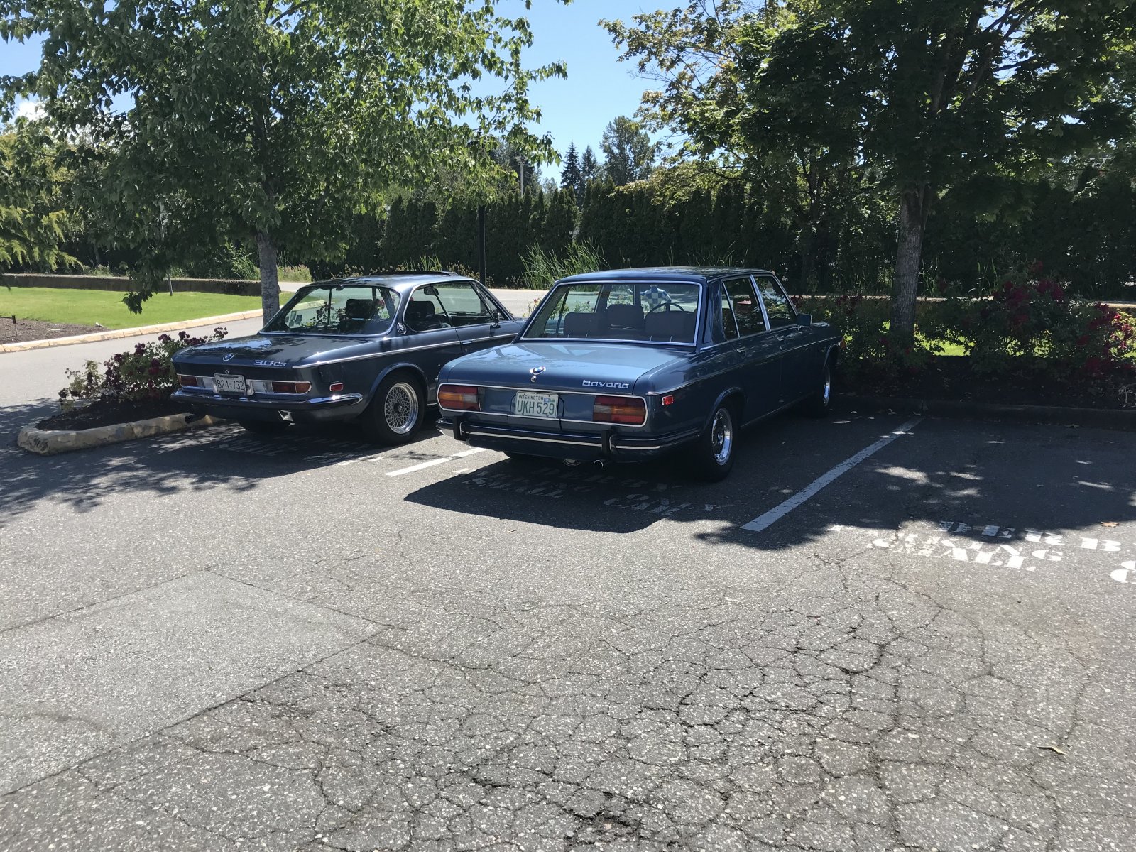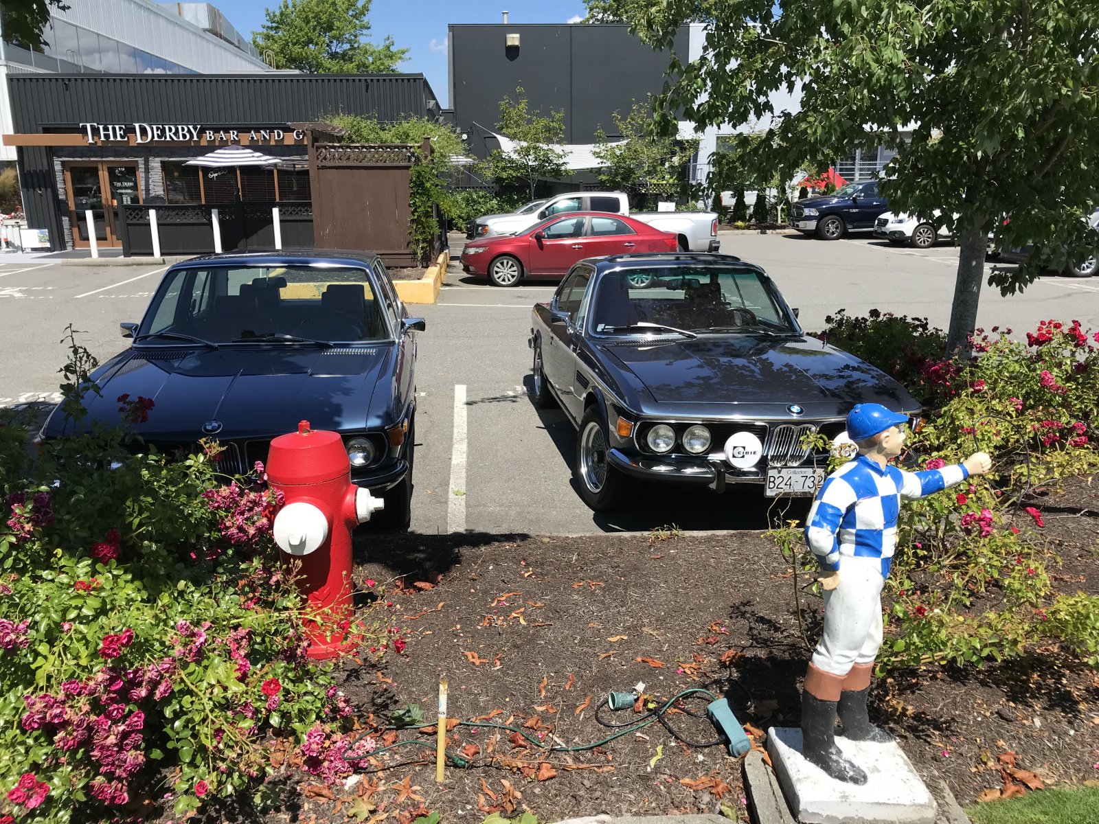 Drove to the 1st International PNW Baikal Bimmers luncheon! Spur of the moment thing. Member Dick Steinkamp has been rather bored, lately, well, being between projects and all. I suggested we meet up for lunch somewhere between his residence in the US and mine in Canada. Agreed on a spot located steps from the Washington State/British Columbia border. Called the Derby Bar and Lounge, had a horse racing theme, couple dozen TV screens showing horse races guests could place bet on. Hmmm, interesting theme. Dick and I, we just brought our M30 Horsepower! lol. really nice drive. I experienced a lovely 22C while Dick enjoyed a balmy 71.6F, well, once he got back over the border. Great drive, great discussion, mostly how we both wish we could buy Bill's E3 for sale right now in Edmonton, or the early RHD E3 for sale now also on the Forum. Did I mention Dick needs a new project? Each E3 and E9 loved the drive, and next time, I think it's Fish and Chips in Blaine! Thanks for coming North Dick! Mike