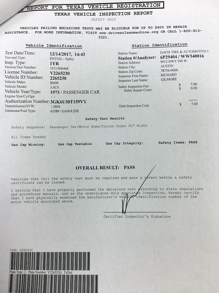 I installed some new tires, fixed my lights and horn, and got the CSi through its state safety inspection (well, yesterday actually).
