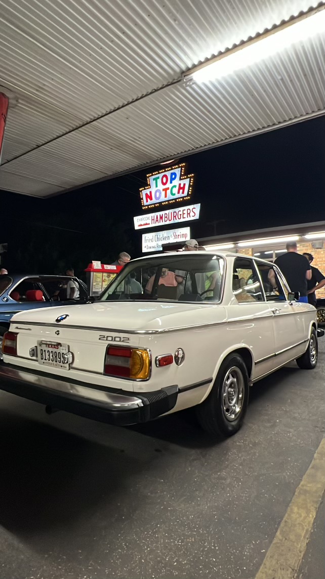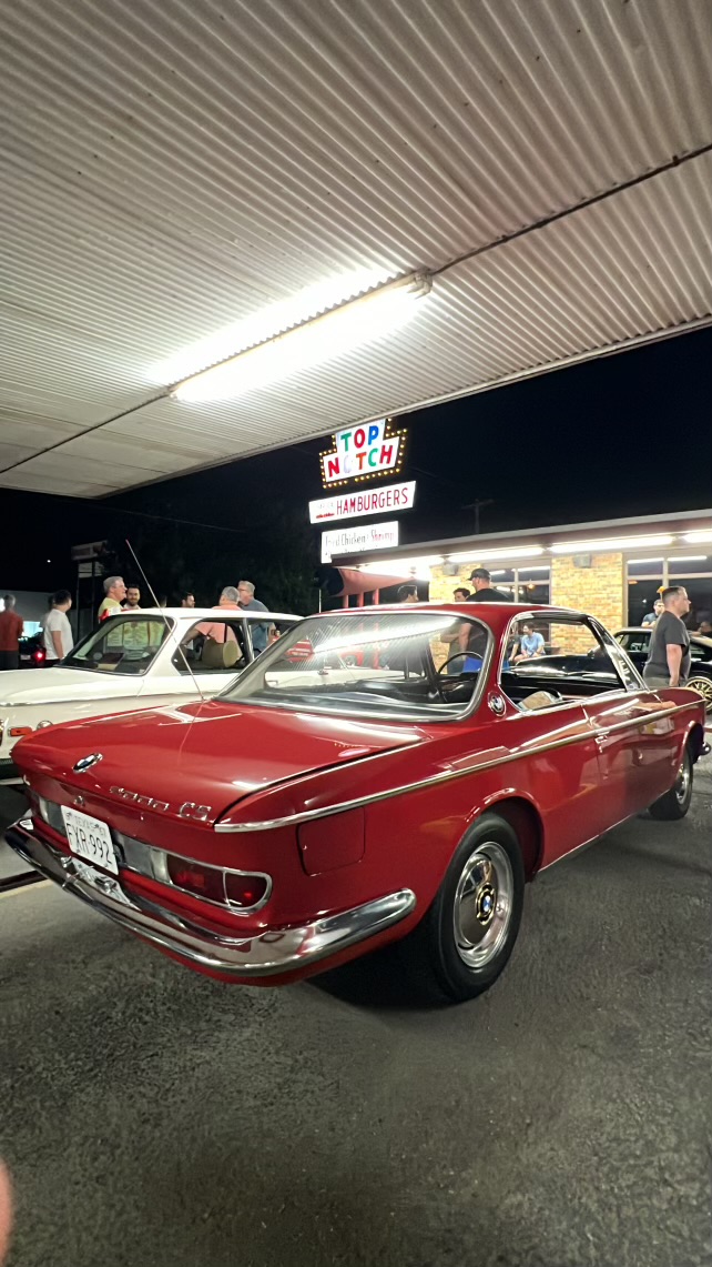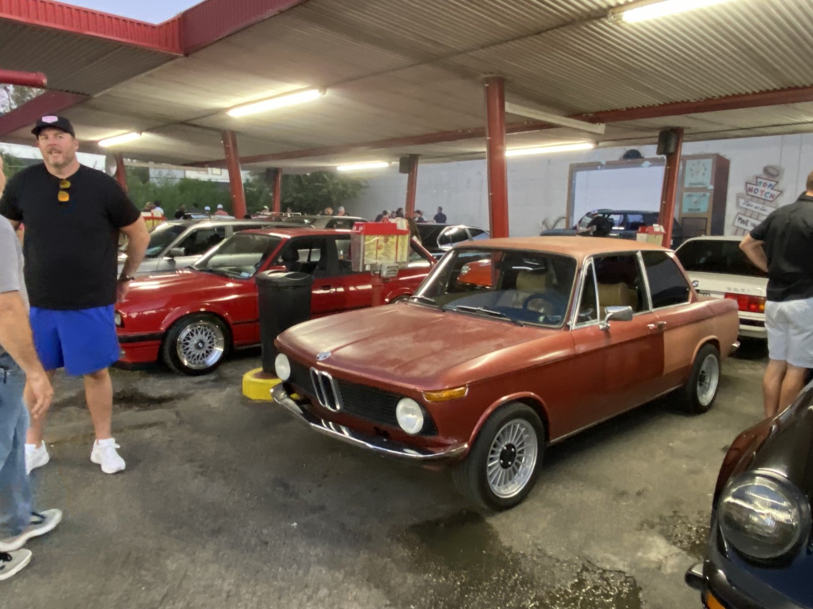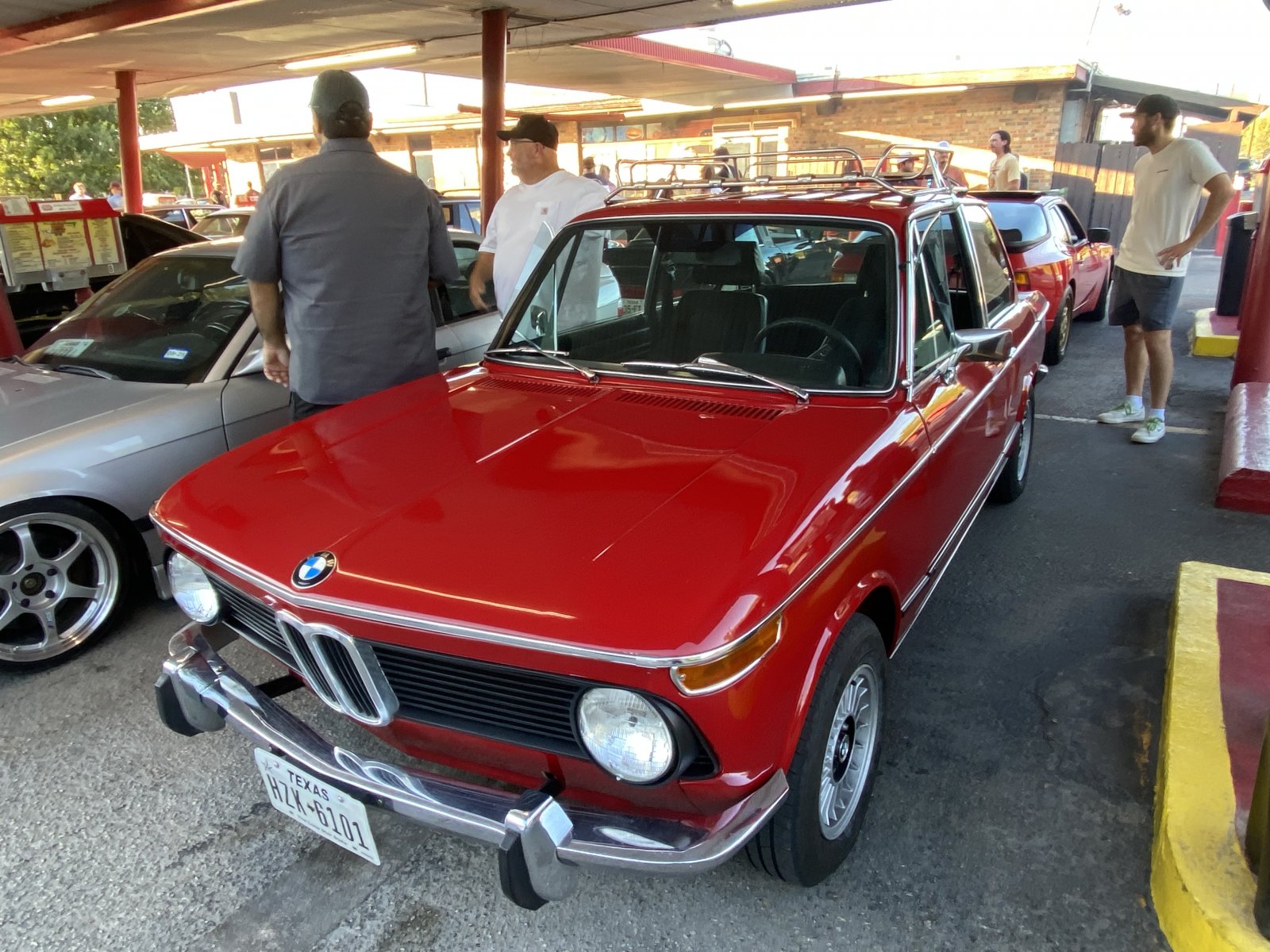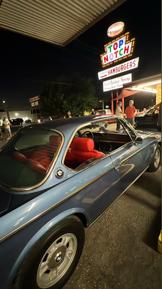 pre-1990 German car night at a local Austin hamburger joint called top-notch, They set up a little bar and sell beer at night for the get together… we had a good showing of BMWs… Ed Zinsmeyer brought his 67 Granada red CS…my son Kane’s Granada red 2002 with the rack.