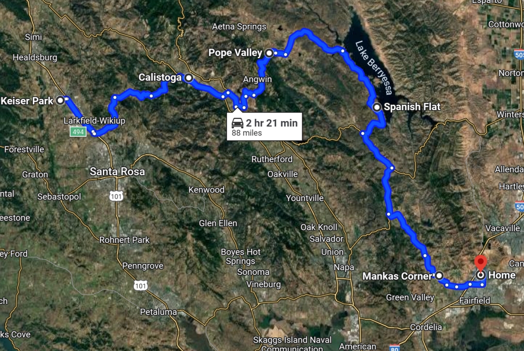 I've done half that ride on my bicycle!! Although I started in Calistoga, rode up to Berryessa, and then back to Pope valley, and did Ink Grade from Pope Valley to Angwin. That is some beautiful road!
