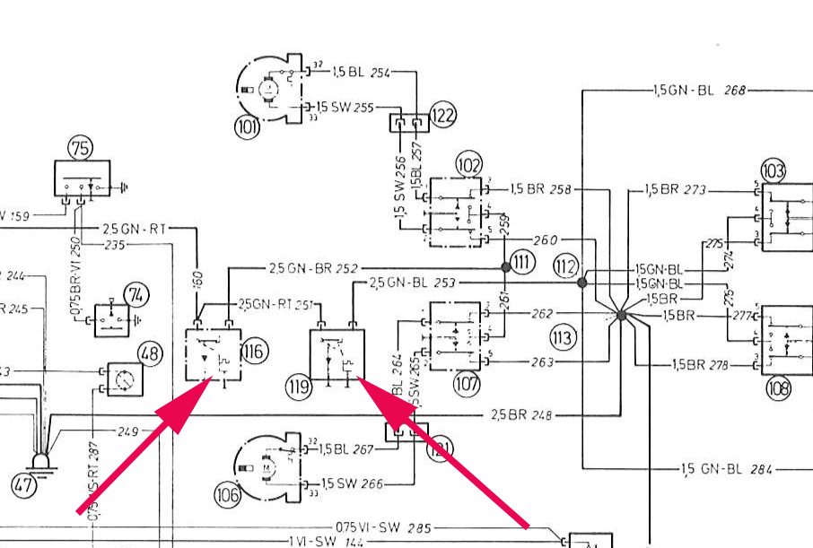 74 Wiring Diagram displays 2 boxes (relays) number 116 and 119 (see photo).