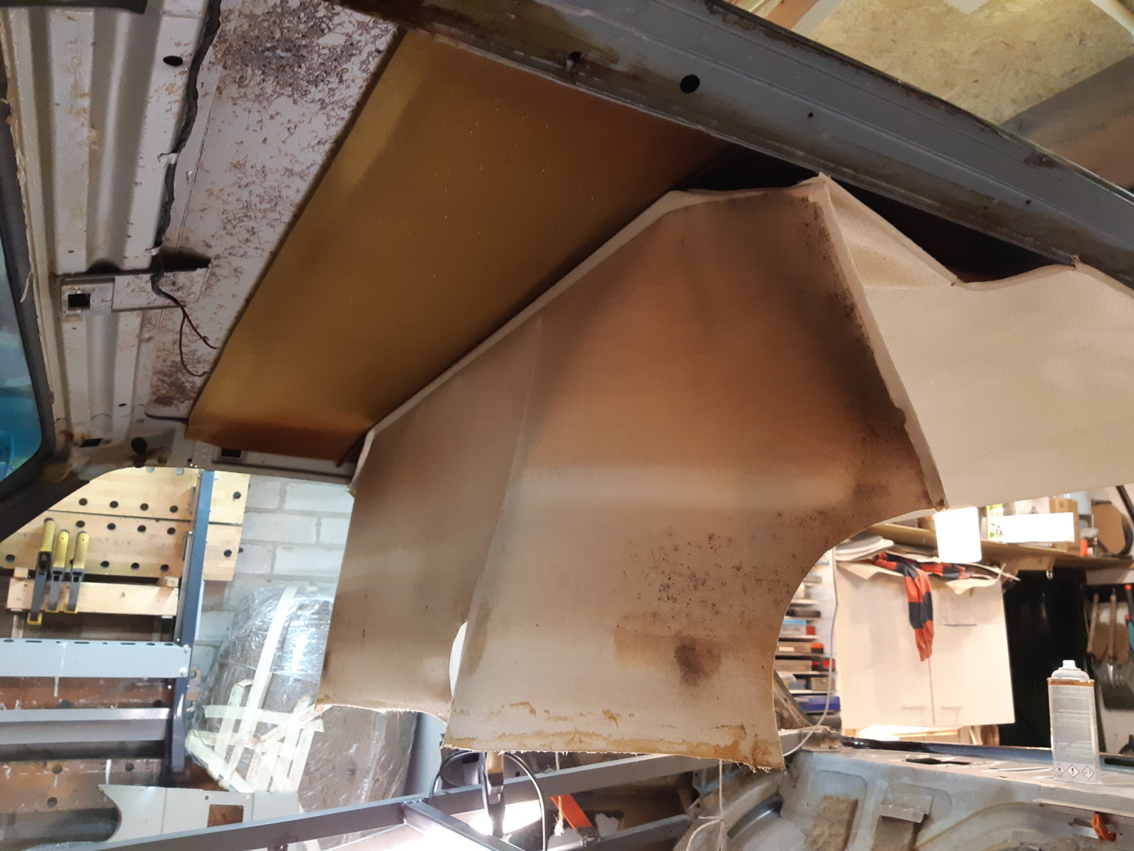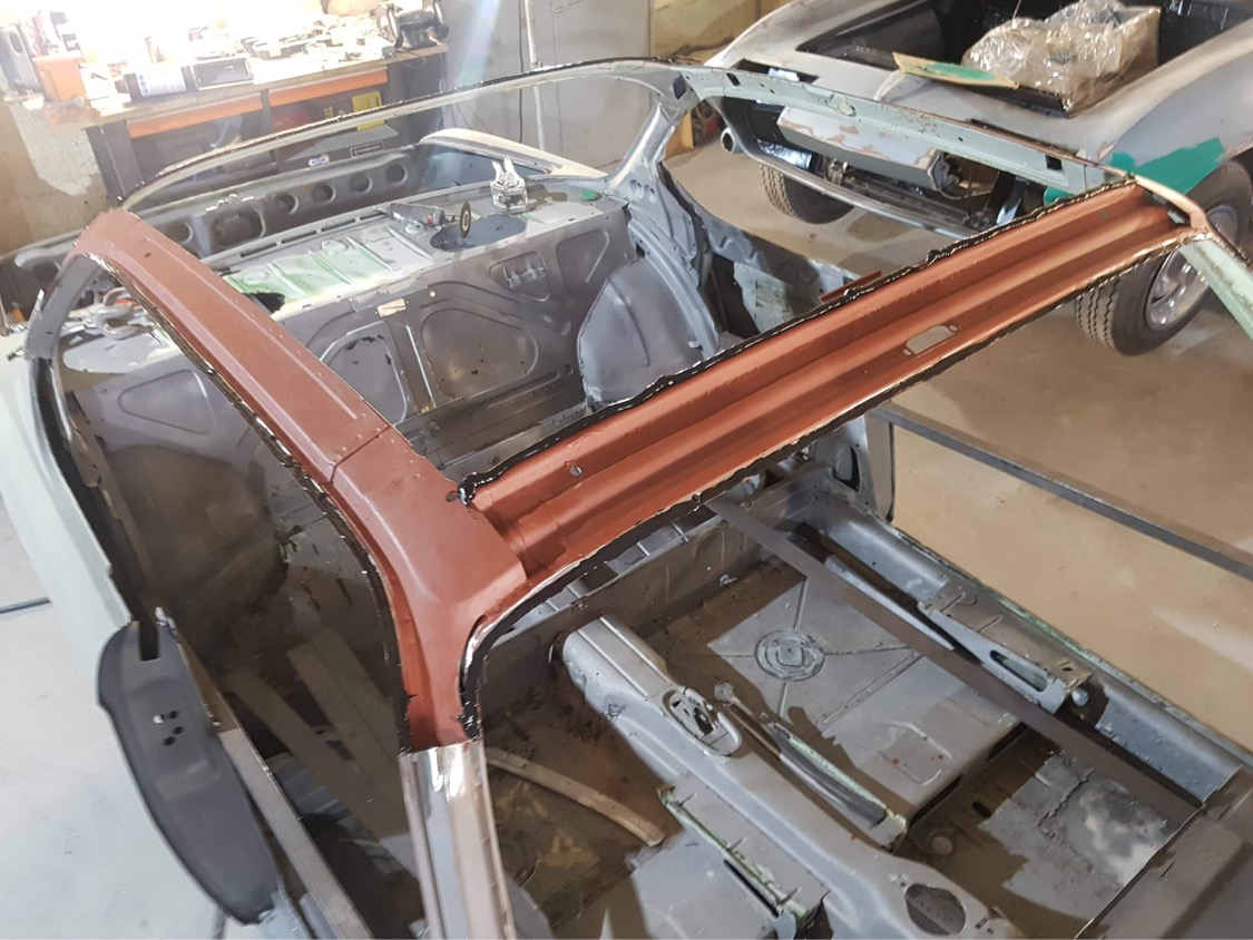 The factory did rust protection only to the areas, where they could reach any surface after the roofskin was attached to the car allready. So really ZERO rustprotection on the top surfaces of the frame and ZERO rustprotection on the underside of the skin. In between they applied some foam as bearing, that was collecting humidity as hell. So this construction ended up in a perfect playground for our old brown friend ....